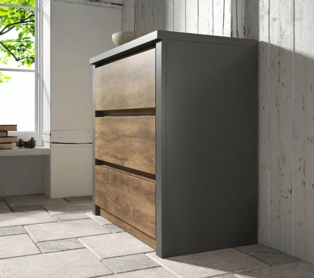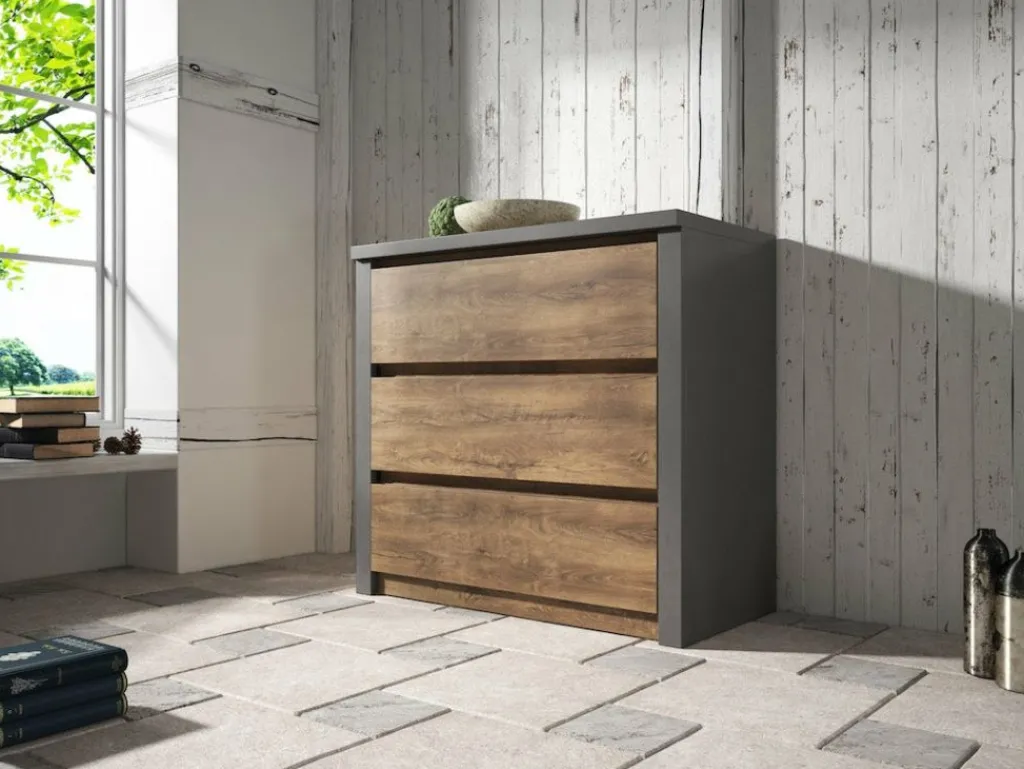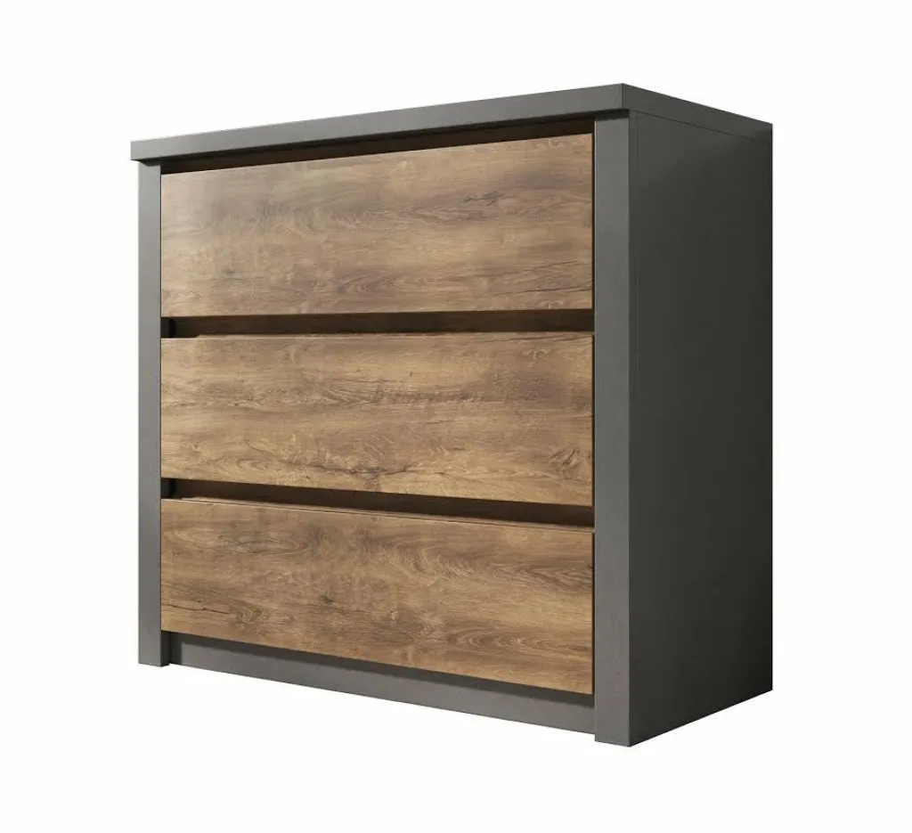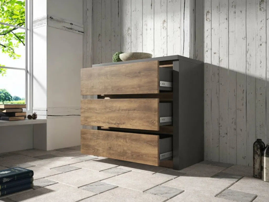 Dressoir Monaco is een robuuste en opvallende designkast met veel opbergruimte. Dit meubel is afgewerkt in een neutrale, maar warme eiken kleur in combinatie met een stoere mat grijze ombouw. De kast beschikt over 3 grote lades over de gehele breedte.