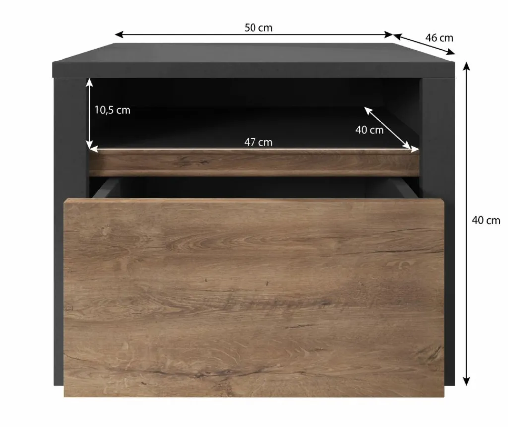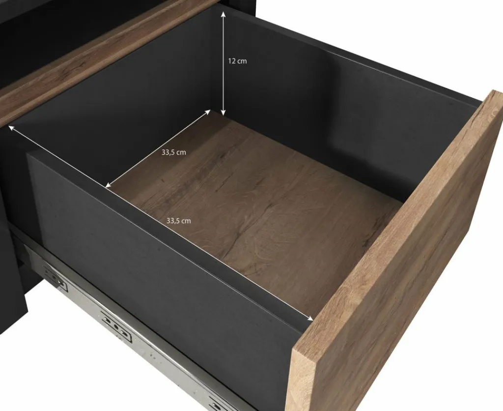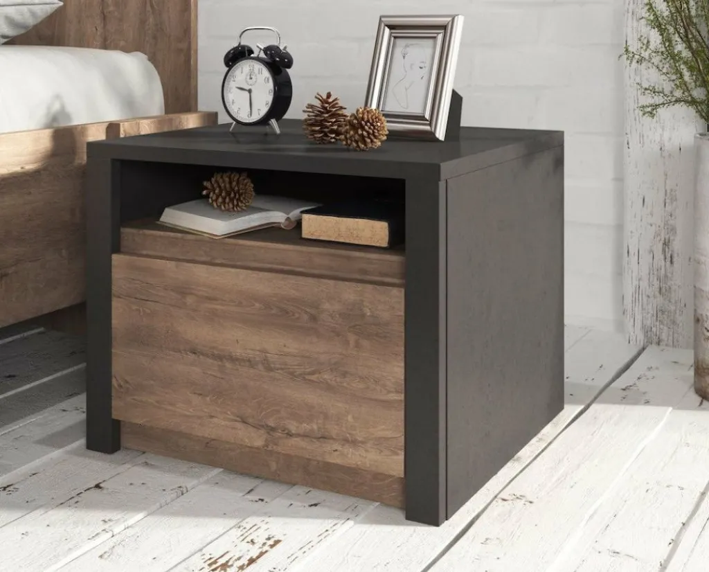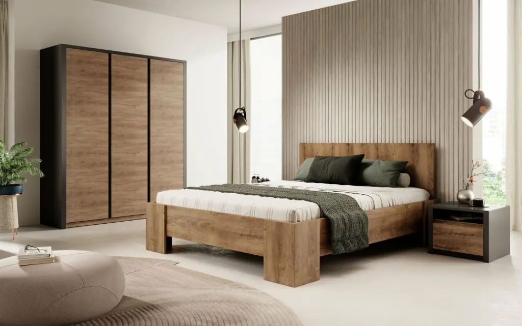 De Monaco slaapkamer straalt rust en eenvoud uit, met een moderne twist. De warme eikenhoutlook en strakke grijze accenten zorgen voor een stijlvolle combinatie die makkelijk te integreren is in elke slaapkamer. Deze set biedt een complete basis voor je interieur: een tweepersoonsbed, twee nachtkastjes en een ruime kledingkast in dezelfde afwerking.