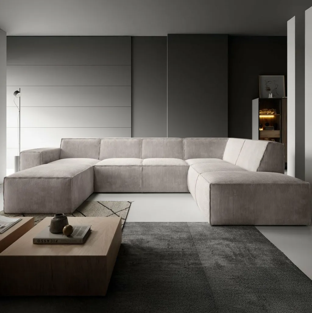 Hoekbank Monet XL is een royale loungebank met plek voor 6 tot 7 personen. De bank is uitgevoerd in een zachte ribstof in beige kleur en heeft een moderne, uitnodigende uitstraling.