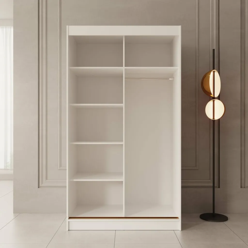 Achter de deuren bevindt zich een overzichtelijke indeling met een legplank en een kledingroede over de volledige breedte. De kast biedt voldoende opbergruimte voor kleding, schoenen en accessoires. Dankzij de schuifdeuren blijft de kast praktisch in gebruik, ook in kleinere slaapkamers.
