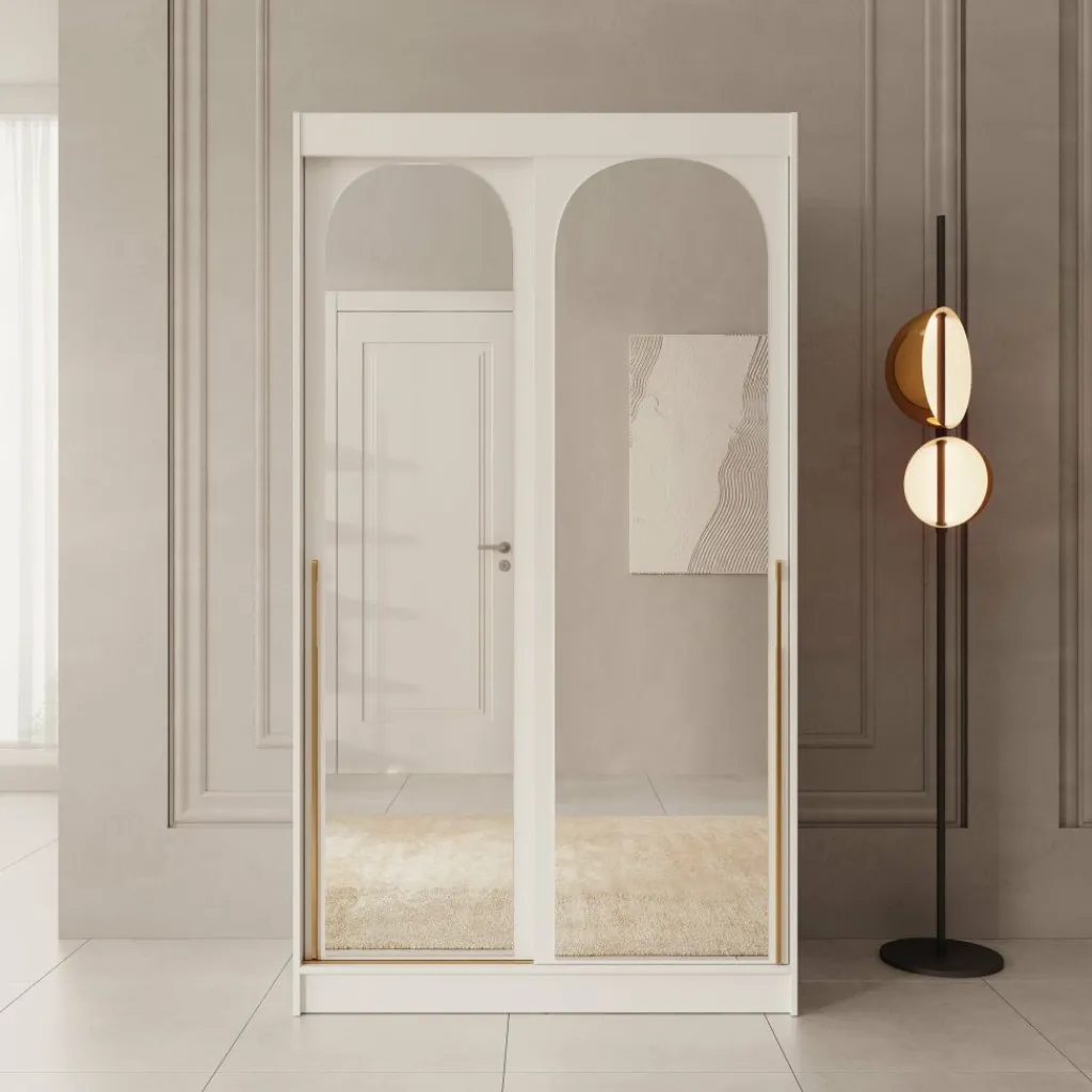 De Moniq kledingkast in wit heeft een frisse en neutrale uitstraling die goed past bij verschillende interieurstijlen. De twee schuifdeuren met spiegelpanelen zorgen voor extra licht in de kamer en laten de ruimte optisch groter lijken.