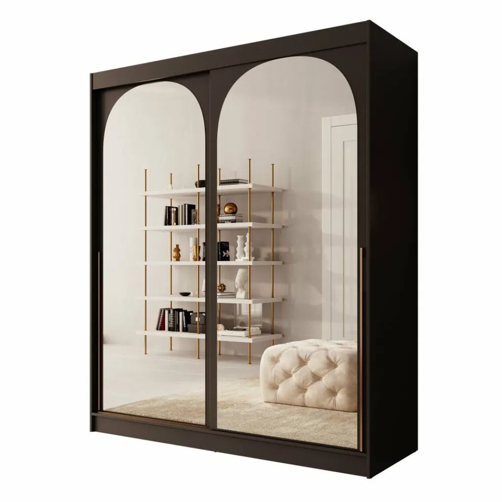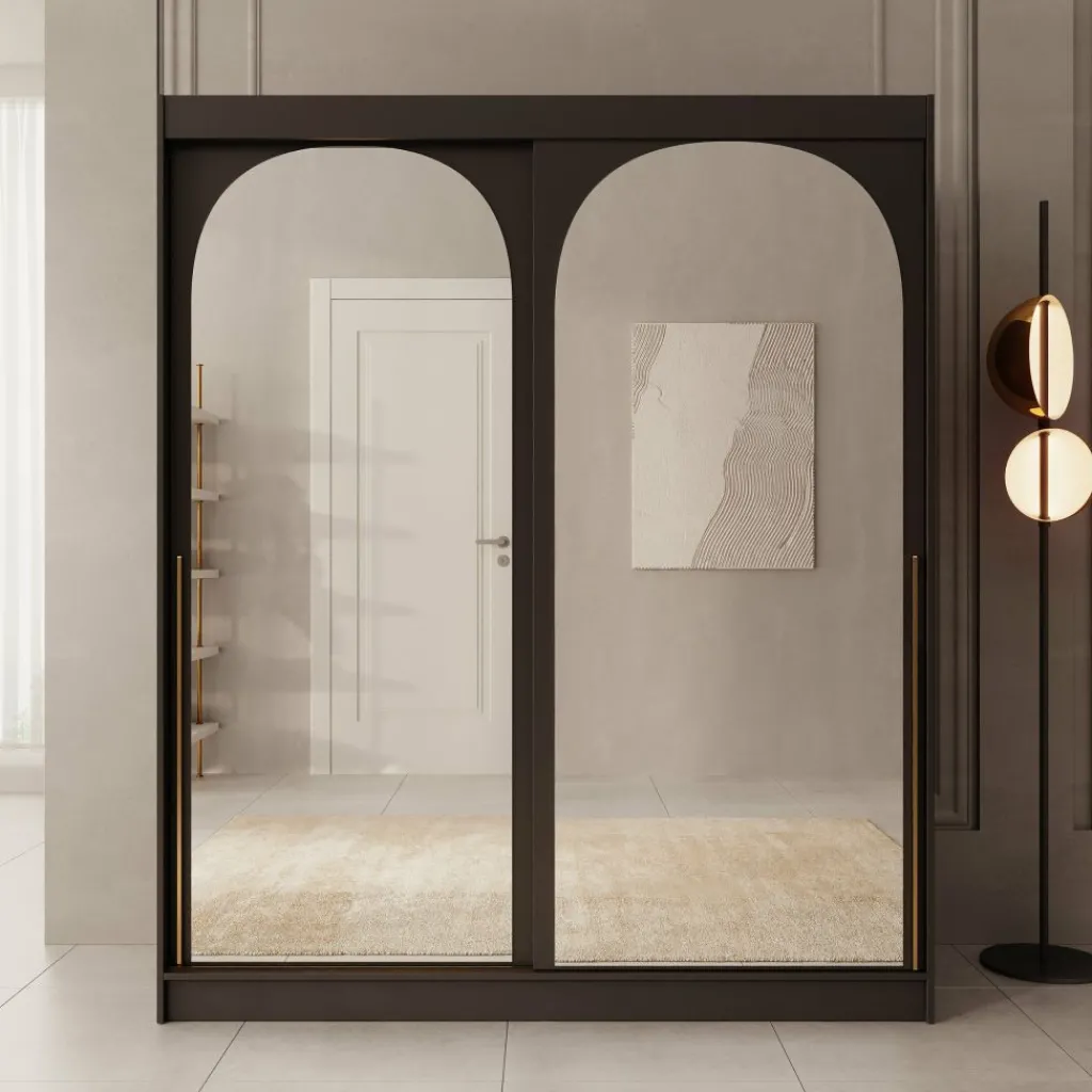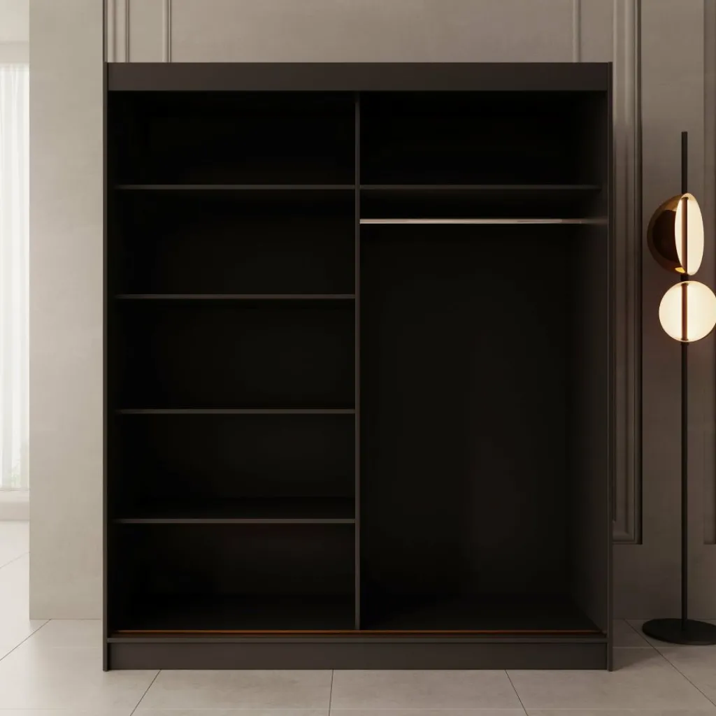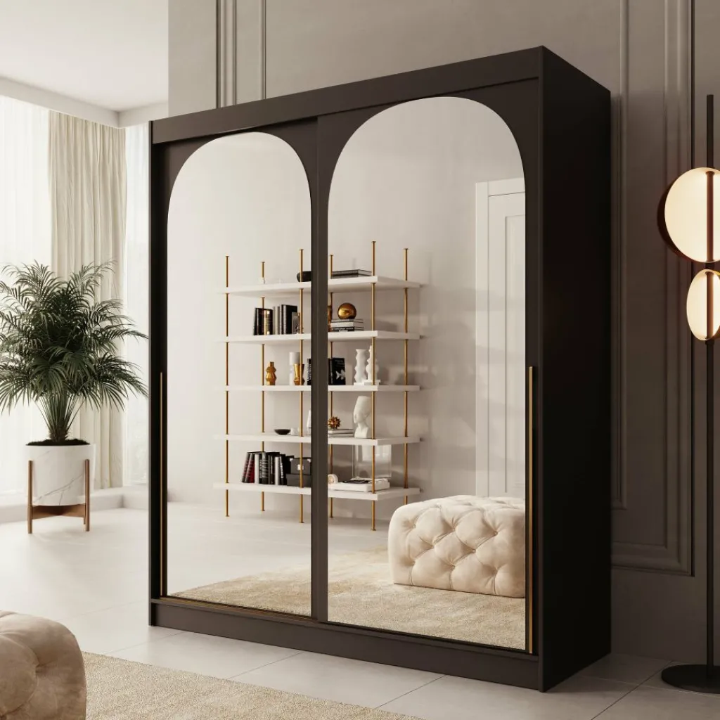 De Moniq kledingkast in zwart combineert stijl met functionaliteit. De spiegeldeuren zorgen voor meer licht en diepte in de kamer. Binnenin vind je meerdere legplanken en roedes voor het overzichtelijk opbergen van kleding en accessoires. De schuifdeuren bewegen soepel over stevige rails en de kast is eenvoudig schoon te houden.