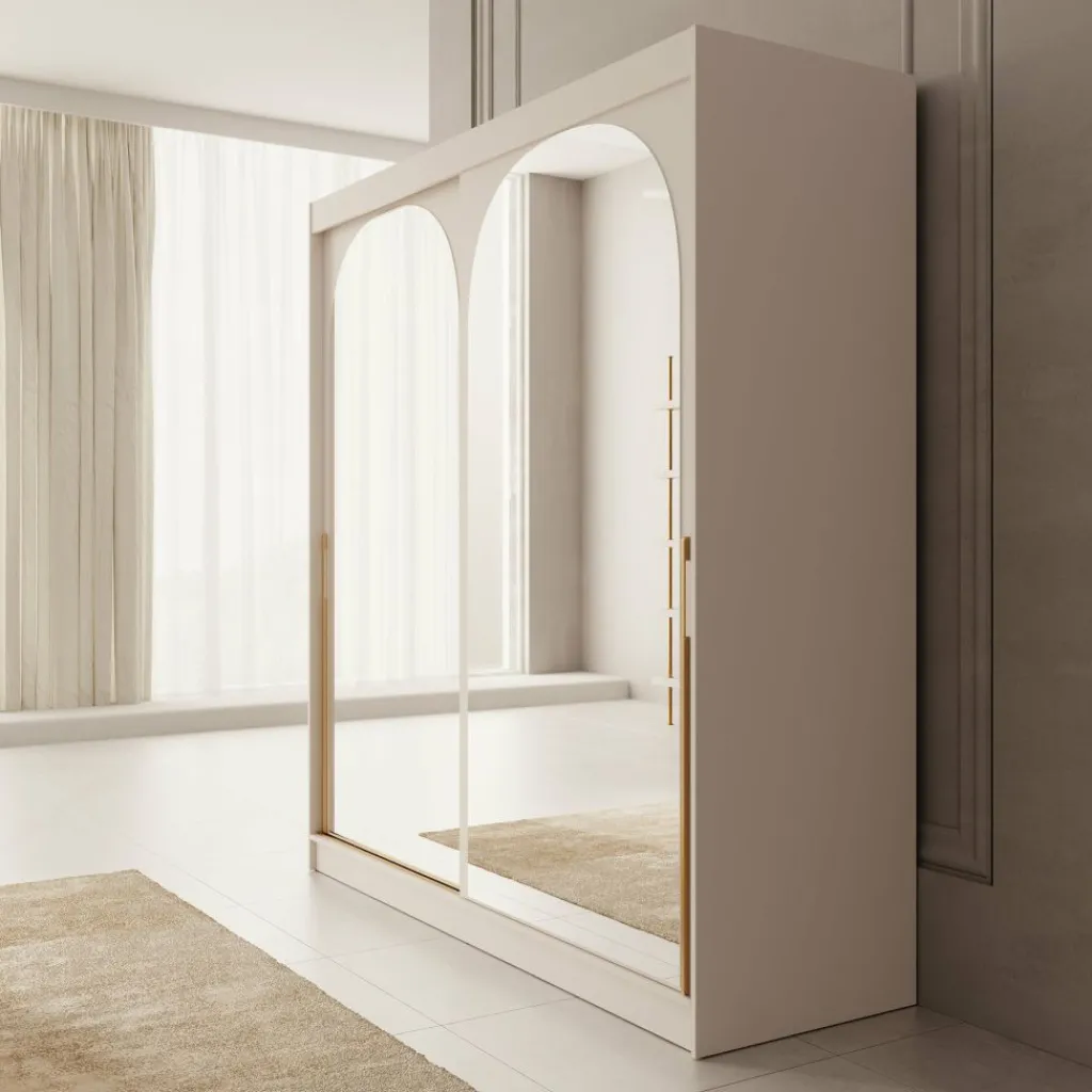 De Moniq kledingkast in beige is de grootste variant uit de serie. De brede schuifdeuren met spiegels zorgen voor een open en lichte uitstraling. Binnenin is de kast voorzien van meerdere vakken en roedes, waardoor kleding, schoenen en accessoires eenvoudig kunnen worden georganiseerd. De soepele schuifdeuren en stevige constructie maken de kast praktisch en duurzaam.