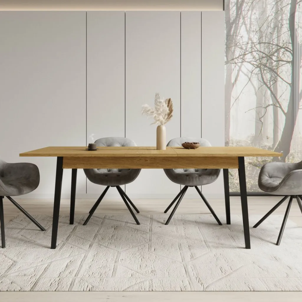 Het ontwerp is minimalistisch en krachtig tegelijk. De houten poten zijn stevig en slank, en zorgen voor een industriële uitstraling zonder massief te ogen. Dankzij het uitschuifbare blad geniet je van maximale flexibiliteit, of je nu gezellig dineert of uitgebreid borrelt.