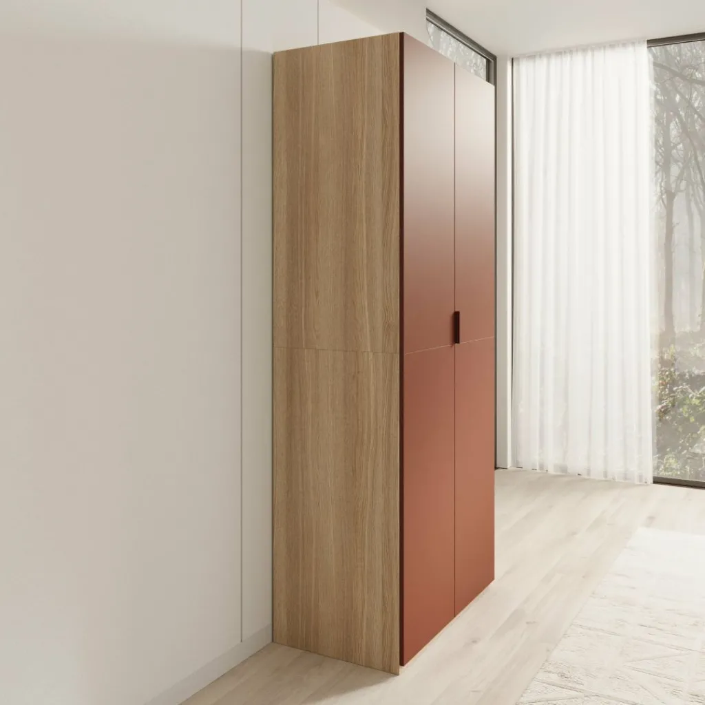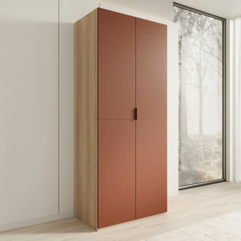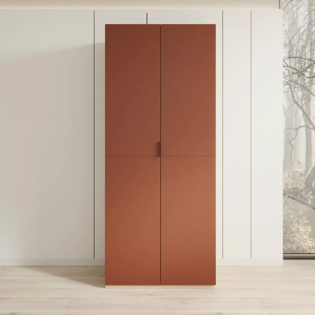 De combinatie van terracotta fronten met een eikenpatroon aan de zijkant zorgt voor een duidelijk contrast en een warme uitstraling. De strakke lijnen en gesloten deuren geven de kast een rustige, moderne vormgeving. Montclair wordt geleverd als bouwpakket en is bedoeld voor plaatsing tegen de muur.