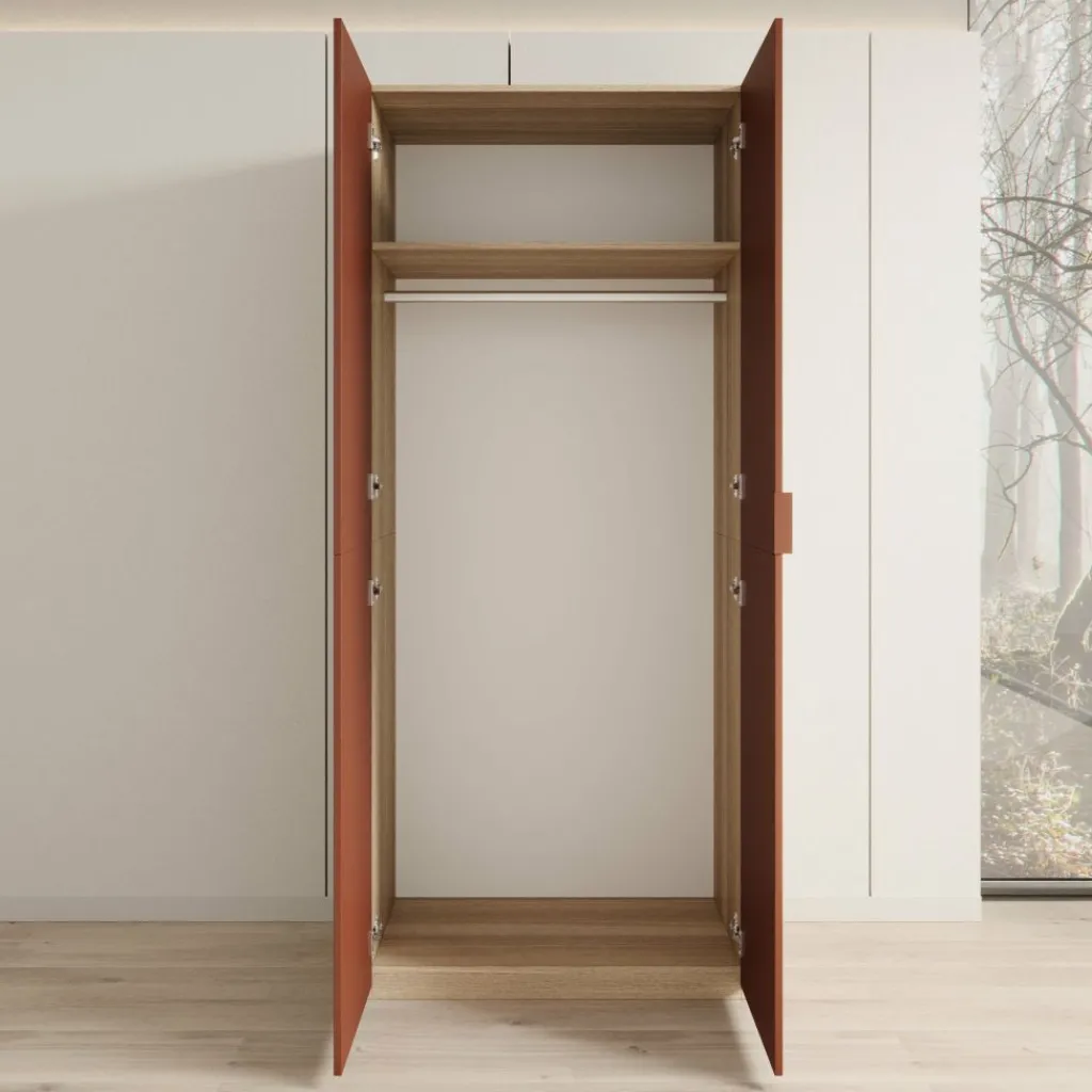 Montclair kledingkast met twee deuren in terracotta met eikenpatroon is een hoge kast voor het opbergen van kleding in de slaapkamer of hal. Met een breedte van 90 cm, een diepte van 53 cm en een hoogte van 215 cm biedt deze kast veel opbergruimte in een slank formaat.