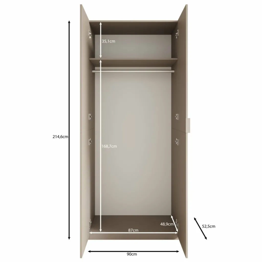 De kast is uitgevoerd met twee draaideuren. Aan de binnenzijde is ruimte om kleding op te hangen, aangevuld met een bovenplank voor het opbergen van bijvoorbeeld kledinghoezen, dozen of accessoires. De indeling is overzichtelijk en geschikt voor dagelijks gebruik.