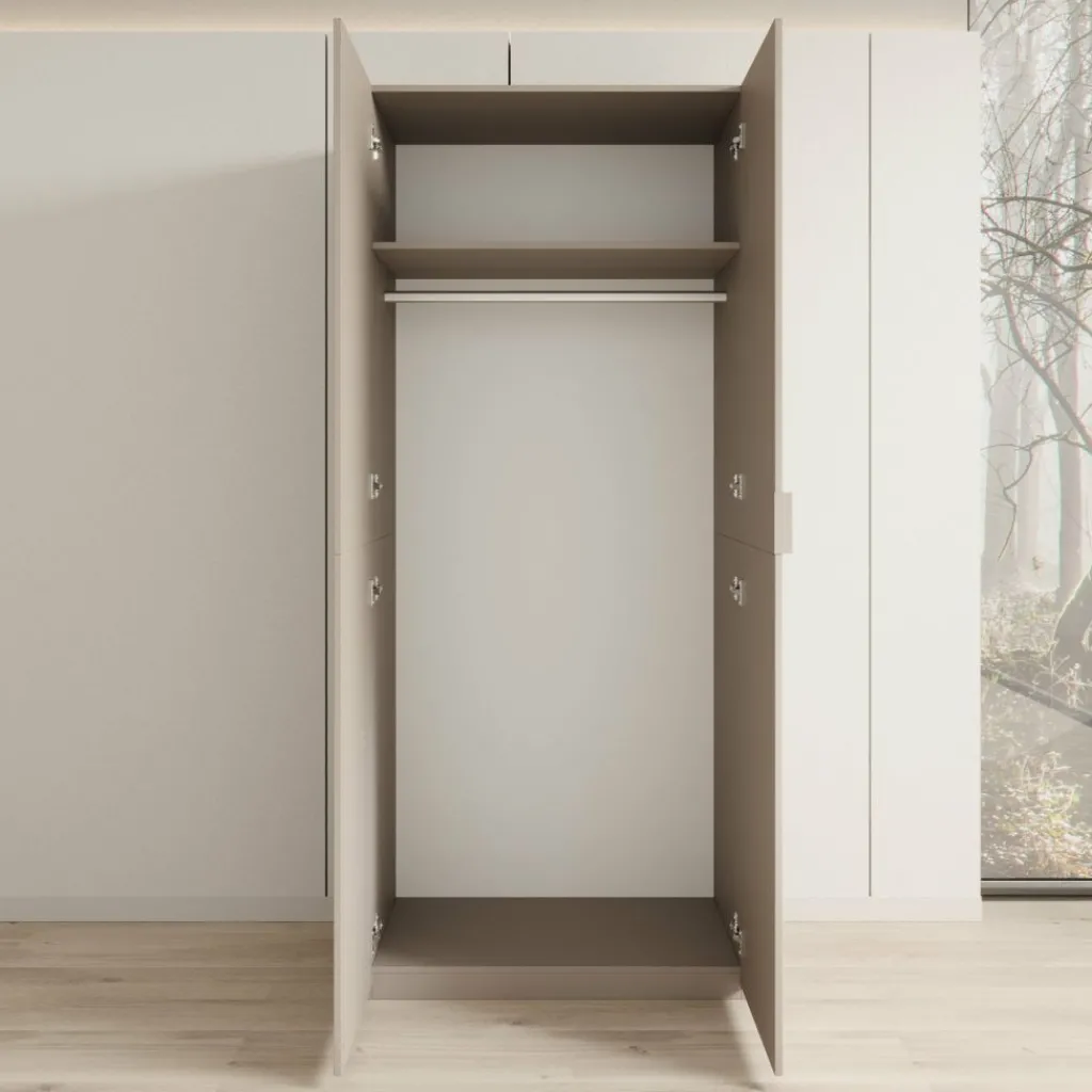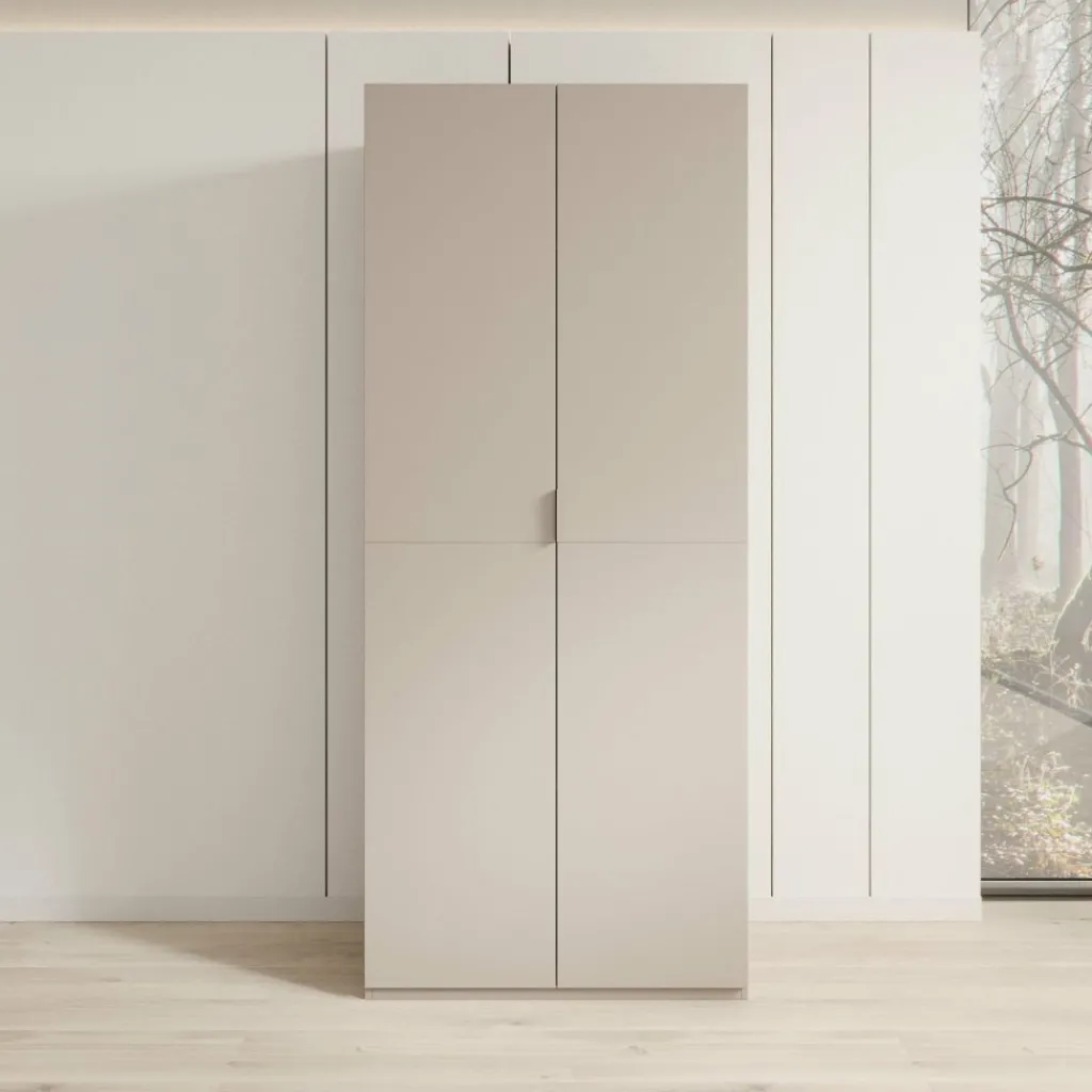 Montclair kledingkast met twee deuren in beige is een hoge, smalle kast die geschikt is voor het opbergen van kleding in de slaapkamer of hal. Met een breedte van 90 cm, een diepte van 53 cm en een hoogte van 215 cm biedt deze kast veel verticale opbergruimte zonder veel vloeroppervlak in te nemen.