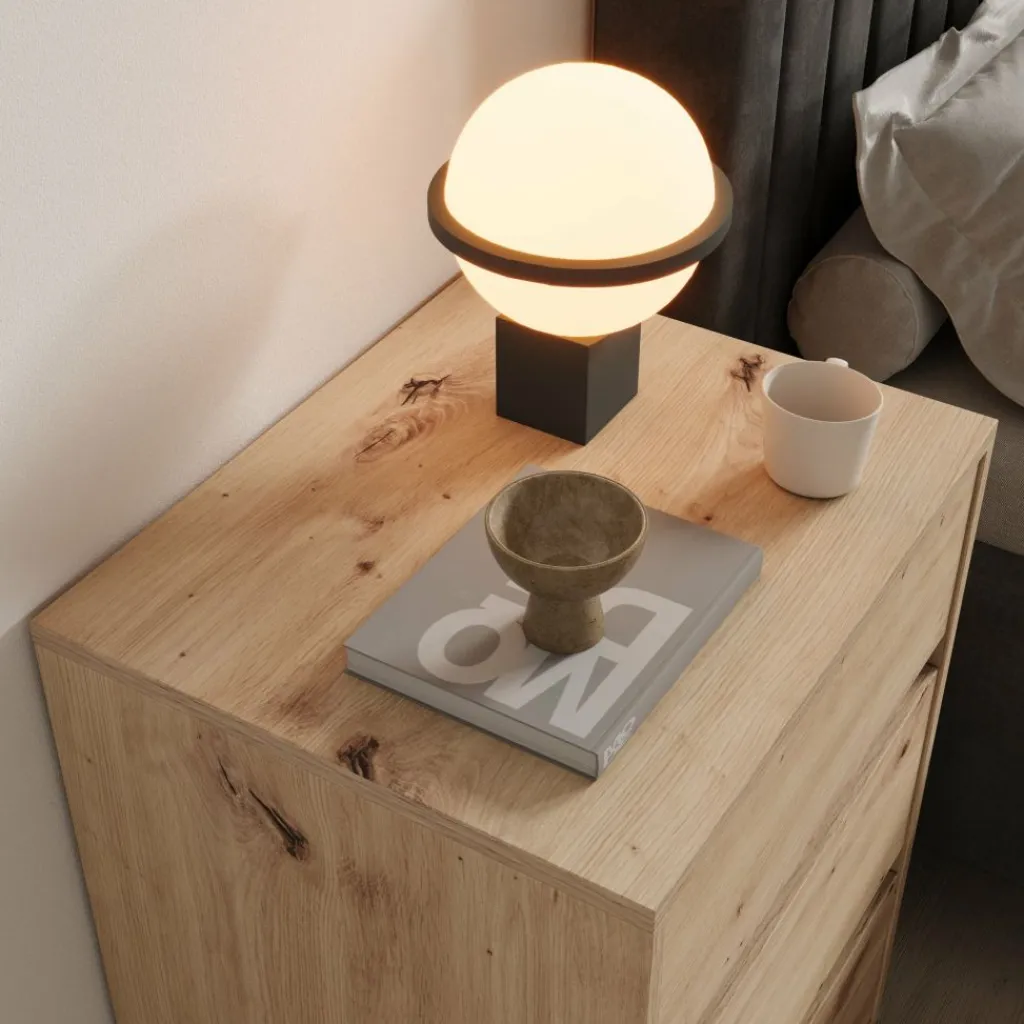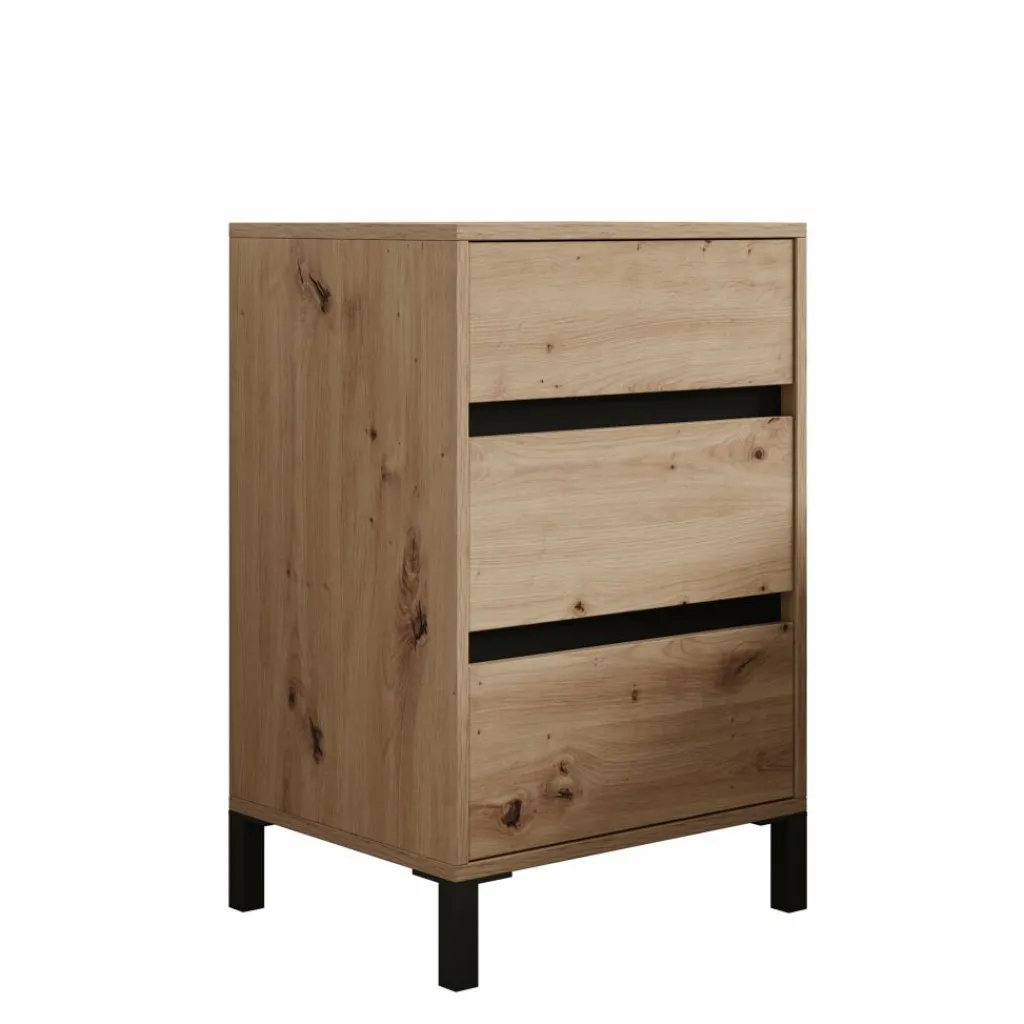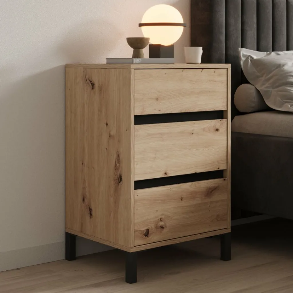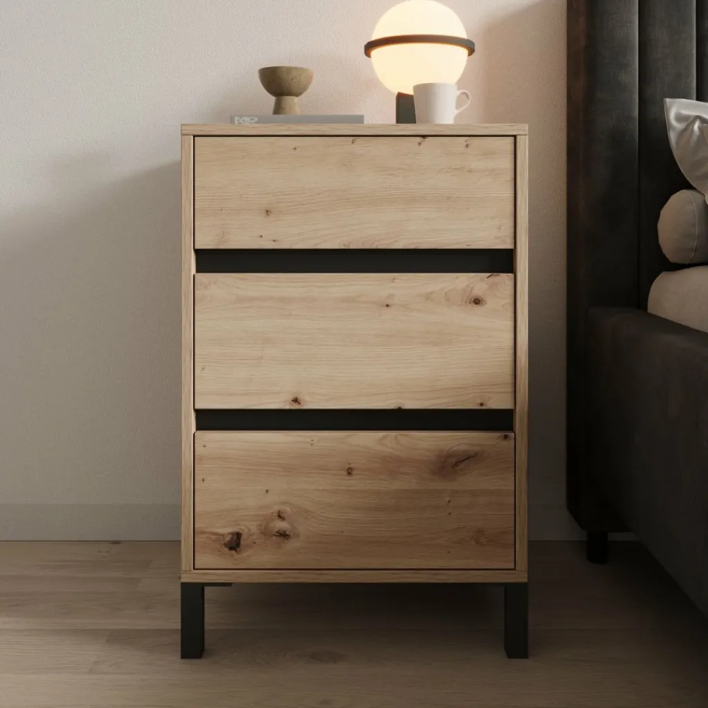 Op het bovenblad plaats je gemakkelijk een lamp, wekker of boek zodat alles binnen handbereik ligt. Door het eikenpatroon in combinatie met de zwarte poten is het nachtkastje goed te combineren met zowel lichte als donkere slaapkamermeubels.