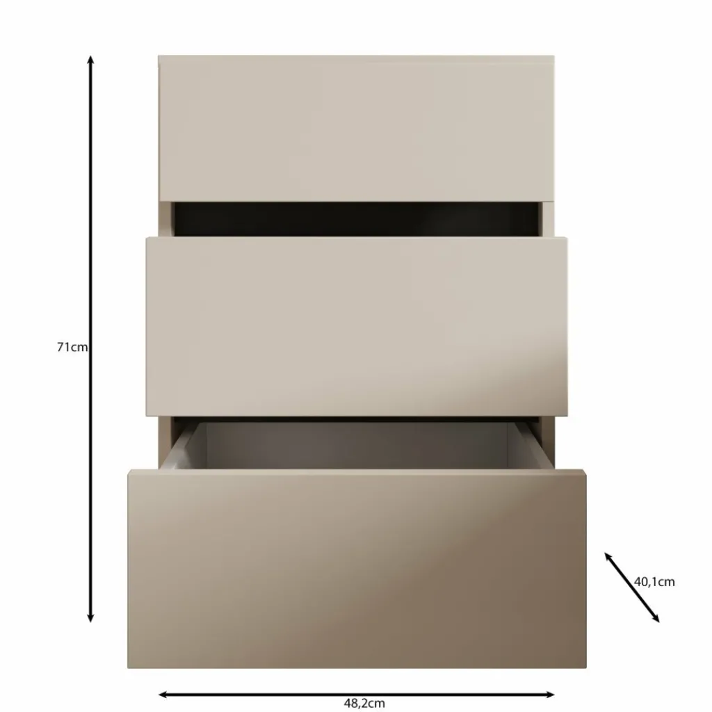 De kast beschikt over drie lades met een greeploos front. De bovenste lade open je aan de onderzijde, terwijl de middelste en onderste lade via de bovenzijde openen. Zo blijven de fronten strak en berg je moeiteloos kleinere spullen op zoals kabels, accessoires en persoonlijke items.
