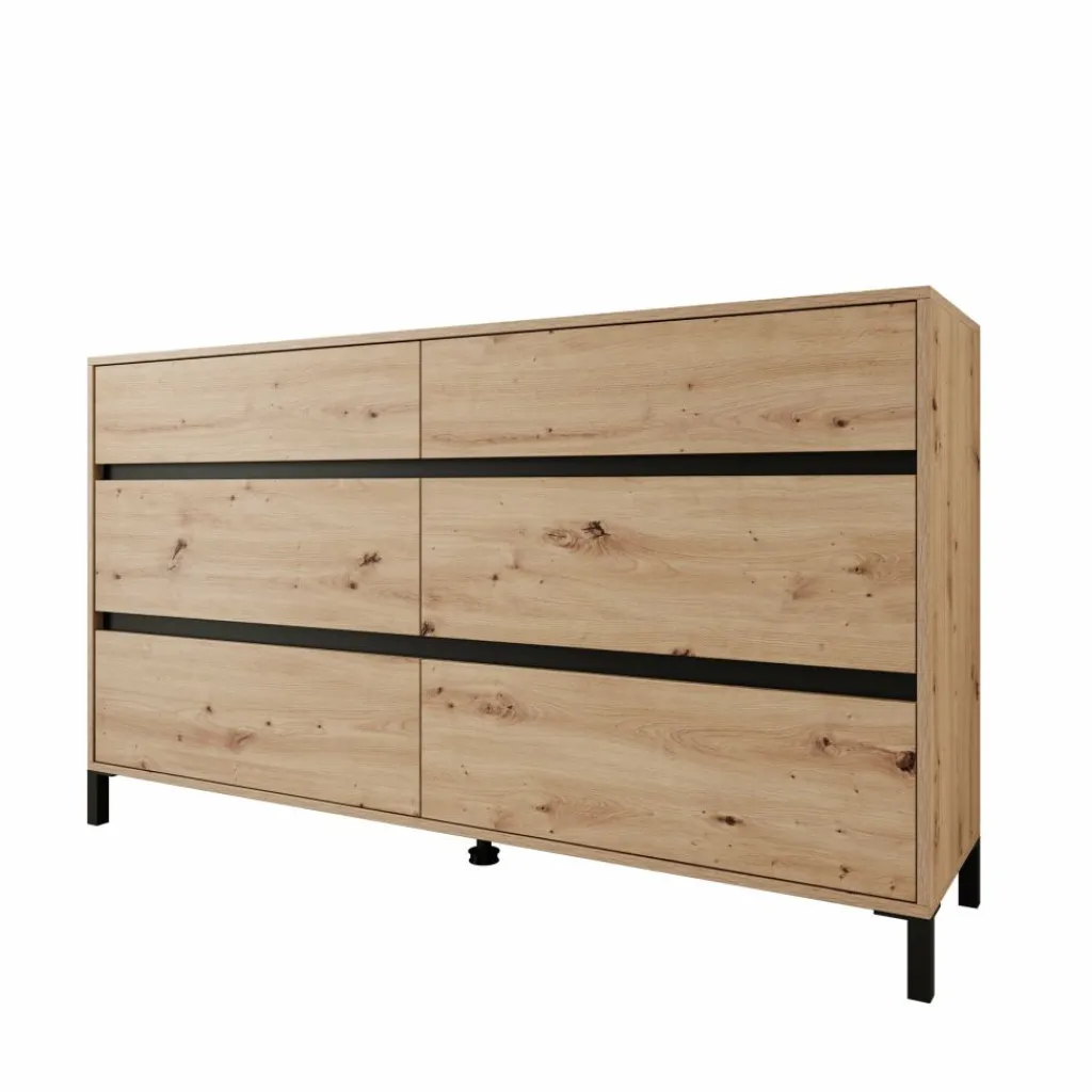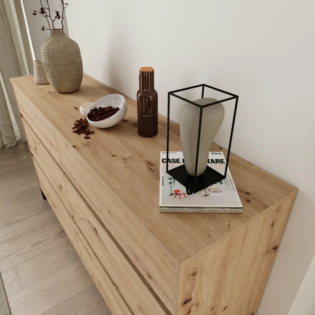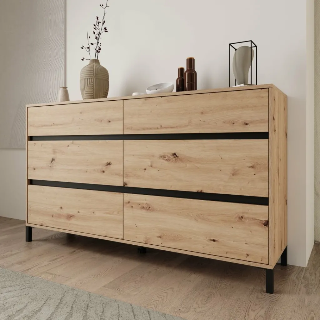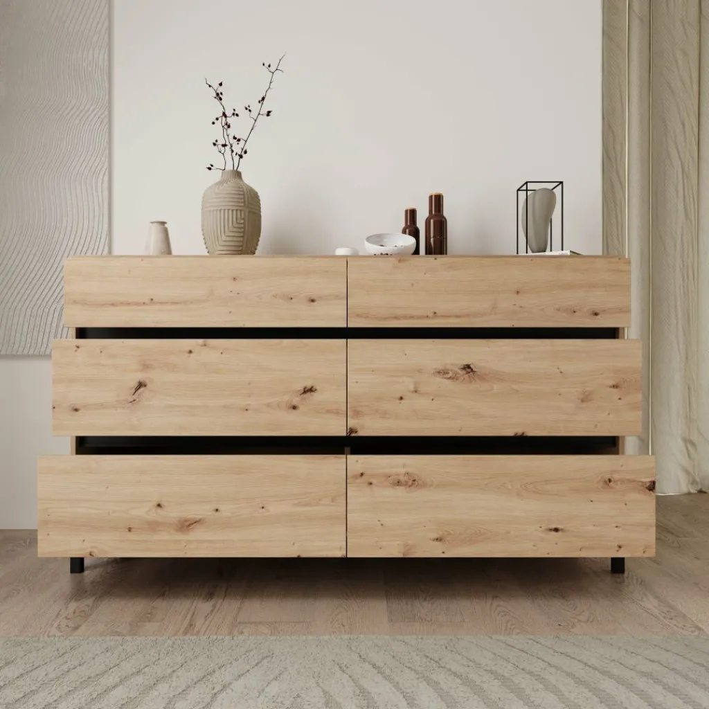 Het eikenpatroon geeft het meubel een duidelijke houtstructuur die zich makkelijk laat combineren met andere materialen in de ruimte. Het bovenblad biedt plaats voor accessoires of praktische items, terwijl de brede lade-indeling zorgt voor een overzichtelijke indeling in slaapkamer, hal of woonkamer.