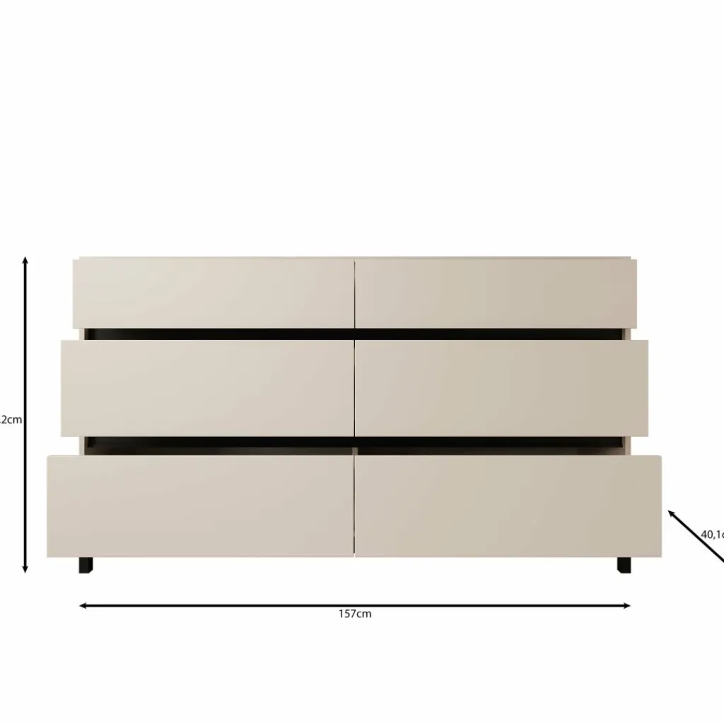 De kast beschikt over zes ruime lades verdeeld over twee kolommen. De greeploze fronten openen via de onderzijde van de bovenste lade en via de bovenzijde bij de overige lades. Hierdoor blijven de fronten volledig vlak en ontstaat de kenmerkende horizontale schaduwlijn over de volledige breedte. Dit maakt het meubel geschikt voor het overzichtelijk opbergen van kleding, papierwerk of andere dagelijkse spullen.