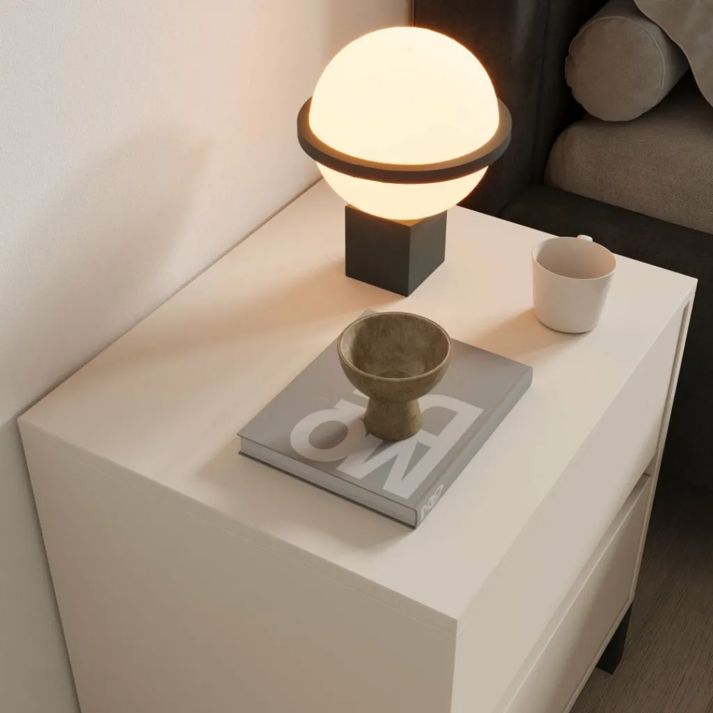 Het bovenblad is geschikt voor een nachtlamp, wekker of boek en blijft goed bereikbaar door de praktische hoogte naast het bed. Door de combinatie van de beige afwerking en de zwarte poten laat het meubel zich makkelijk combineren met zowel lichte als donkere bedden en vloeren.