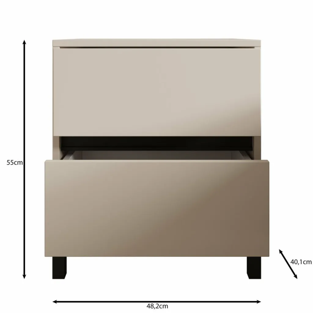 Het Montellini nachtkastje is een compact staand model in beige, geschikt voor plaatsing naast het bed. Met een breedte van 48 cm, een diepte van 40 cm en een hoogte van 55 cm biedt het voldoende ruimte voor dagelijkse spullen zonder veel vloeroppervlak in te nemen. Het meubel staat op zwarte poten waardoor het eenvoudig onder schoon te maken blijft.
