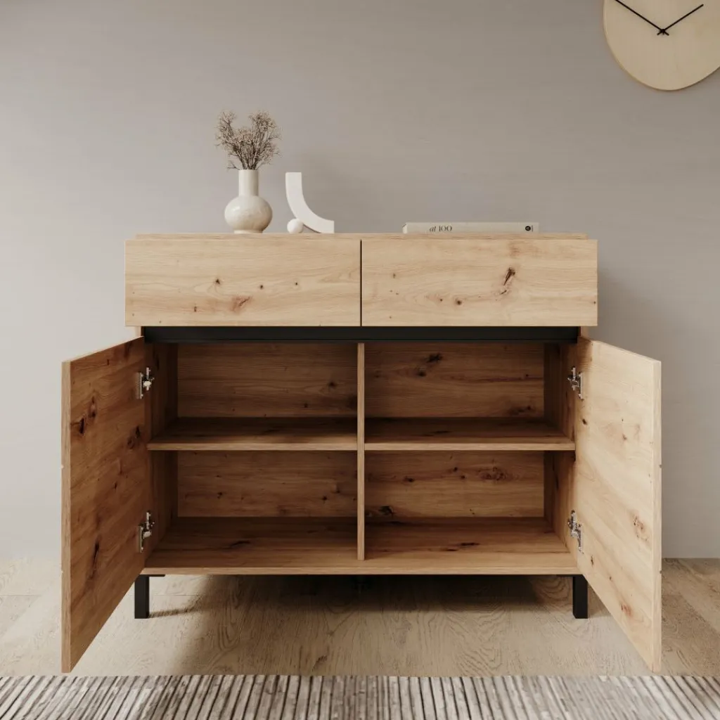 Bovenin bevinden zich twee lades met een greeploos front die openen via de onderzijde. Daaronder zitten twee deuren met daarachter een opbergvak dat wordt verdeeld door een legplank, zodat je spullen overzichtelijk kunt indelen. Hierdoor is het geschikt voor servies, accessoires of andere items die je netjes wilt opbergen.