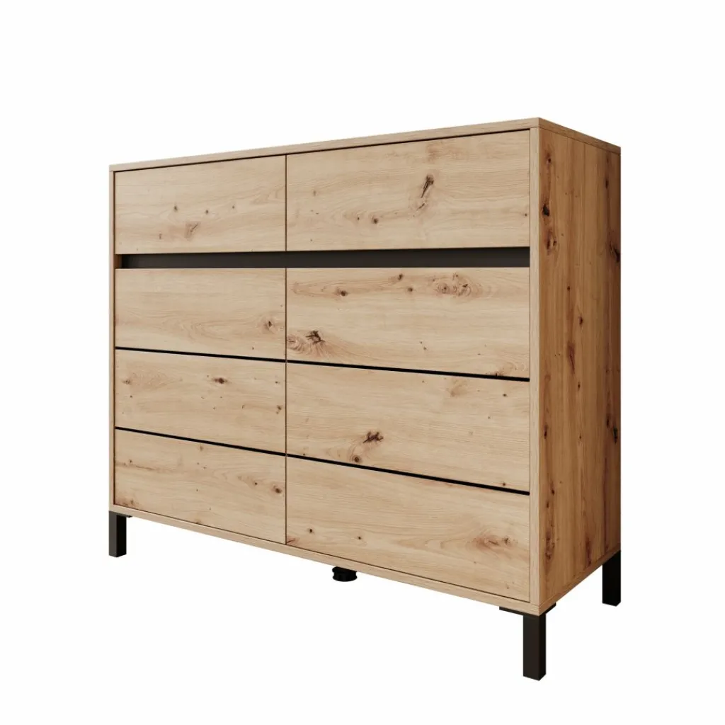 Het bovenblad biedt ruimte voor decoratie of praktische spullen en is goed bereikbaar door de prettige hoogte. Door het eikenpatroon in combinatie met de zwarte poten laat het dressoir zich makkelijk combineren met uiteenlopende interieurs.