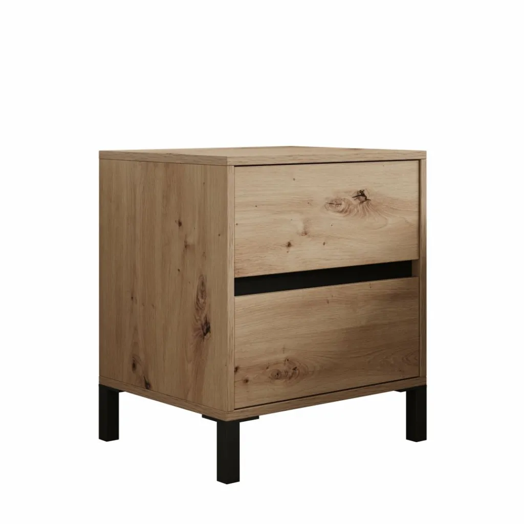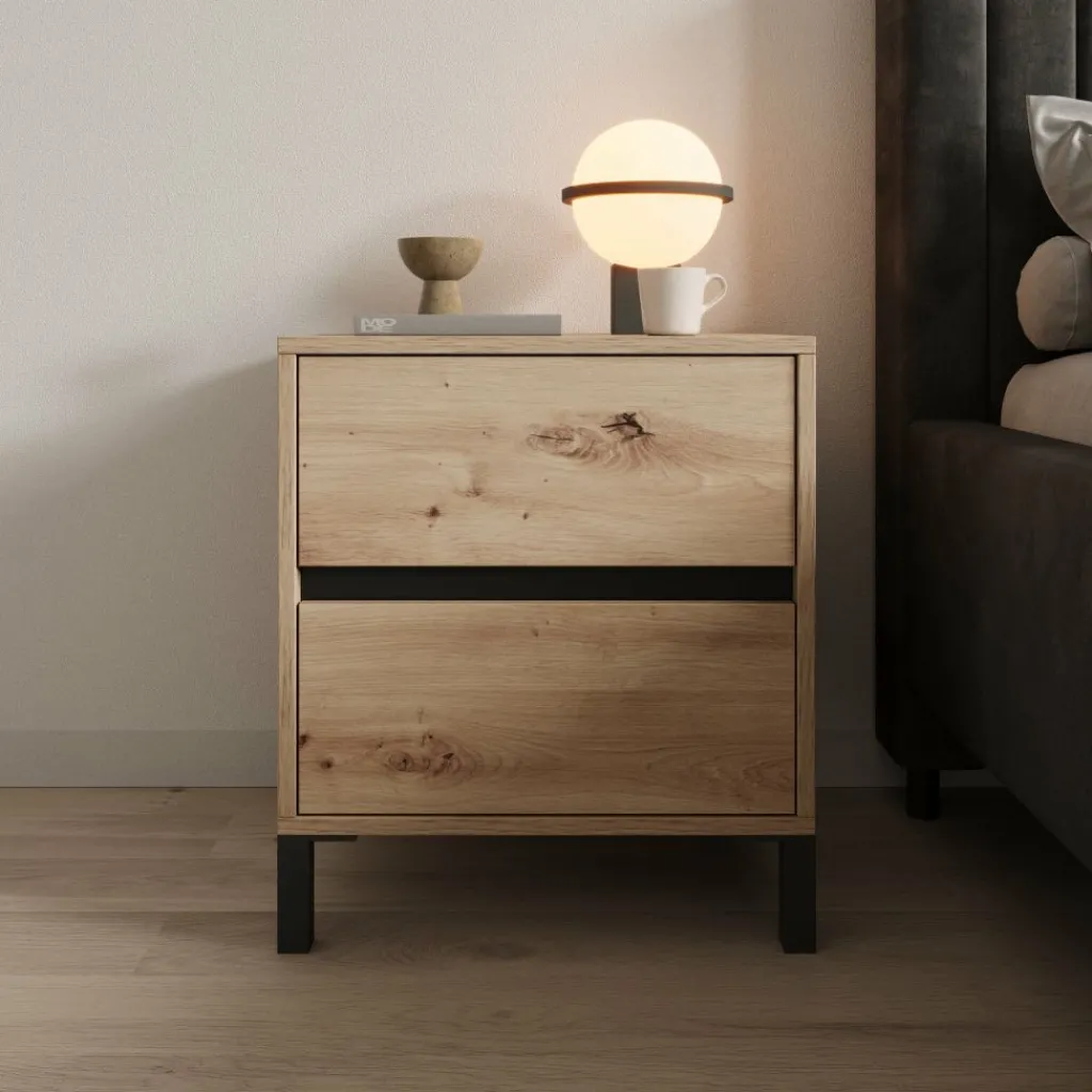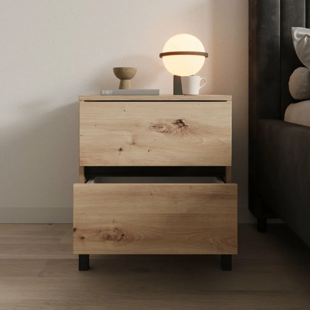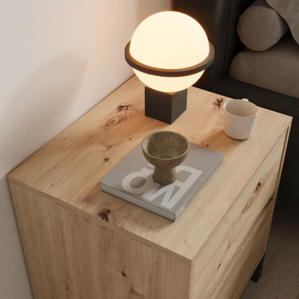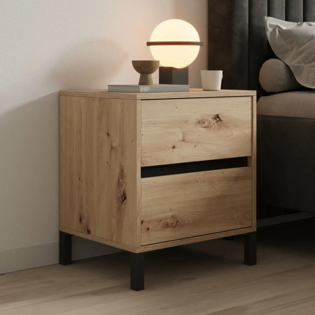 Het bovenblad biedt plek voor een lamp, wekker of boek zodat alles binnen handbereik ligt naast het bed. Door het eikenpatroon in combinatie met de zwarte poten is het nachtkastje eenvoudig te combineren met zowel moderne als meer natuurlijke slaapkamerinrichtingen.
