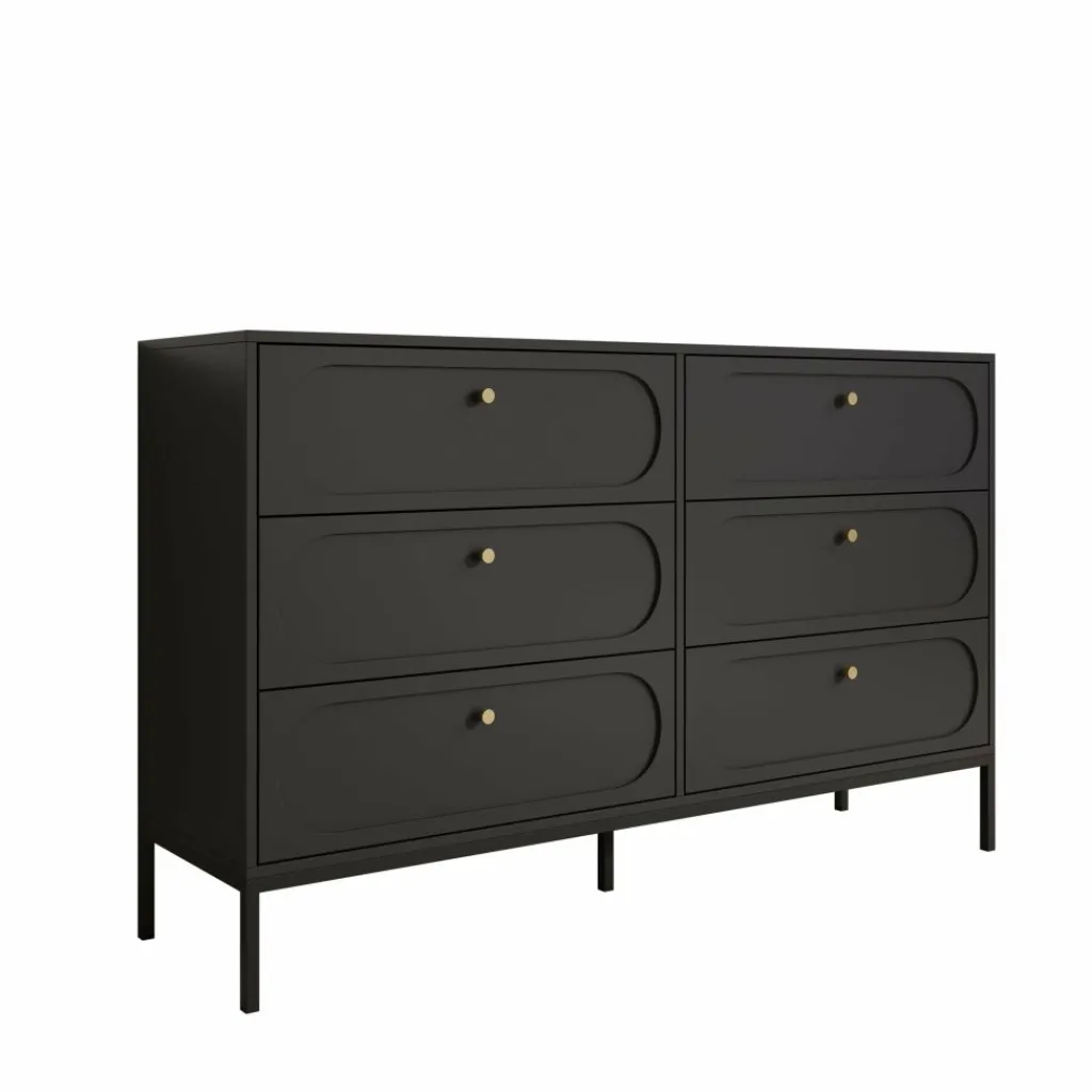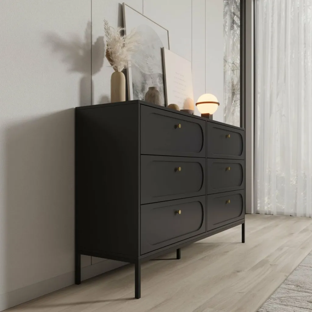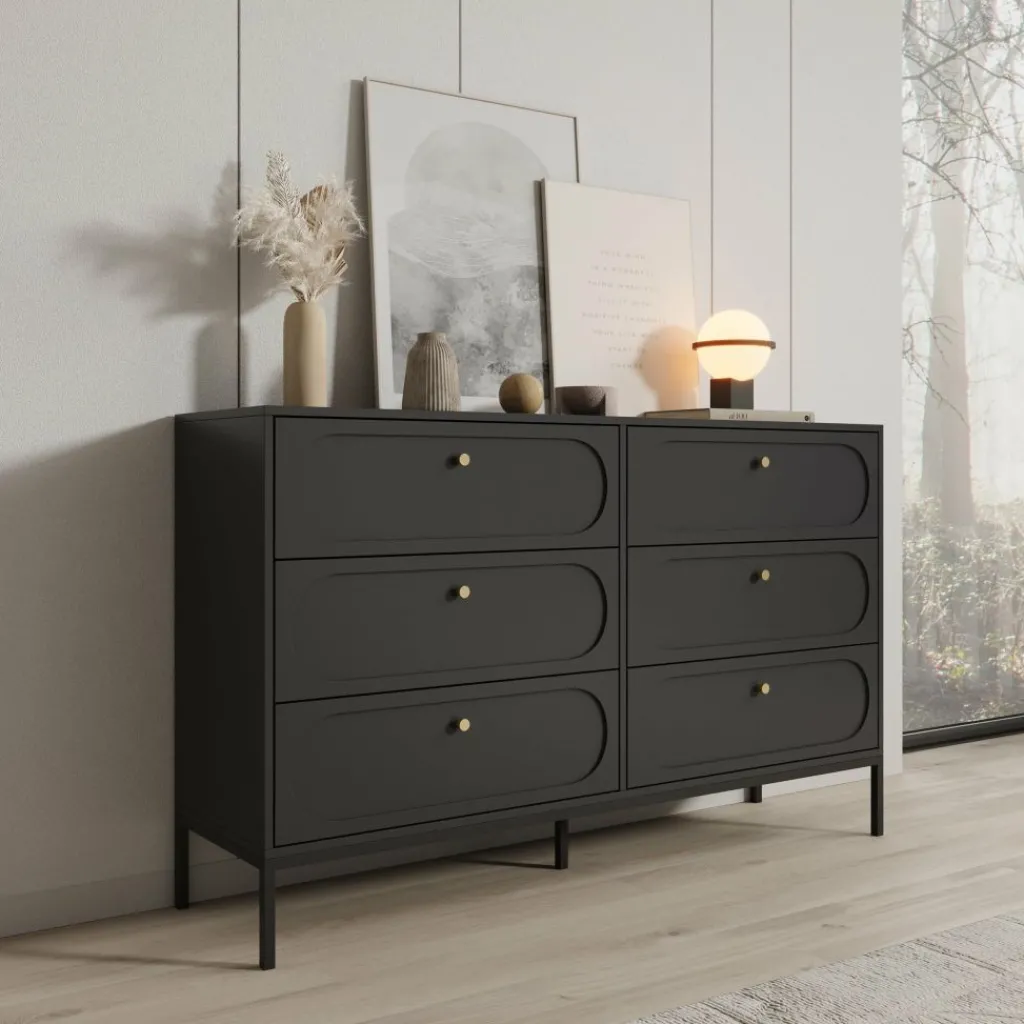 De Montserrat ladekast met zes lades in zwart heeft een moderne en strakke uitstraling. De afgeronde ladefronten geven het ontwerp een herkenbare vormtaal, terwijl de diepe zwarte kleur het geheel een rustige en luxe uitstraling geeft. Met een breedte van 150 cm biedt de kast ruime opbergmogelijkheden voor kleding, accessoires of andere dagelijkse items.