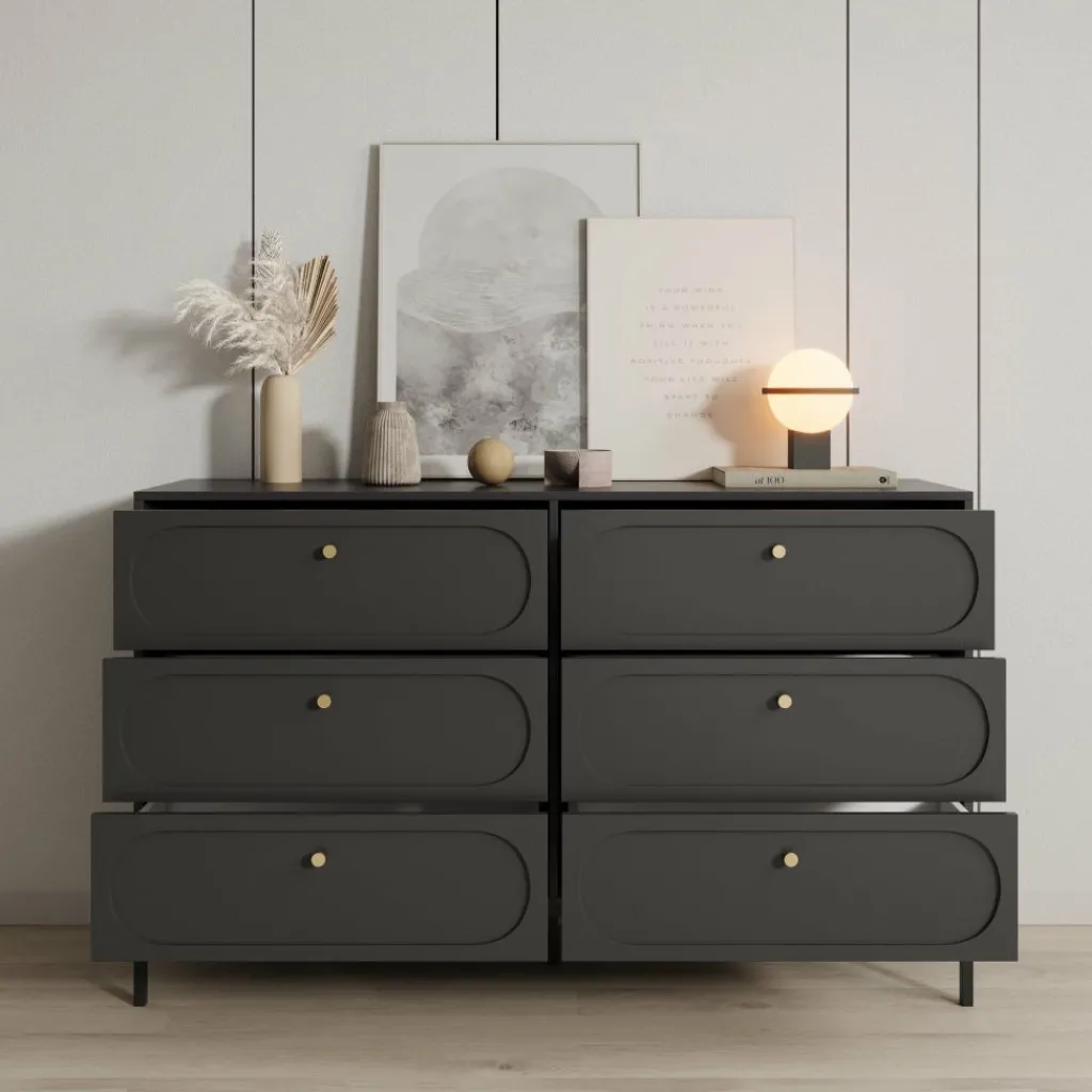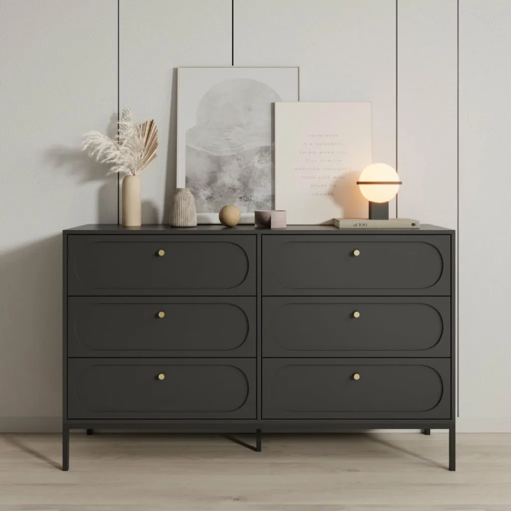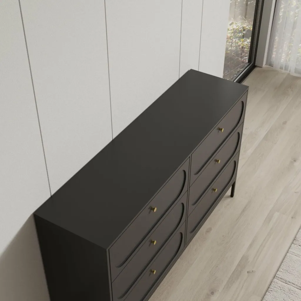 De Montserrat ladekast met zes lades in zwart heeft een moderne en strakke uitstraling. De afgeronde ladefronten geven het ontwerp een herkenbare vormtaal, terwijl de diepe zwarte kleur het geheel een rustige en luxe uitstraling geeft. Met een breedte van 150 cm biedt de kast ruime opbergmogelijkheden voor kleding, accessoires of andere dagelijkse items.