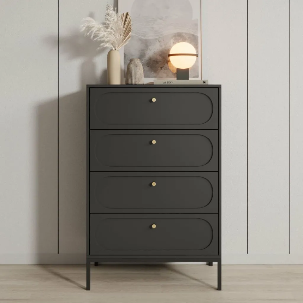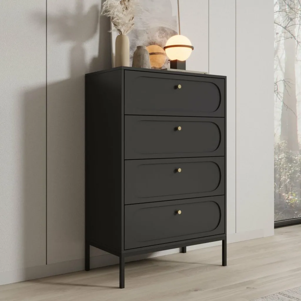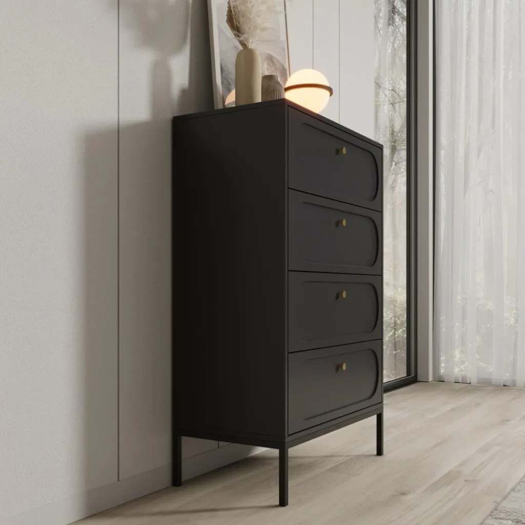 De vier ruime lades bieden praktische opbergruimte voor kleding, accessoires of andere dagelijkse items. Het slanke metalen onderstel zorgt voor stabiliteit en tilt de kast optisch iets van de vloer, wat het ontwerp een luchtige uitstraling geeft.