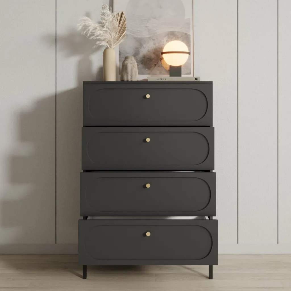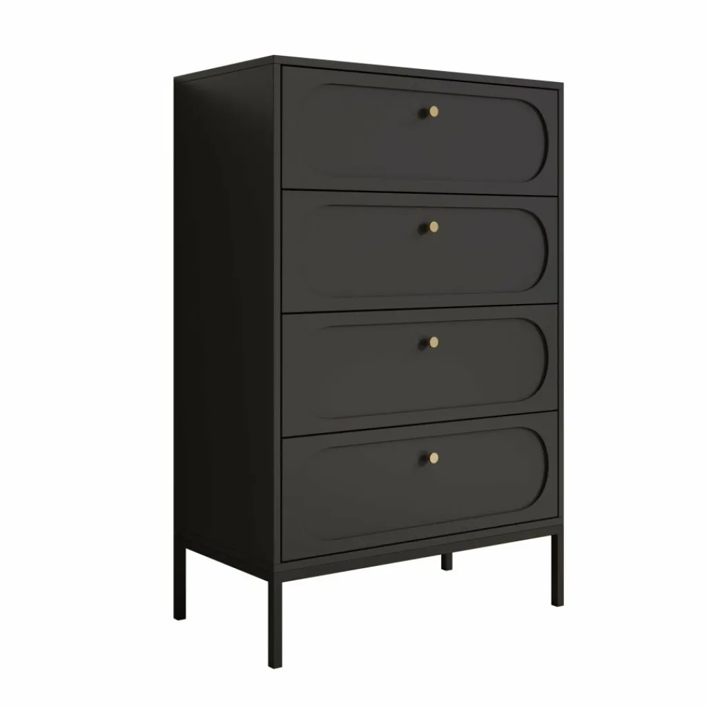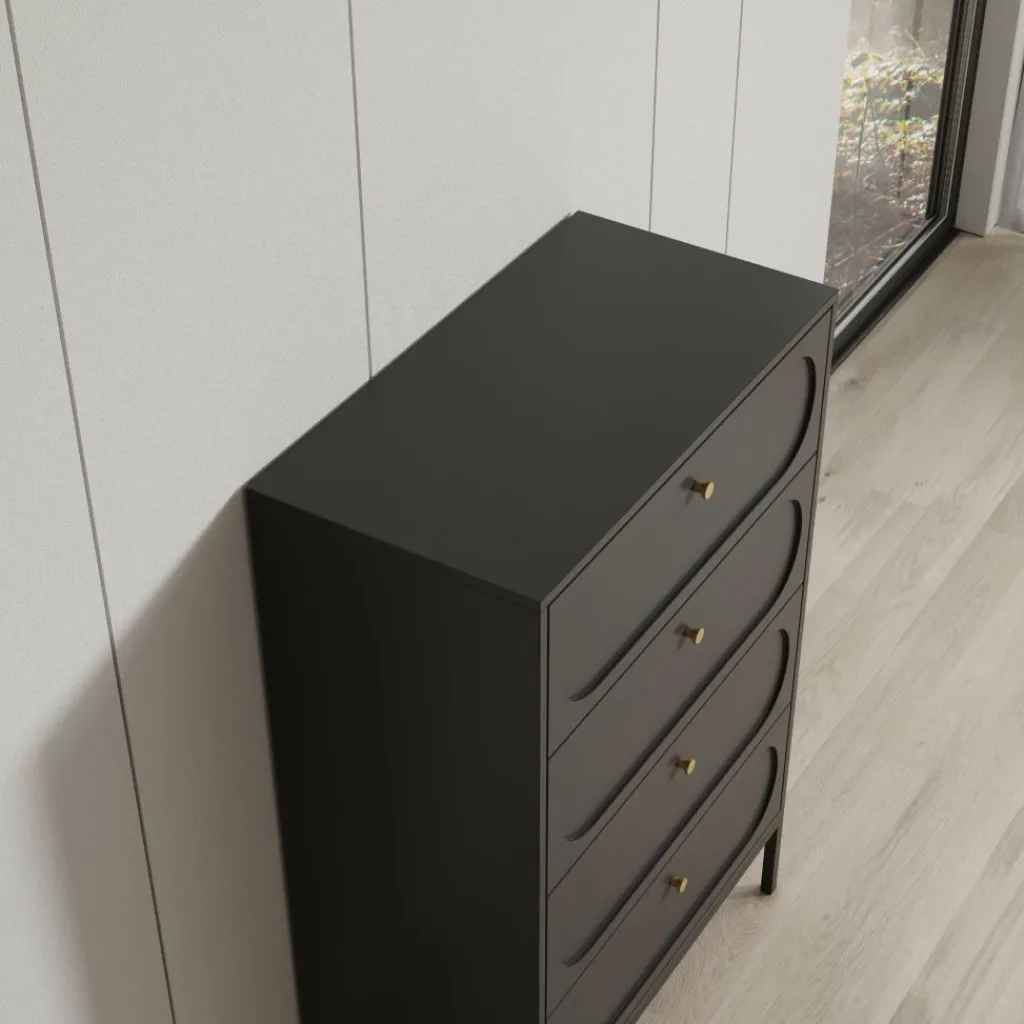 De vier ruime lades bieden praktische opbergruimte voor kleding, accessoires of andere dagelijkse items. Het slanke metalen onderstel zorgt voor stabiliteit en tilt de kast optisch iets van de vloer, wat het ontwerp een luchtige uitstraling geeft.