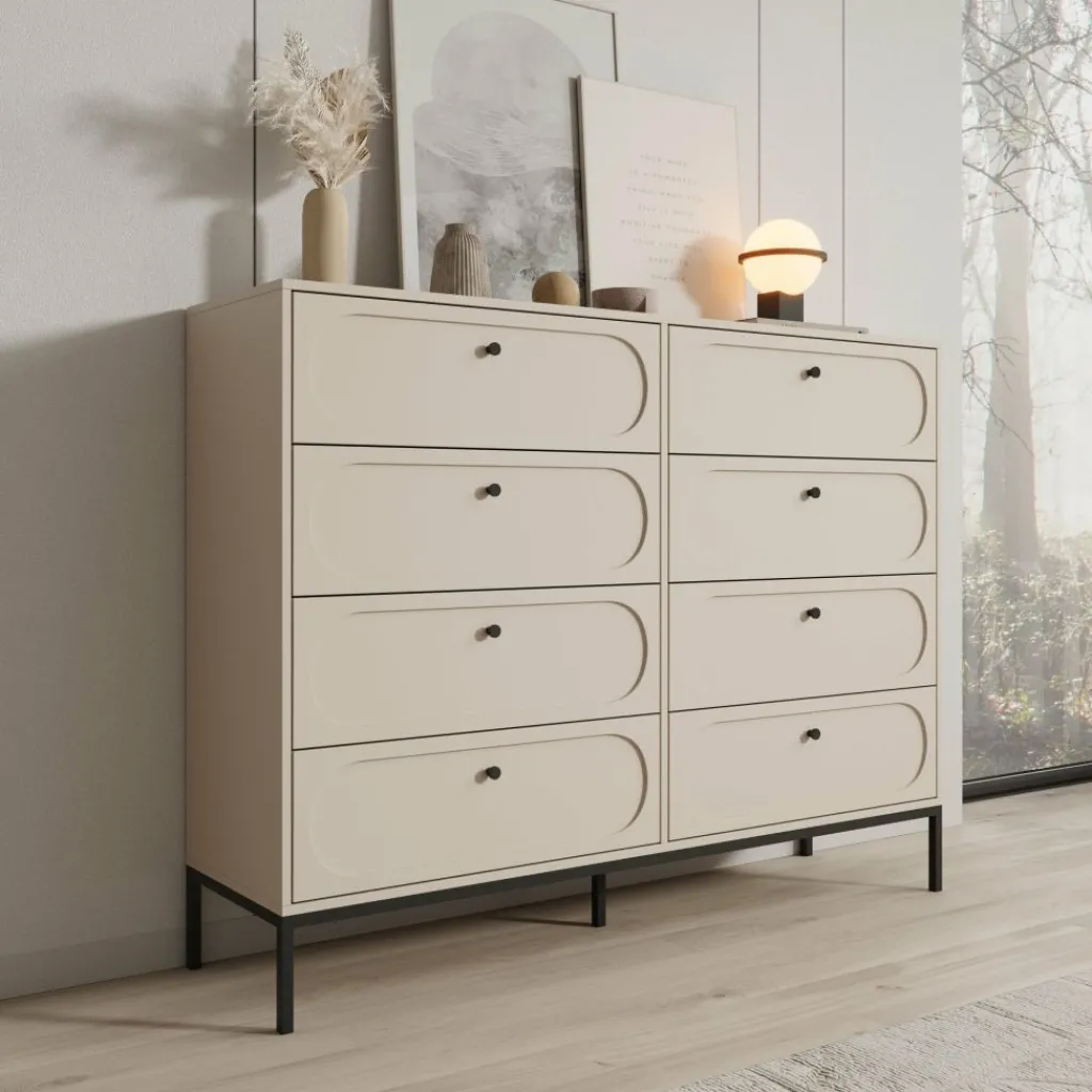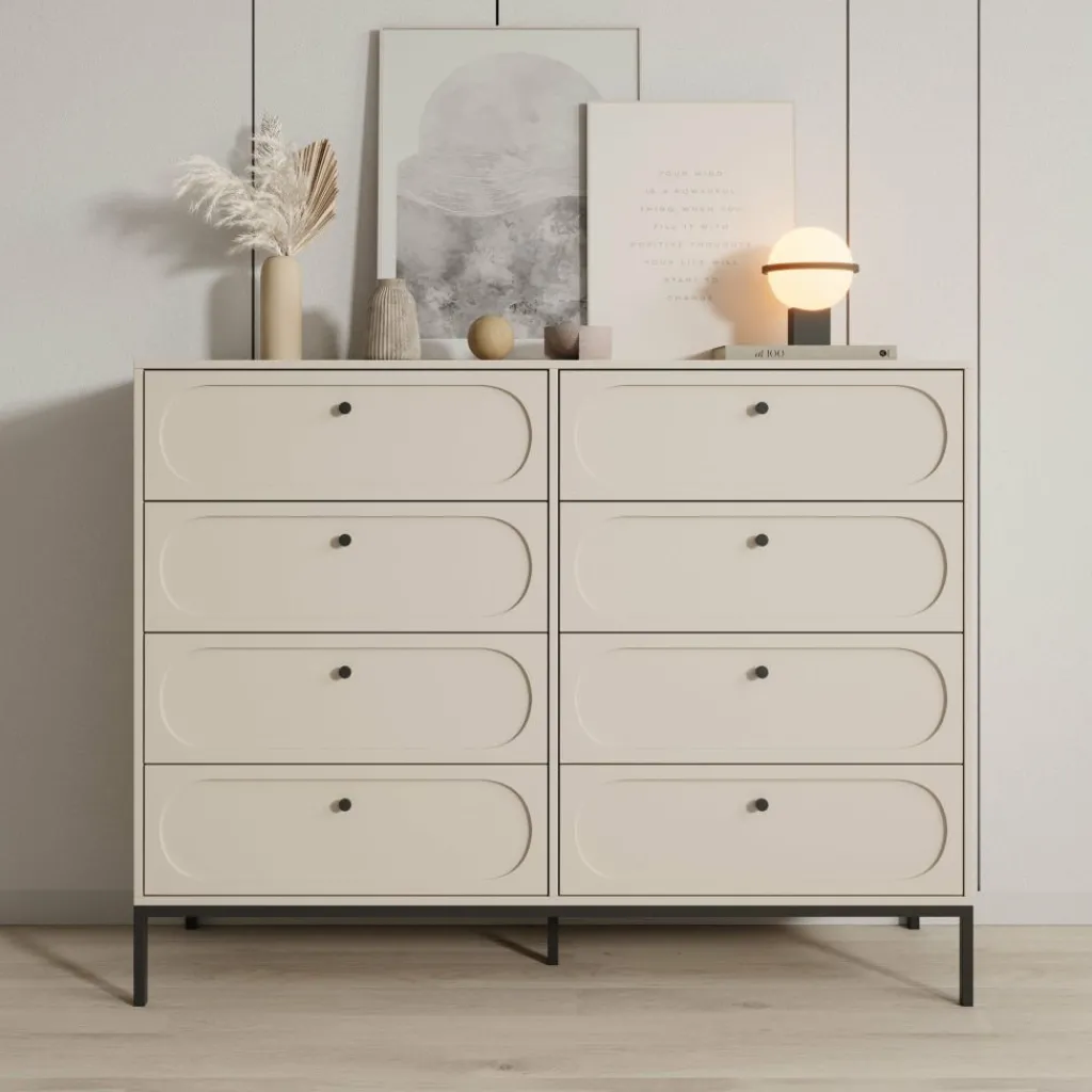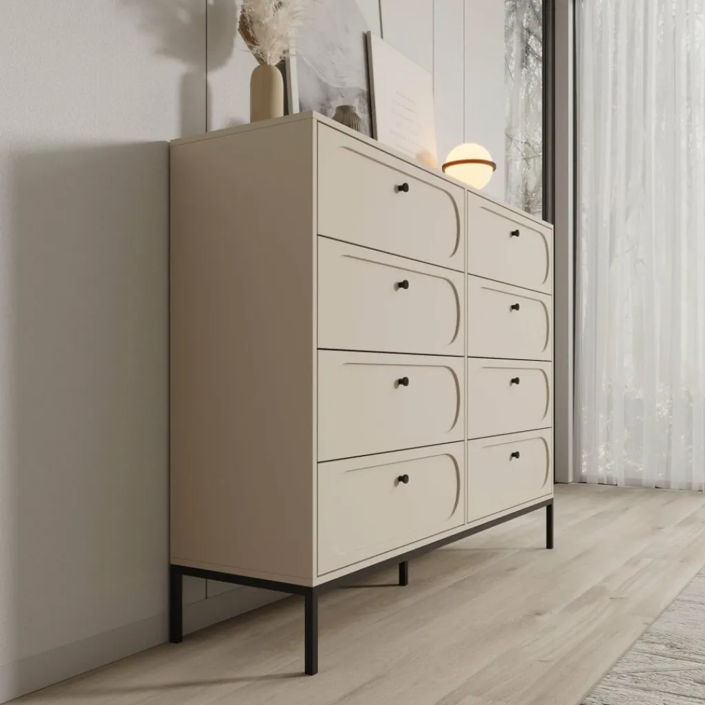 De Montserrat-ladekast met 8 lades biedt veel opbergruimte in een strak en evenwichtig ontwerp. Het model is uitgevoerd in een zachte beige tint en staat op een slank zwart metalen onderstel, waardoor de kast licht oogt en eenvoudig te combineren is met verschillende woonstijlen. De organische afgeronde fronten geven de kast een rustige, moderne uitstraling.