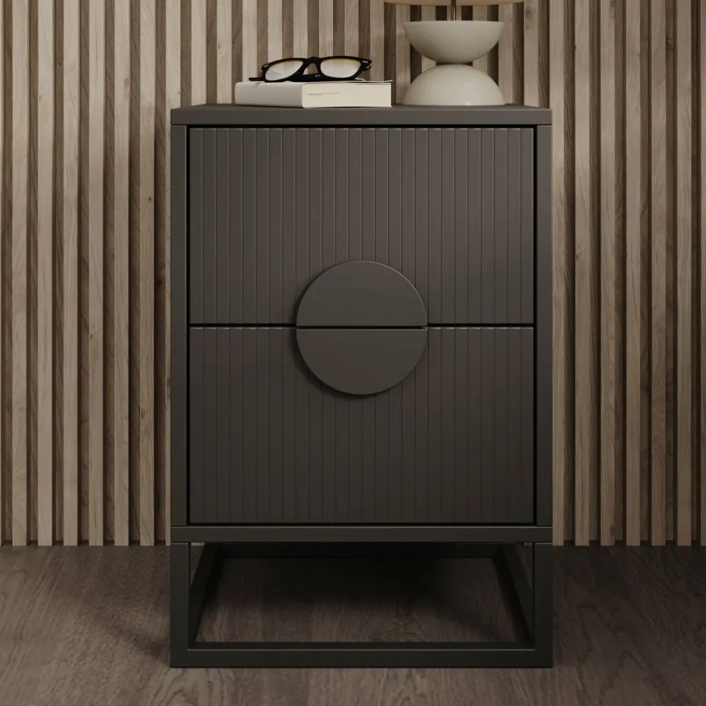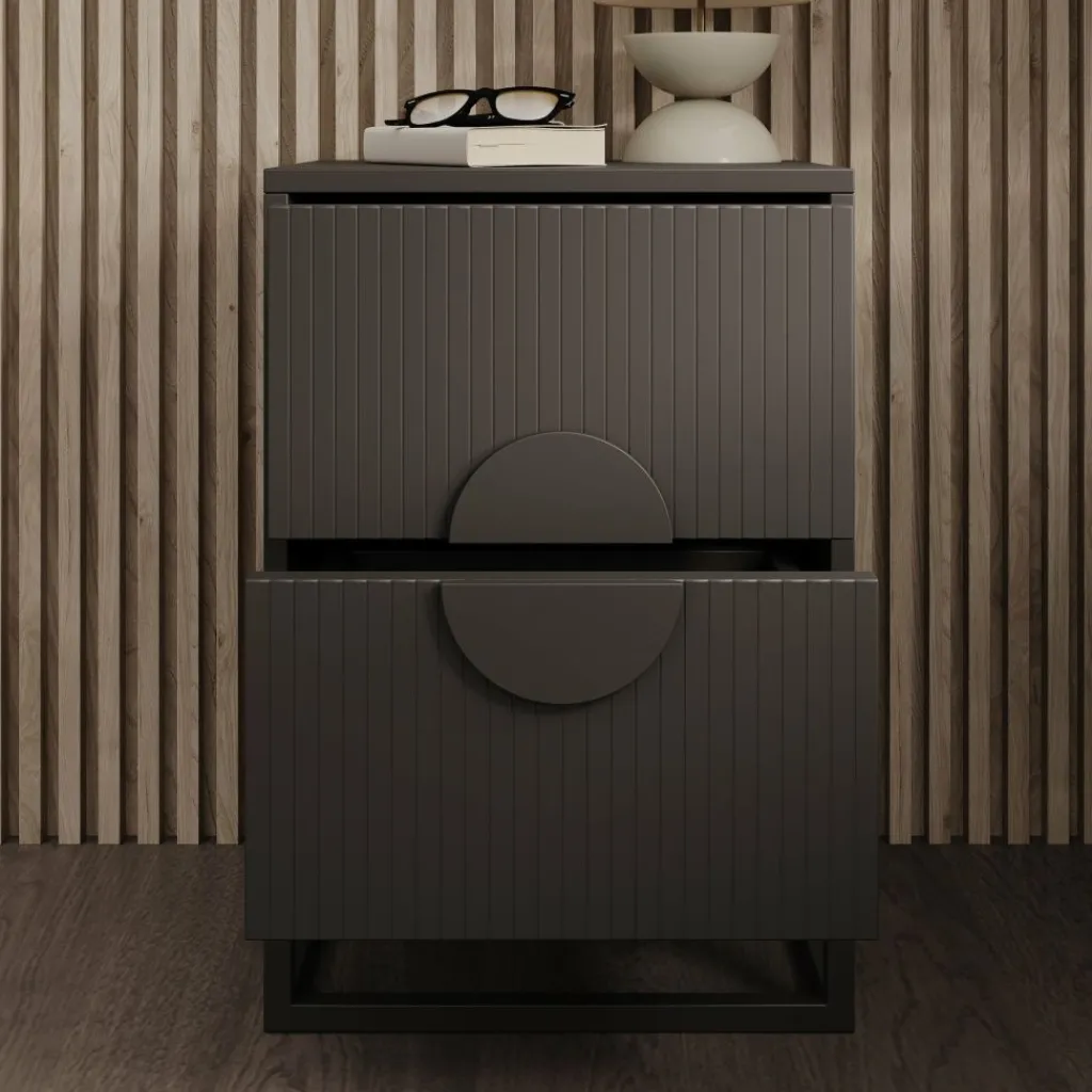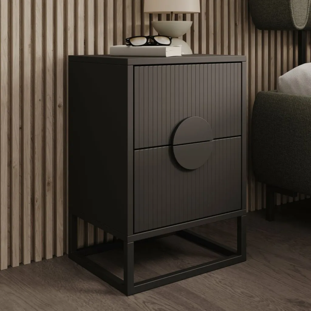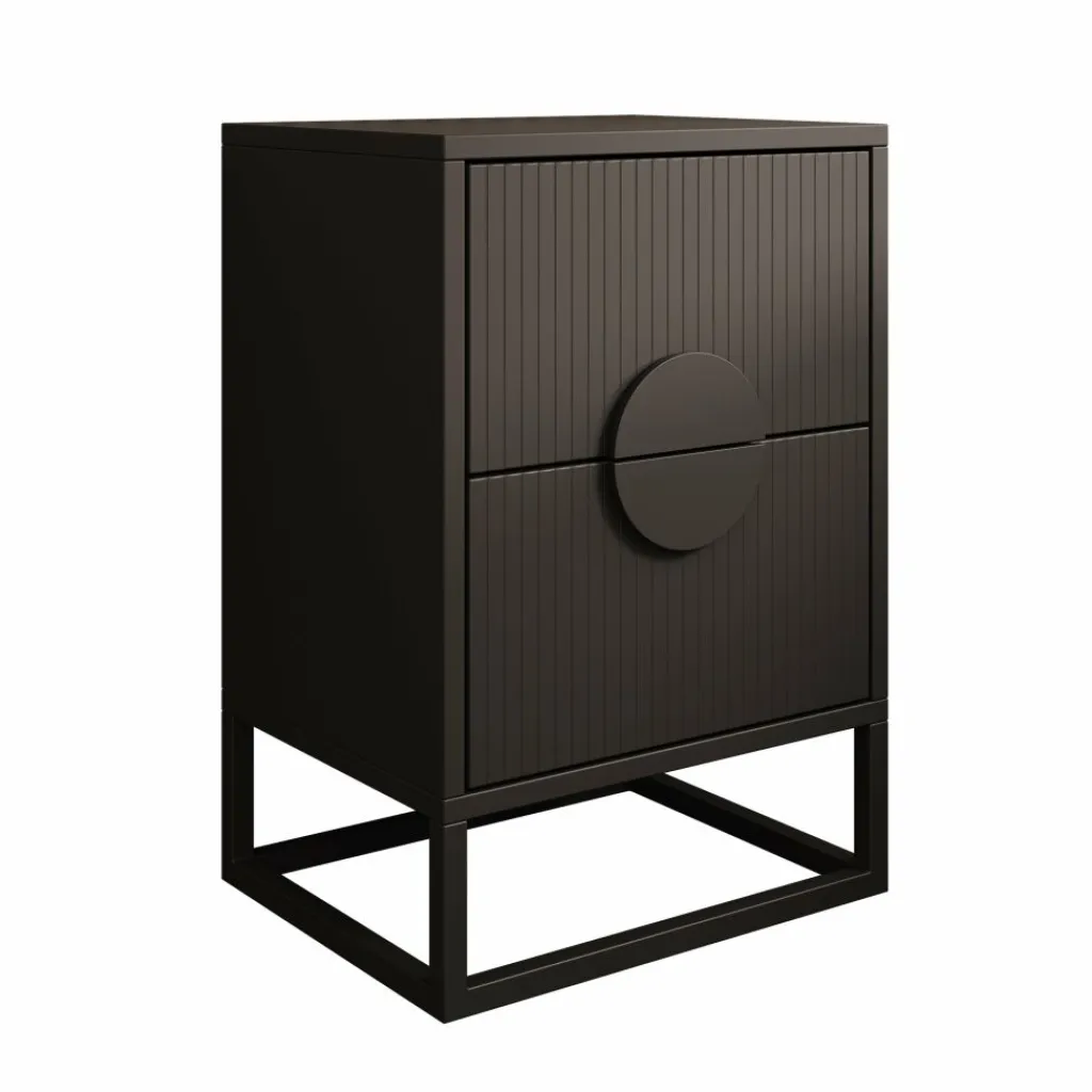 Het nachtkastje Allegany in zwart straalt moderne elegantie en luxe uit. De verticale lijnen en het ronde detail op de ladefronten geven het kastje een uniek en stijlvol karakter.