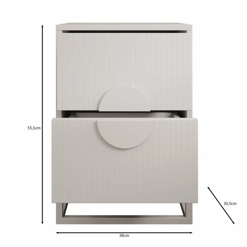 De twee lades zorgen voor praktische opbergruimte, perfect voor alles wat je graag binnen handbereik houdt. Het open metalen frame maakt het geheel luchtig en stevig tegelijk. Met een afmeting van 38x31x56 cm past dit nachtkastje perfect in een eigentijdse slaapkamer.