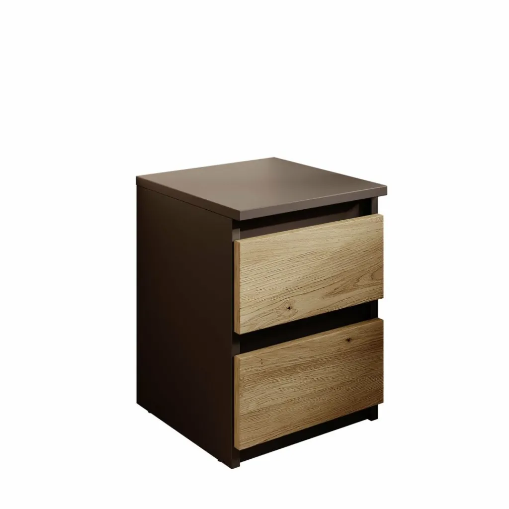 Het Masuka nachtkastje in antraciet is ontworpen als een compact en praktisch opbergmeubel voor naast het bed. Dankzij het formaat van 30 x 32 x 40 cm past het moeiteloos in kleinere ruimtes of naast een laag bedframe, terwijl de combinatie van een antraciet behuizing met houtkleurige fronten zorgt voor een warme, moderne uitstraling.
