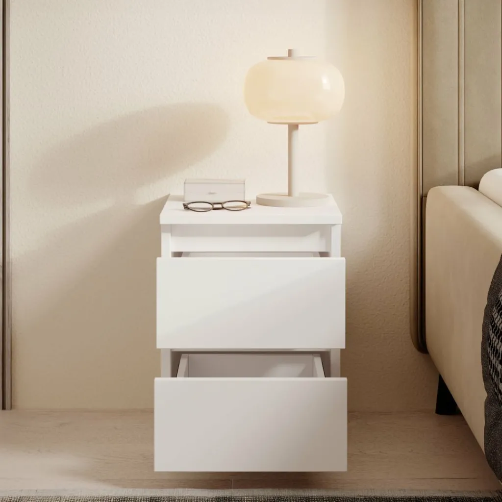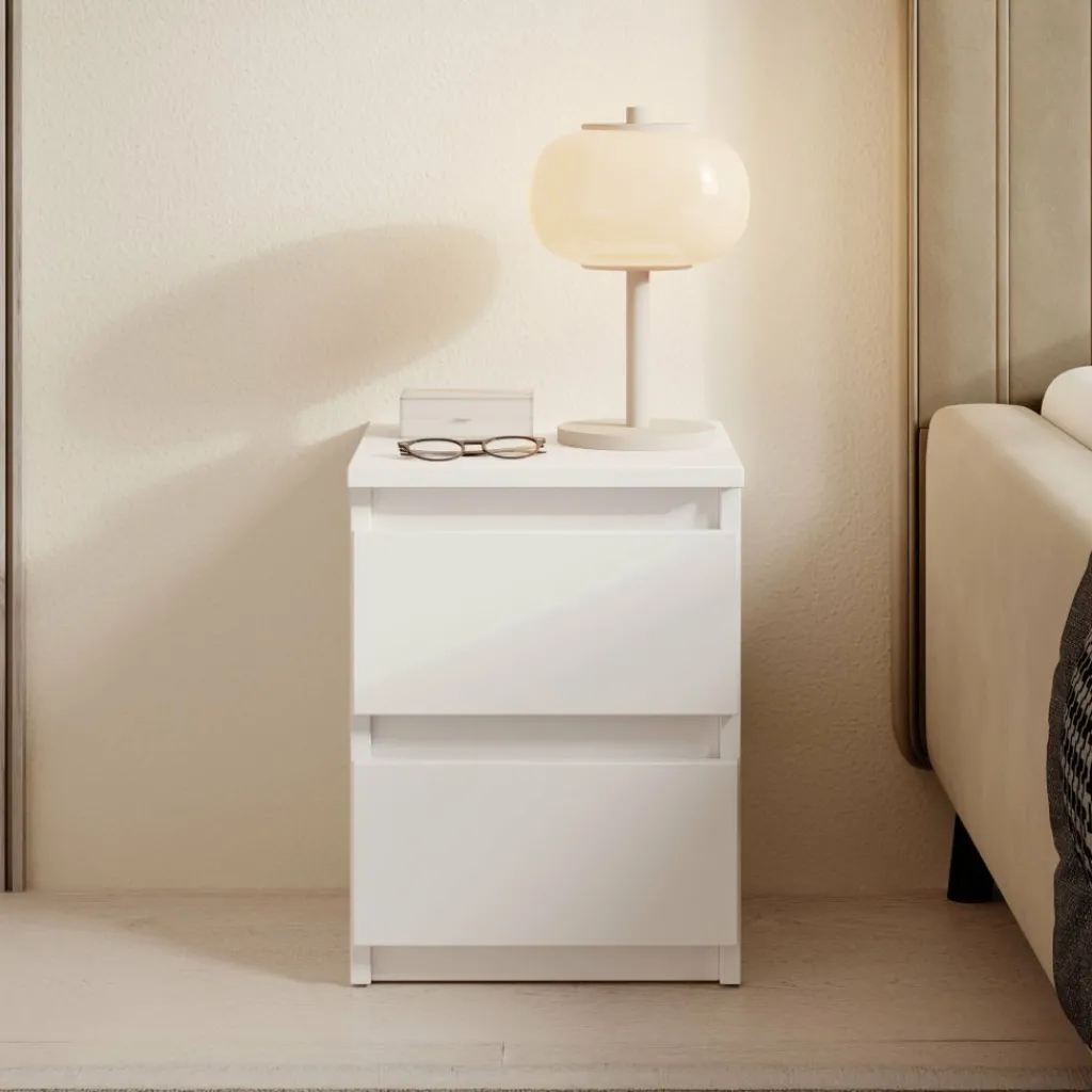 Het kastje beschikt over twee lades waarin je dagelijkse spullen netjes kunt opbergen, zoals accessoires, opladers of nachtleesmateriaal. De strakke fronten zonder zichtbare handgrepen zorgen voor een rustige en moderne uitstraling. Het bovenblad biedt ruimte voor een lamp, telefoon of decoratief item, zodat je alles wat je nodig hebt binnen handbereik hebt.