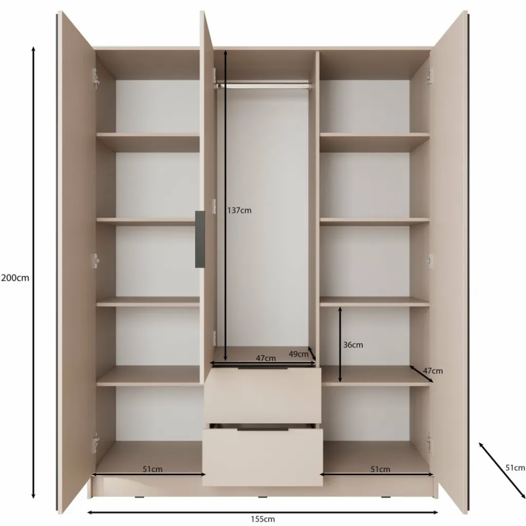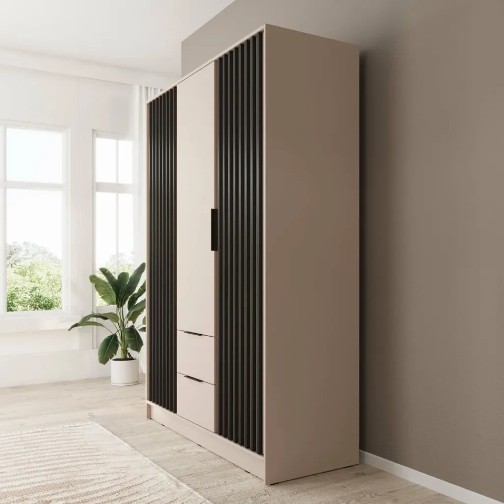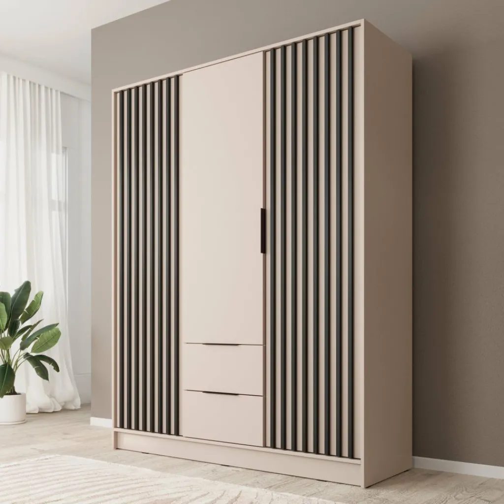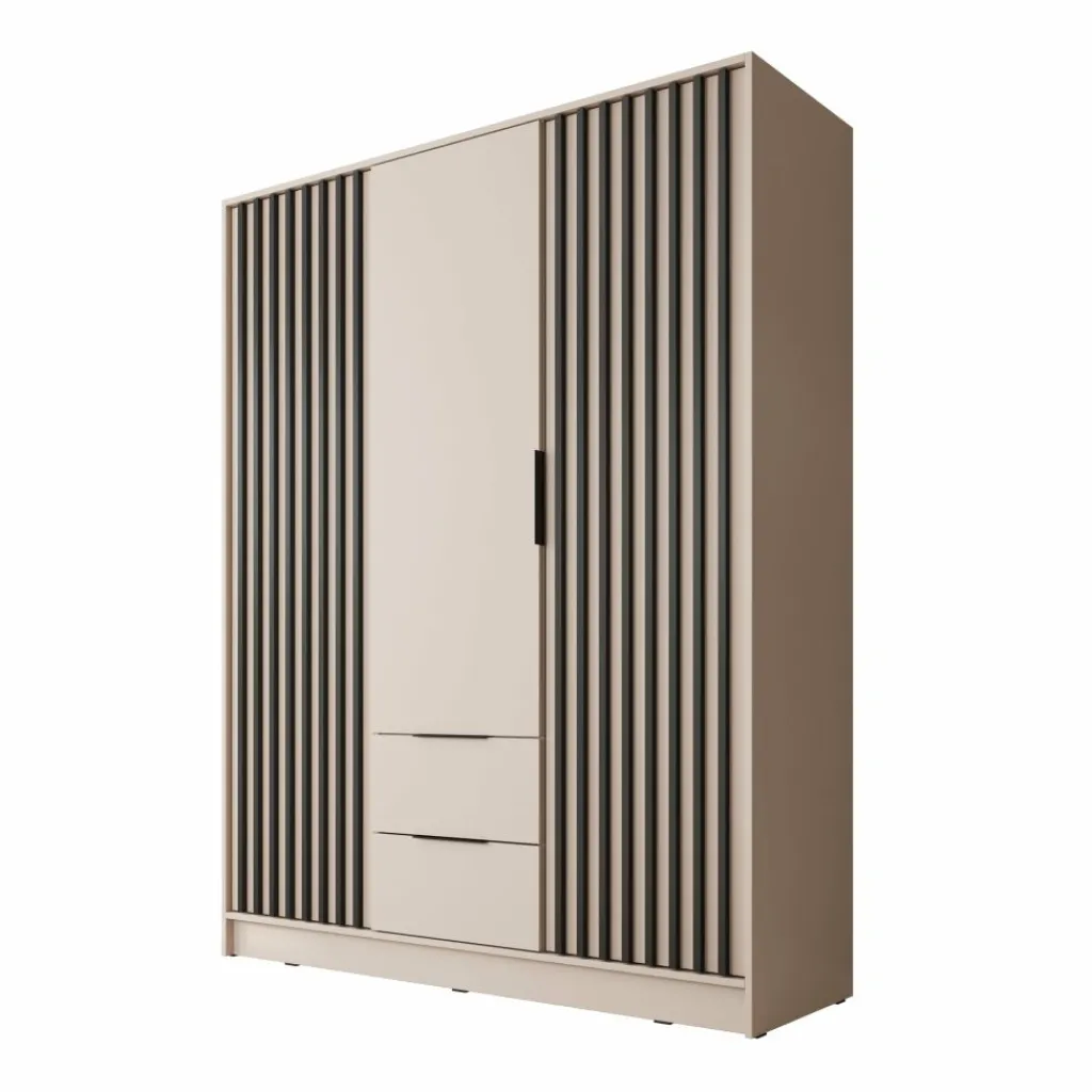 Kledingkast Nairobi is een garderobekast met ruime opbergmogelijkheden. Dit model is voorzien van drie klapdeuren. Het binnenwerk bestaat uit tien legplanken. In het midden van de kast is er een mogelijkheid om kleding op te hangen op de daarvoor bestemde kledingstang. Daaronder bevinden zich twee handige opberglades. Dit model is afgewerkt in beige kleur met zwarte latjes.