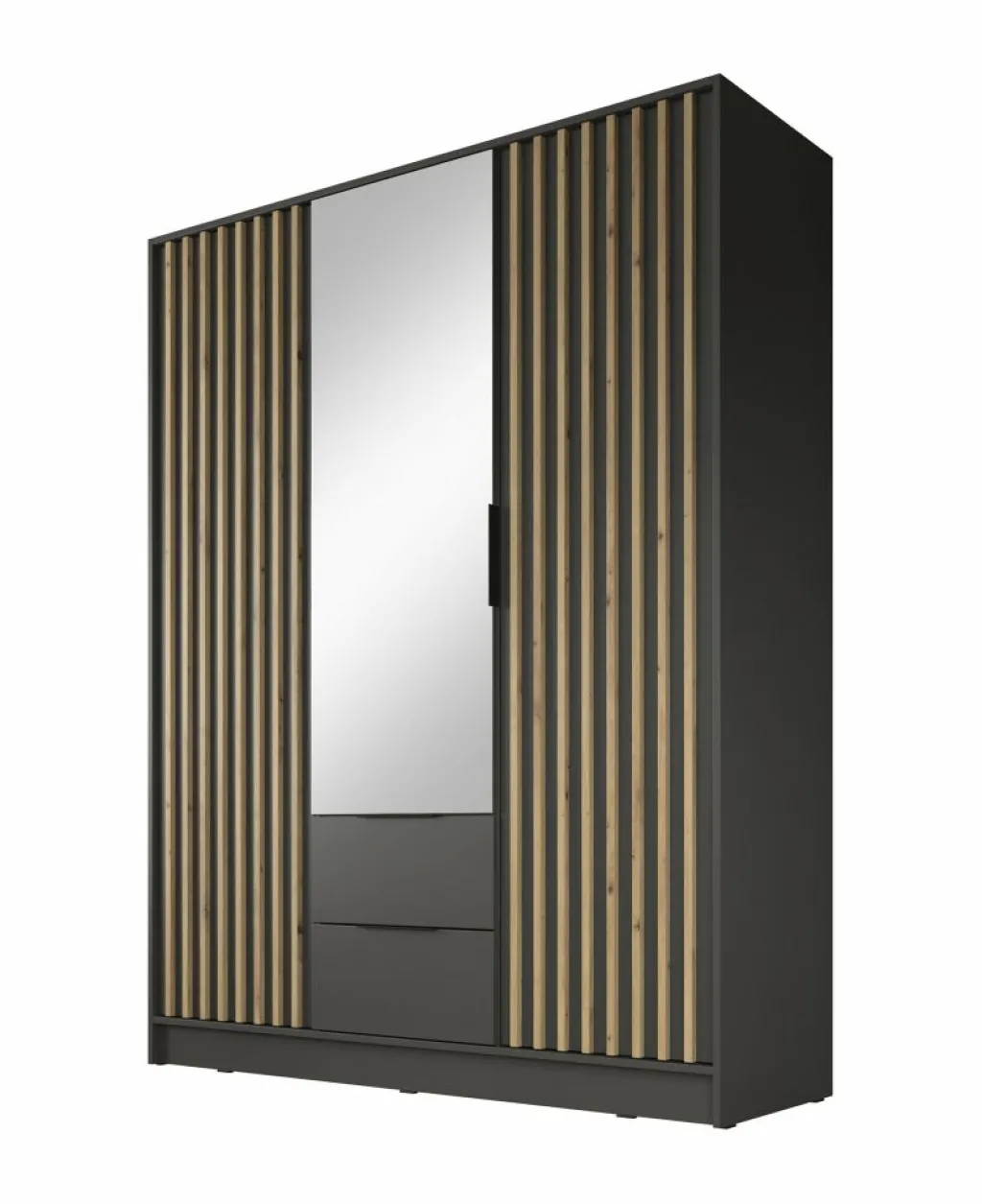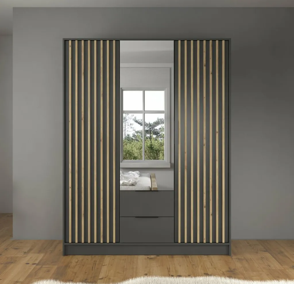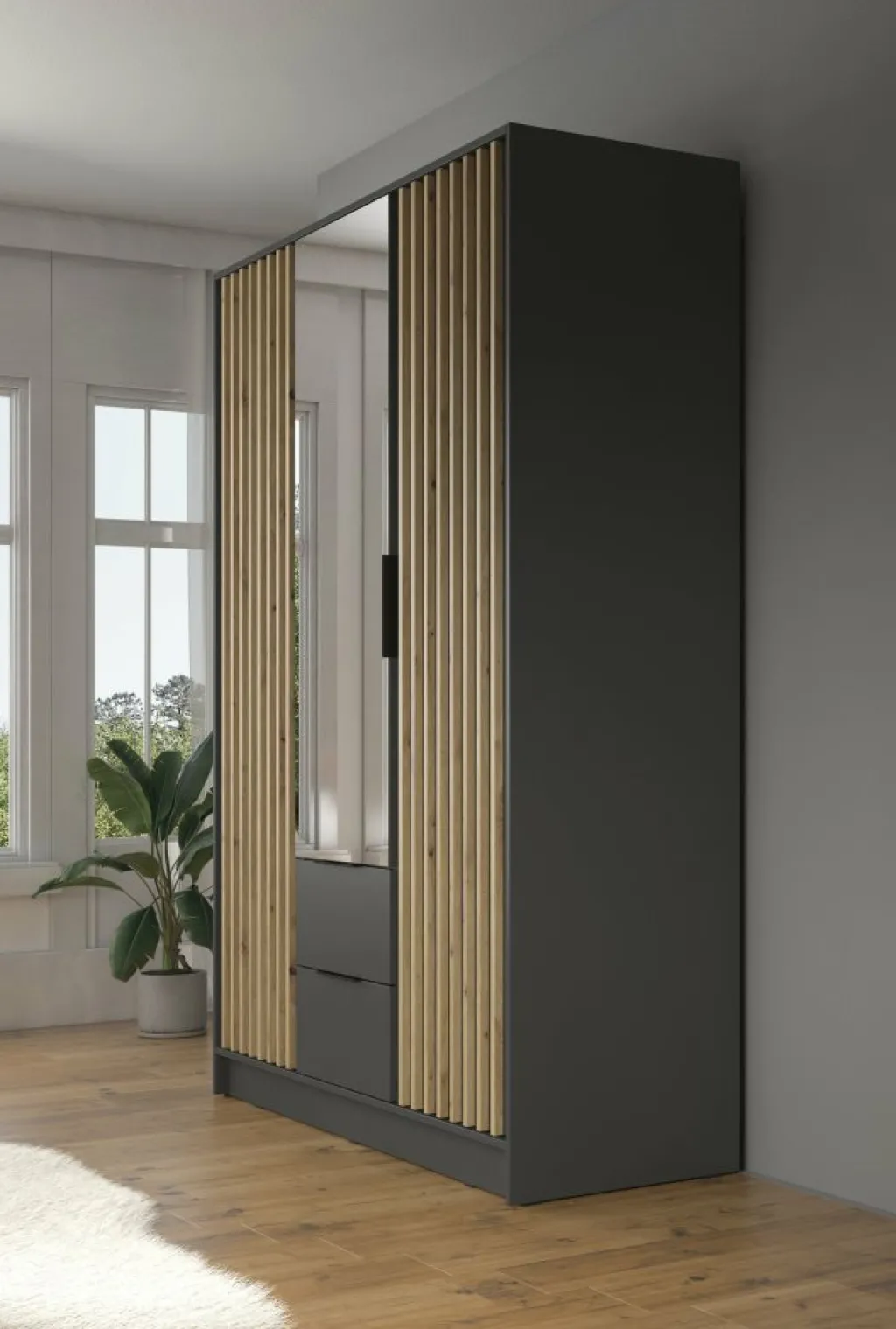 Kledingkast Nairobi is een garderobekast met ruime opbergmogelijkheden. Dit model is voorzien van drie klapdeuren. De middelste deur beschikt over een spiegel. Het binnenwerk bestaat uit tien legplanken. In het midden van de kast is er een mogelijkheid om kleding op te hangen op de daarvoor bestemde kledingstang. Daaronder bevinden zich twee handige opberglades. Dit model is afgewerkt in antraciet kleur met eiken kleurige details.