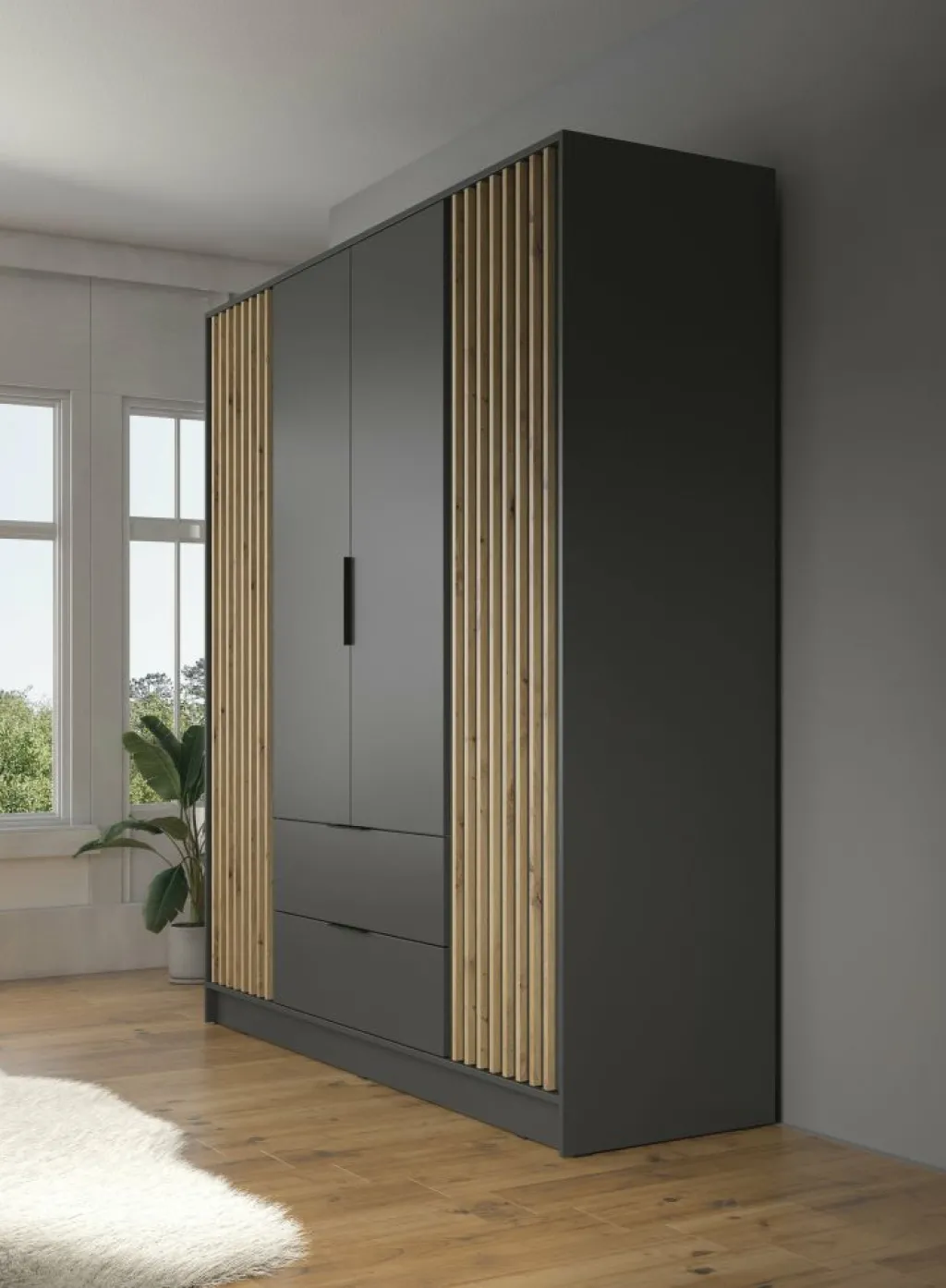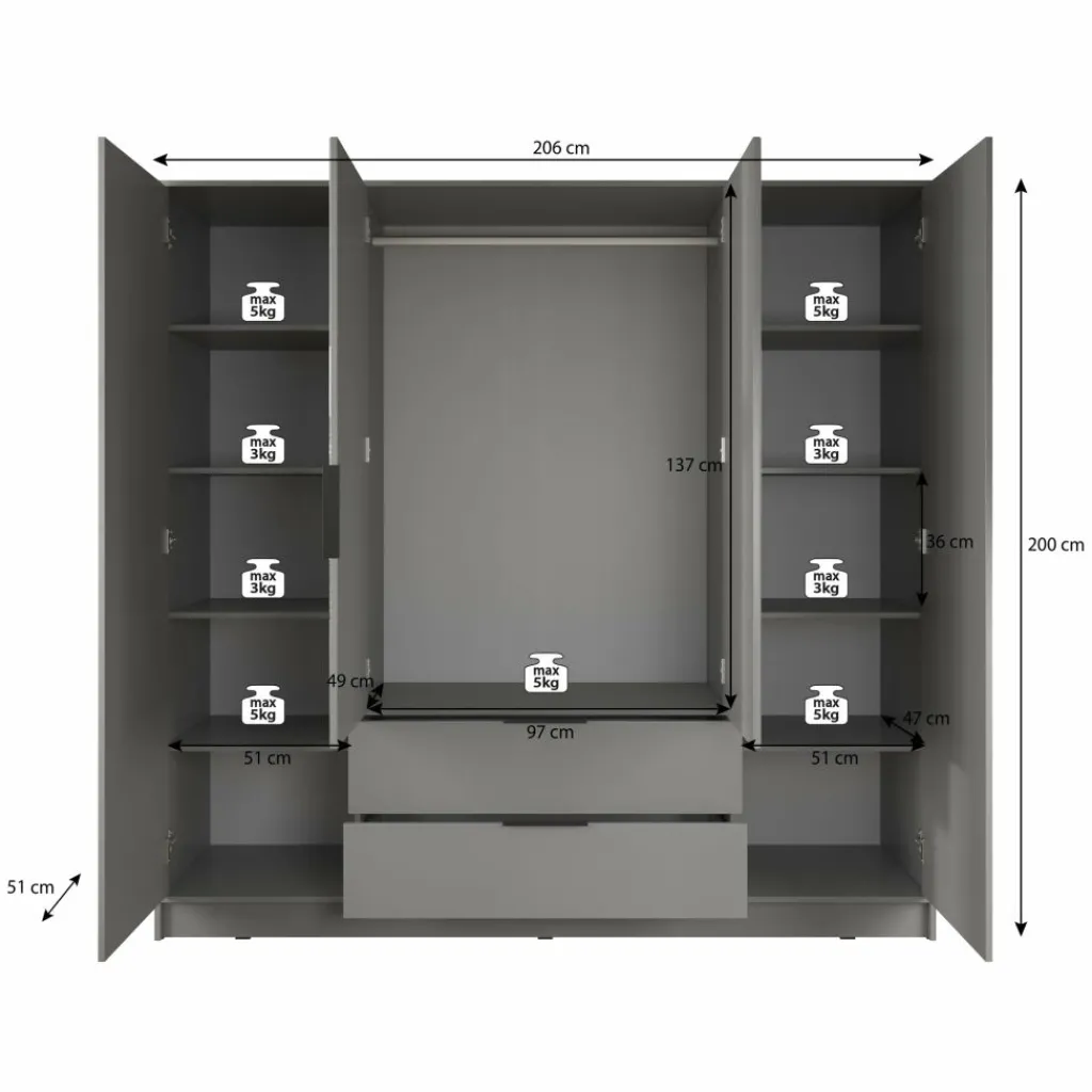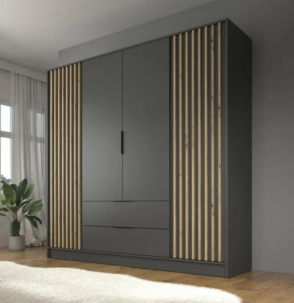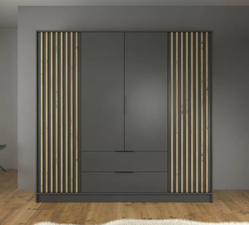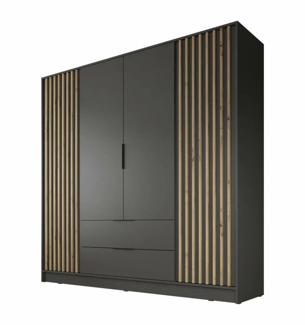 Kledingkast Nairobi is een garderobekast met ruime opbergmogelijkheden. Dit model is voorzien van vier klapdeuren. Het binnenwerk bestaat uit tien legplanken. In het midden van de kast is er een mogelijkheid om kleding op te hangen op de daarvoor bestemde kledingstang. Daaronder bevinden zich twee handige opberglades. Dit model is afgewerkt in antraciet kleur met eiken details.