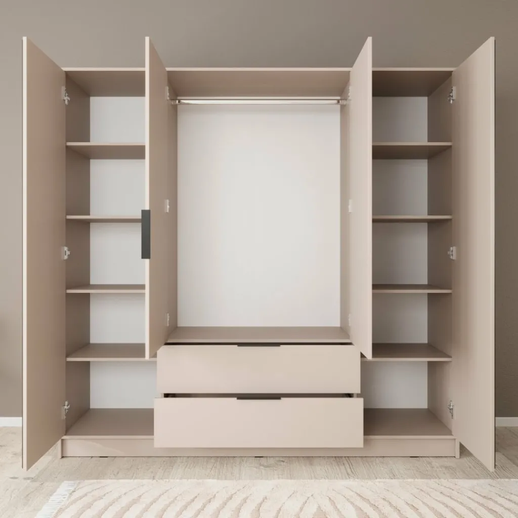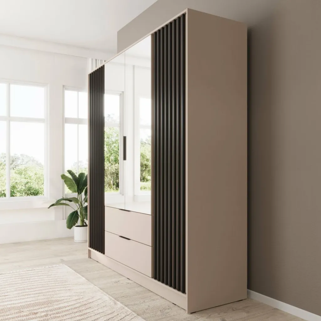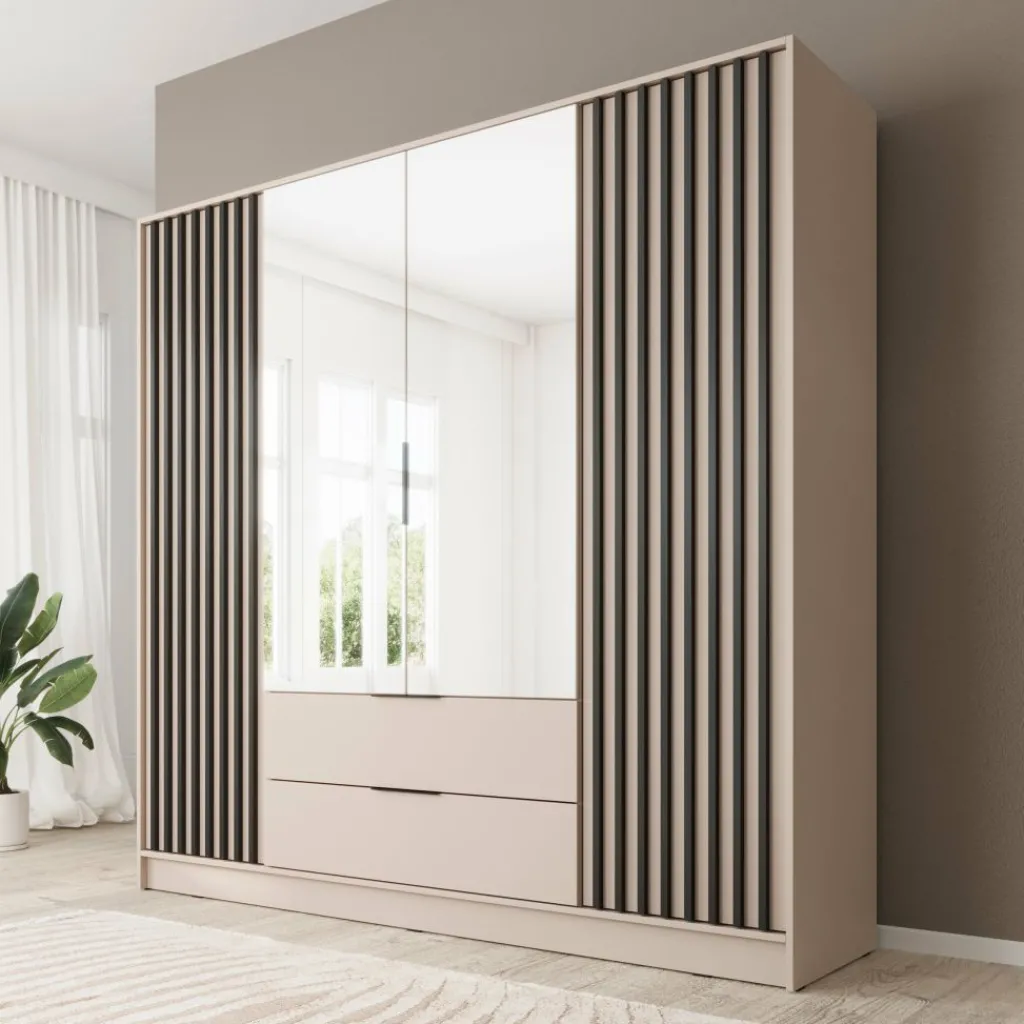 Kledingkast Nairobi is een garderobekast met ruime opbergmogelijkheden. Dit model is voorzien van vier klapdeuren. De middelste twee deuren beschikken over een spiegel. Het binnenwerk bestaat uit tien legplanken. In het midden van de kast is er een mogelijkheid om kleding op te hangen op de daarvoor bestemde kledingstang. Daaronder bevinden zich twee handige opberglades. Dit model is afgewerkt in beige kleur met zwarte latjes.