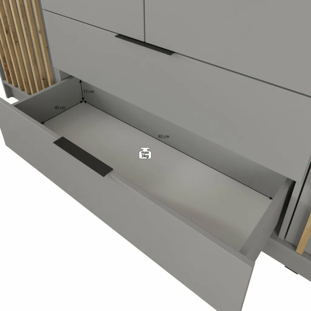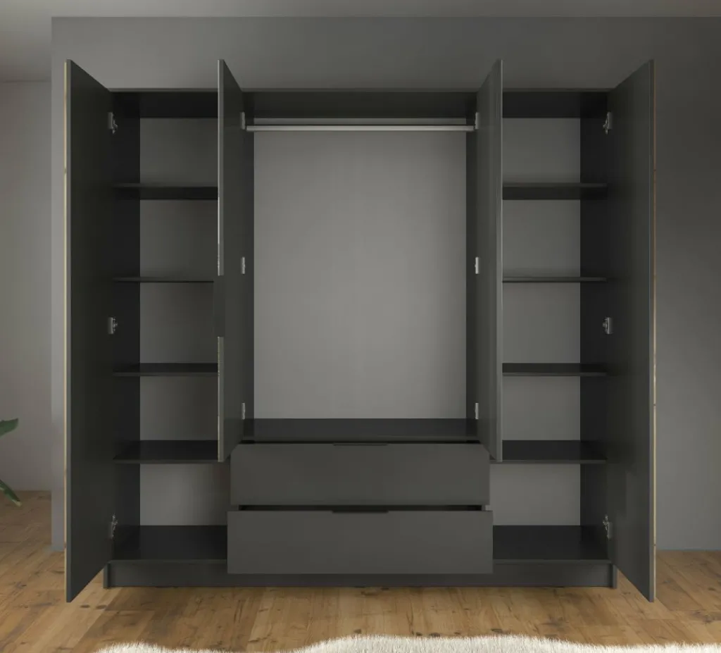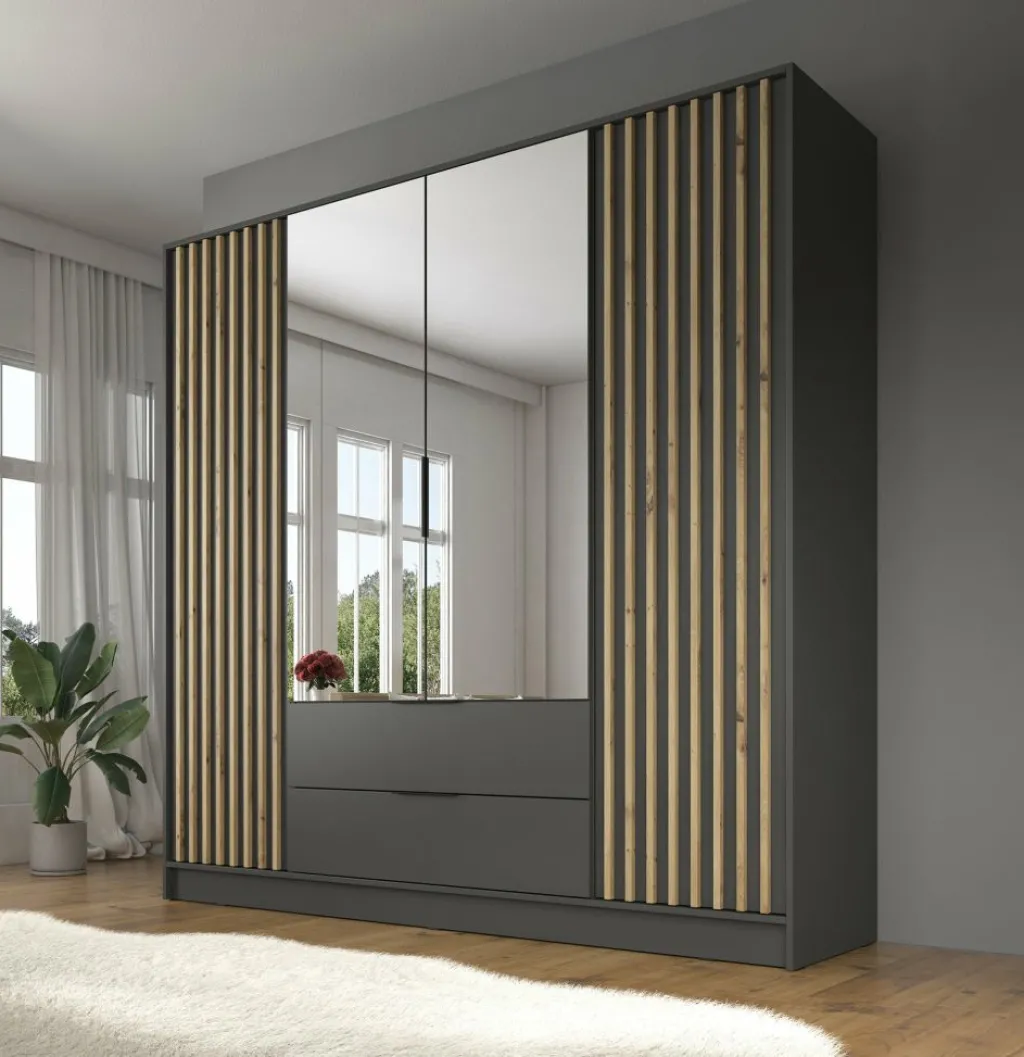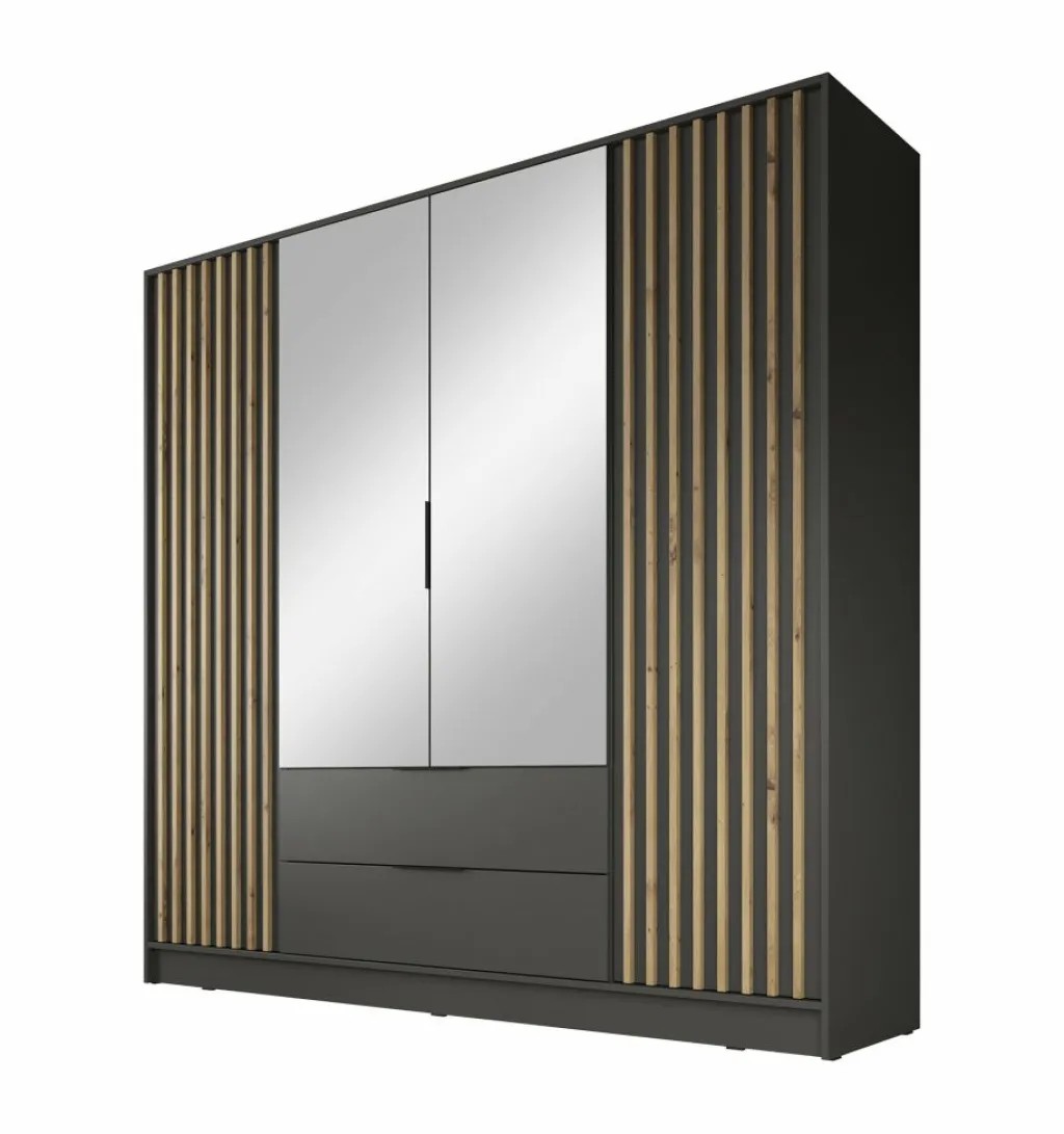 Kledingkast Nairobi is een garderobekast met ruime opbergmogelijkheden. Dit model is voorzien van vier klapdeuren. De middelste twee deuren beschikken over een spiegel. Het binnenwerk bestaat uit tien legplanken. In het midden van de kast is er een mogelijkheid om kleding op te hangen op de daarvoor bestemde kledingstang. Daaronder bevinden zich twee handige opberglades. Dit model is afgewerkt in antraciet kleur met eiken details.