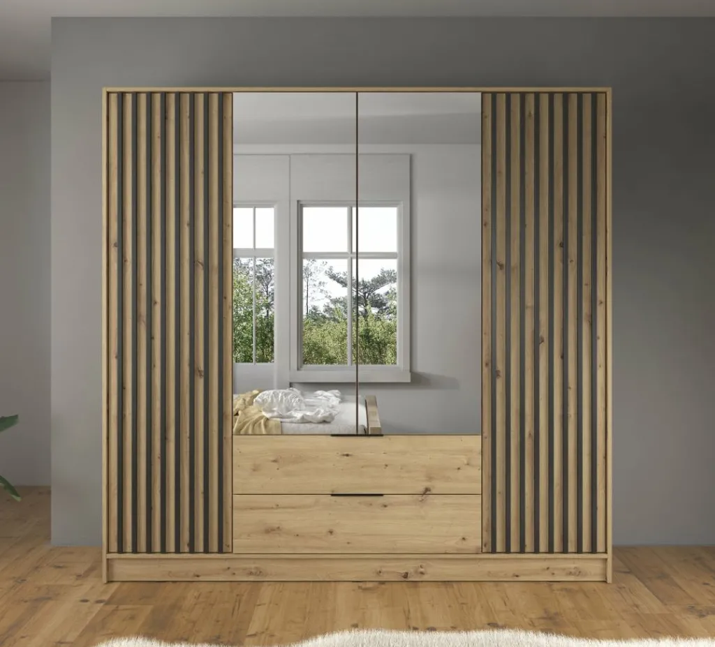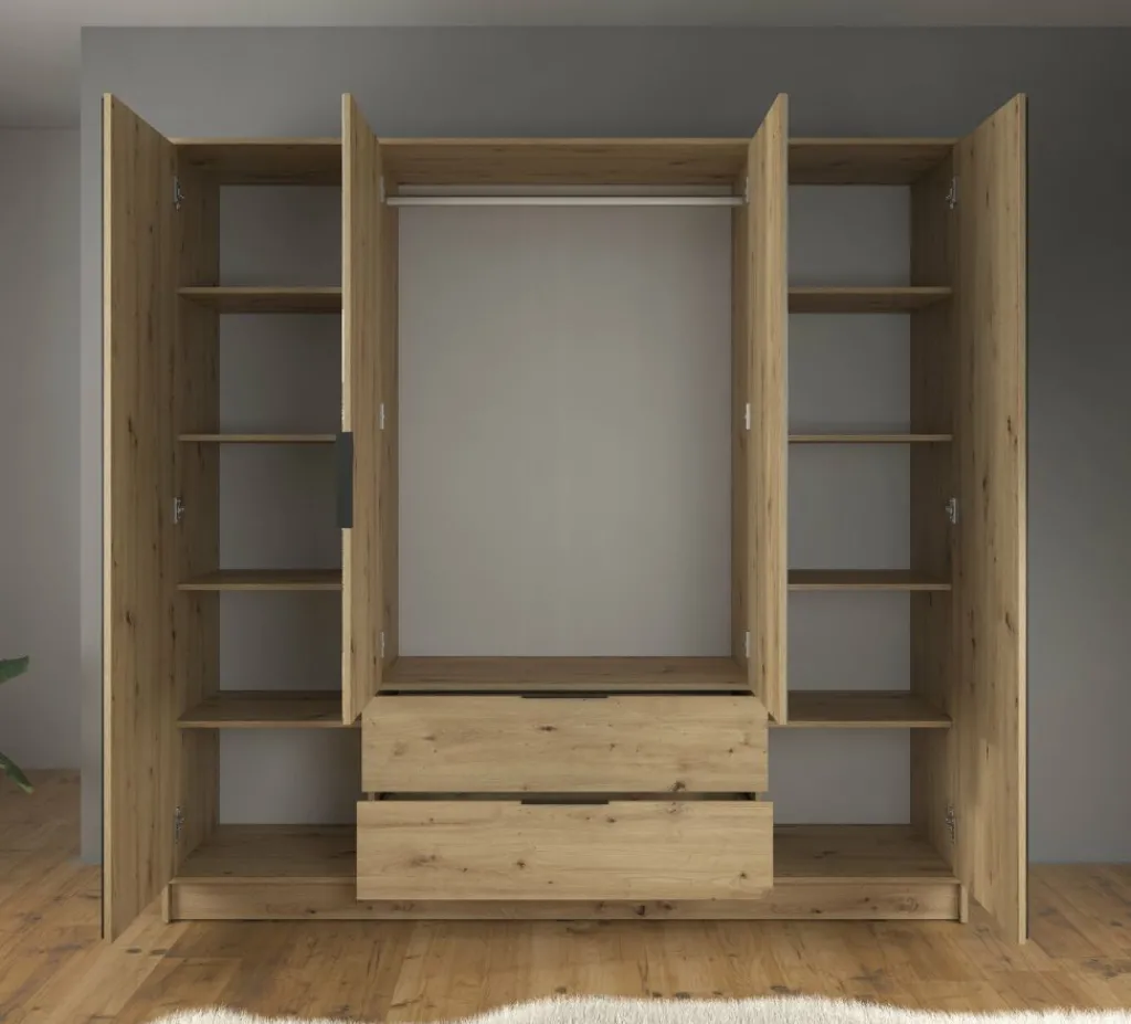 Kledingkast Nairobi is een garderobekast met ruime opbergmogelijkheden. Dit model is voorzien van vier klapdeuren. De middelste twee deuren beschikken over een spiegel. Het binnenwerk bestaat uit tien legplanken. In het midden van de kast is er een mogelijkheid om kleding op te hangen op de daarvoor bestemde kledingstang. Daaronder bevinden zich twee handige opberglades. Dit model is afgewerkt in eiken kleur met mat zwarte details.
