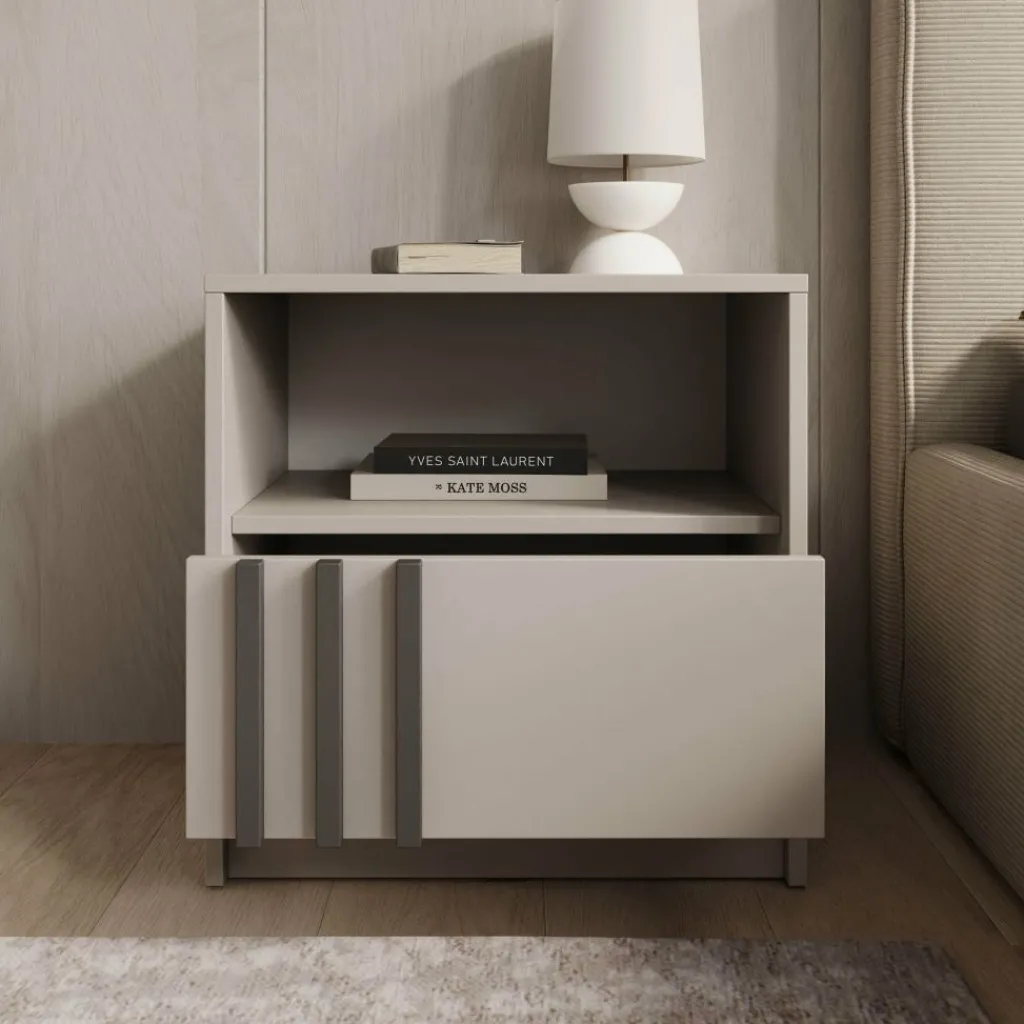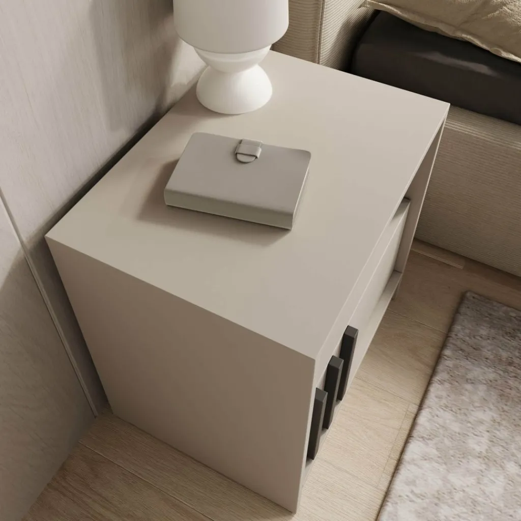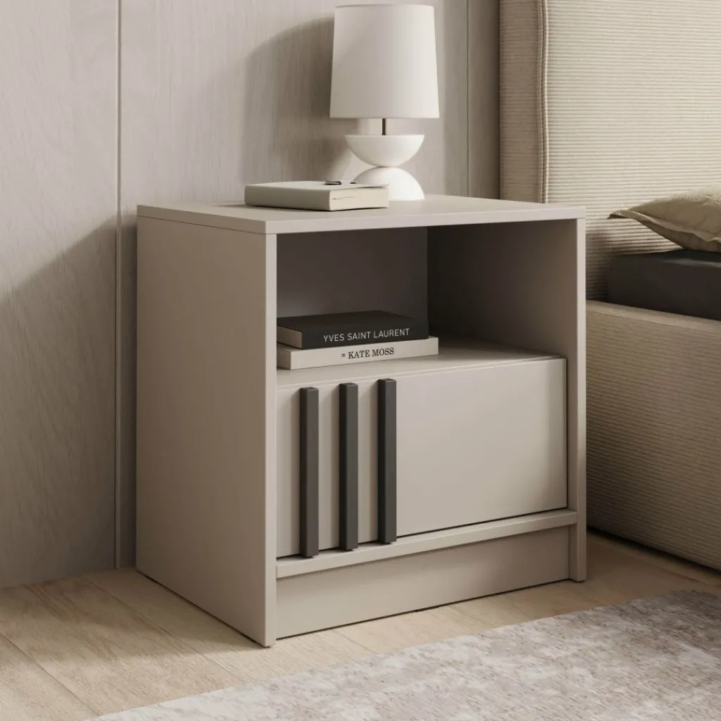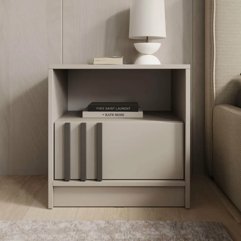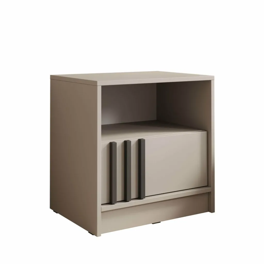 Het Nauru nachtkastje in beige straalt rust en verfijning uit en vormt een prachtige toevoeging aan iedere slaapkamer. De zachte beige kleur geeft het meubel een moderne, lichte uitstraling, terwijl de verticale handgrepen in contrasterend antraciet zorgen voor een subtiel en stijlvol detail. Het open vak is ideaal voor boeken, tijdschriften of decoratieve items, terwijl je achter de deur je persoonlijke spullen netjes uit het zicht kunt opbergen. Dankzij zijn compacte formaat en praktische indeling combineert dit nachtkastje moeiteloos functionaliteit met eigentijds design.
