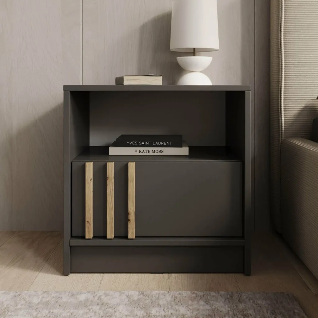 Het Nauru nachtkastje in antraciet combineert praktisch gebruiksgemak met een stijlvolle, moderne uitstraling. De donkere kleur geeft het meubel een strakke en elegante look, terwijl de verticale handgrepen in houtkleur zorgen voor een warm en speels contrast. Het open vak biedt ruimte voor boeken, accessoires of een nachtlampje, en achter de deur kun je eenvoudig al je kleinere spullen opbergen. Dankzij het compacte formaat is dit kastje ideaal naast ieder bed en past het moeiteloos in diverse slaapkamerstijlen, van modern tot industrieel.