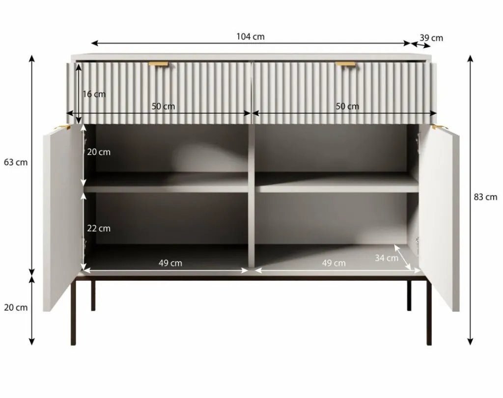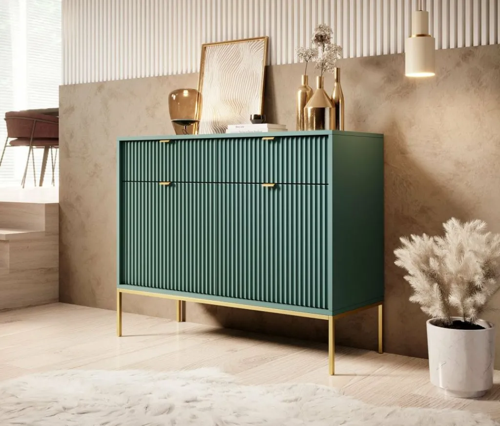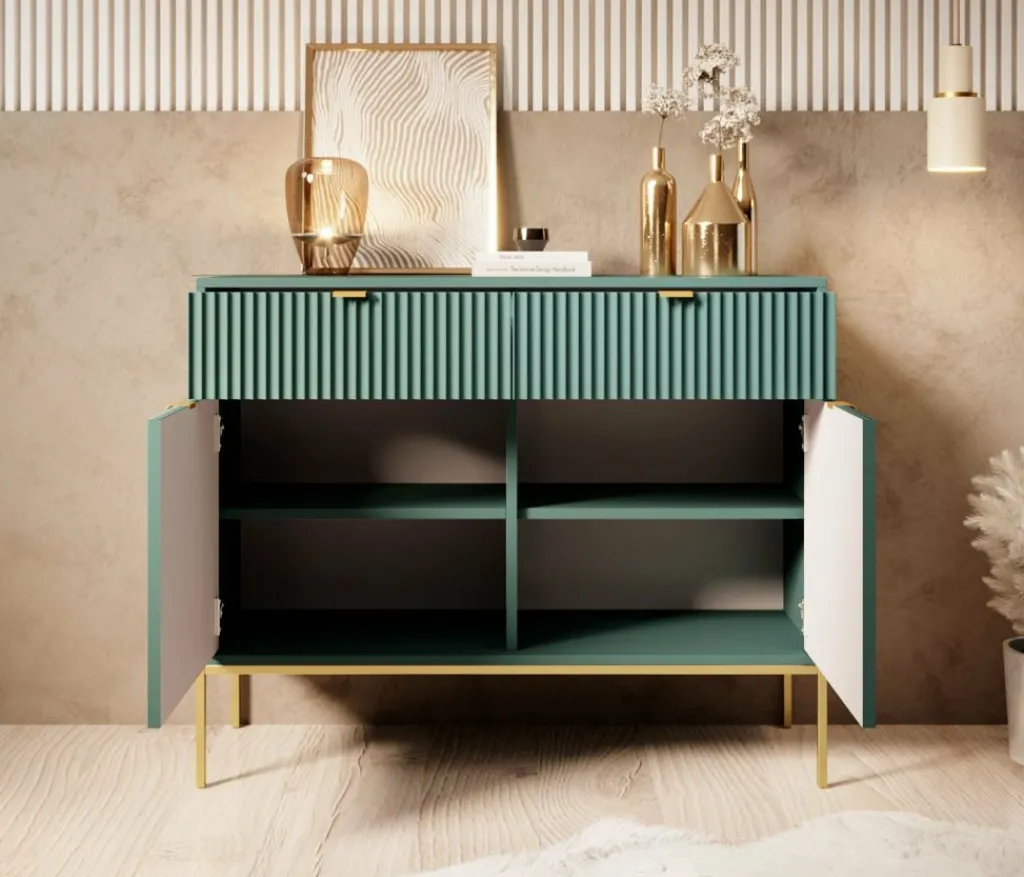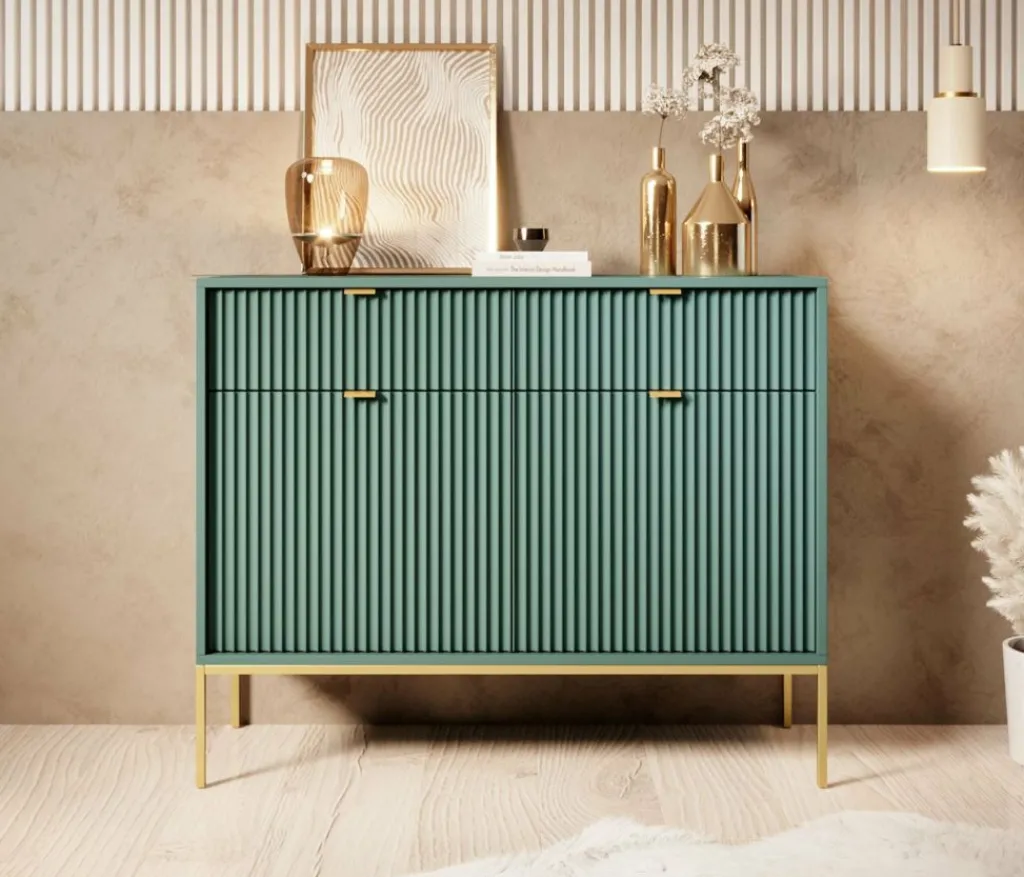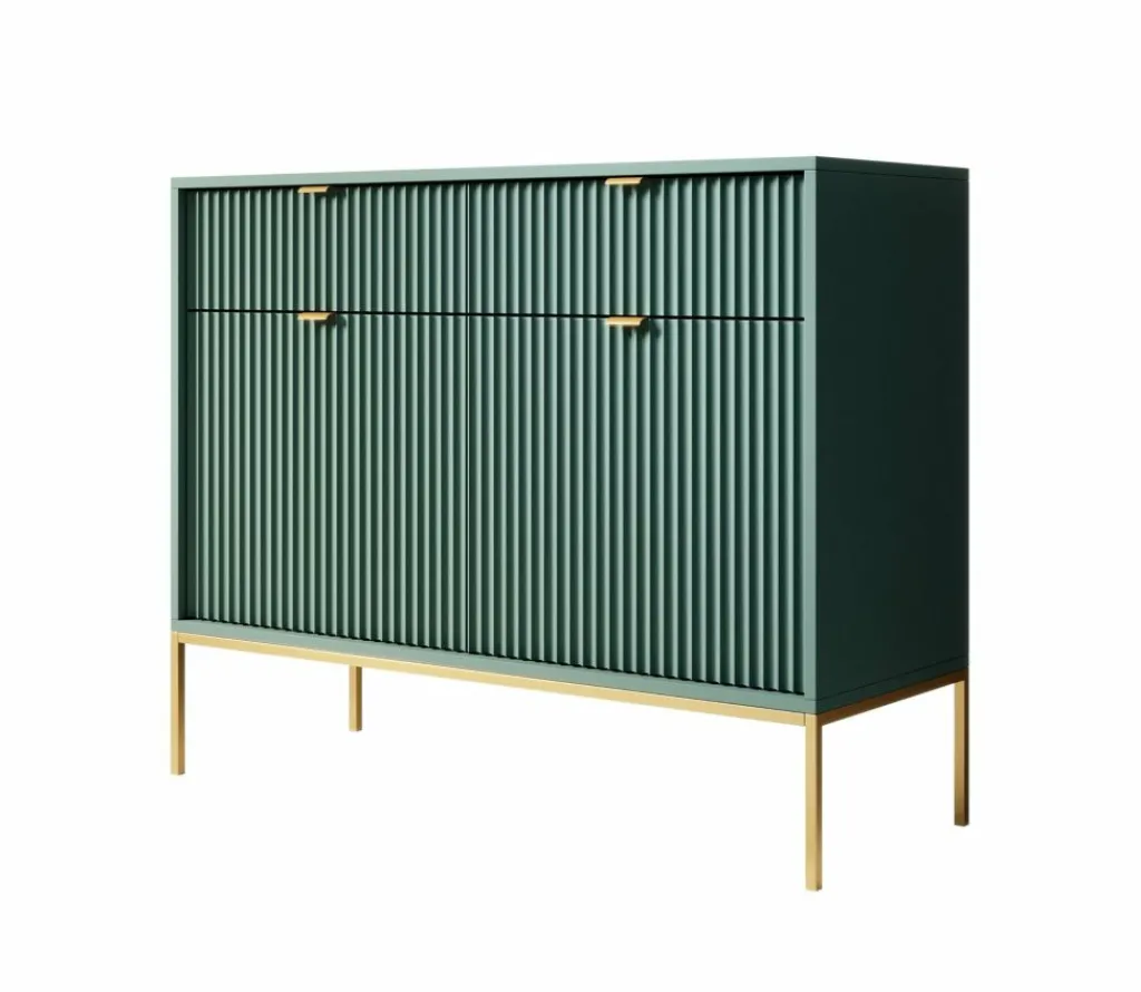 Dressoir Navil is een moderne designkast, uitgevoerd in een groene kleur. De kast beschikt over twee openslaande deuren met daarachter 4 opbergvakken. De deuren openen door middel van goudkleurige handgrepen. Daarboven bevinden zich twee handige opberglades. De kast staat op goudkleurige hoge pootjes. Door het strakke en eenvoudige design is dit meubel vooral passend binnen een industriële en hotelchique woonstijl.