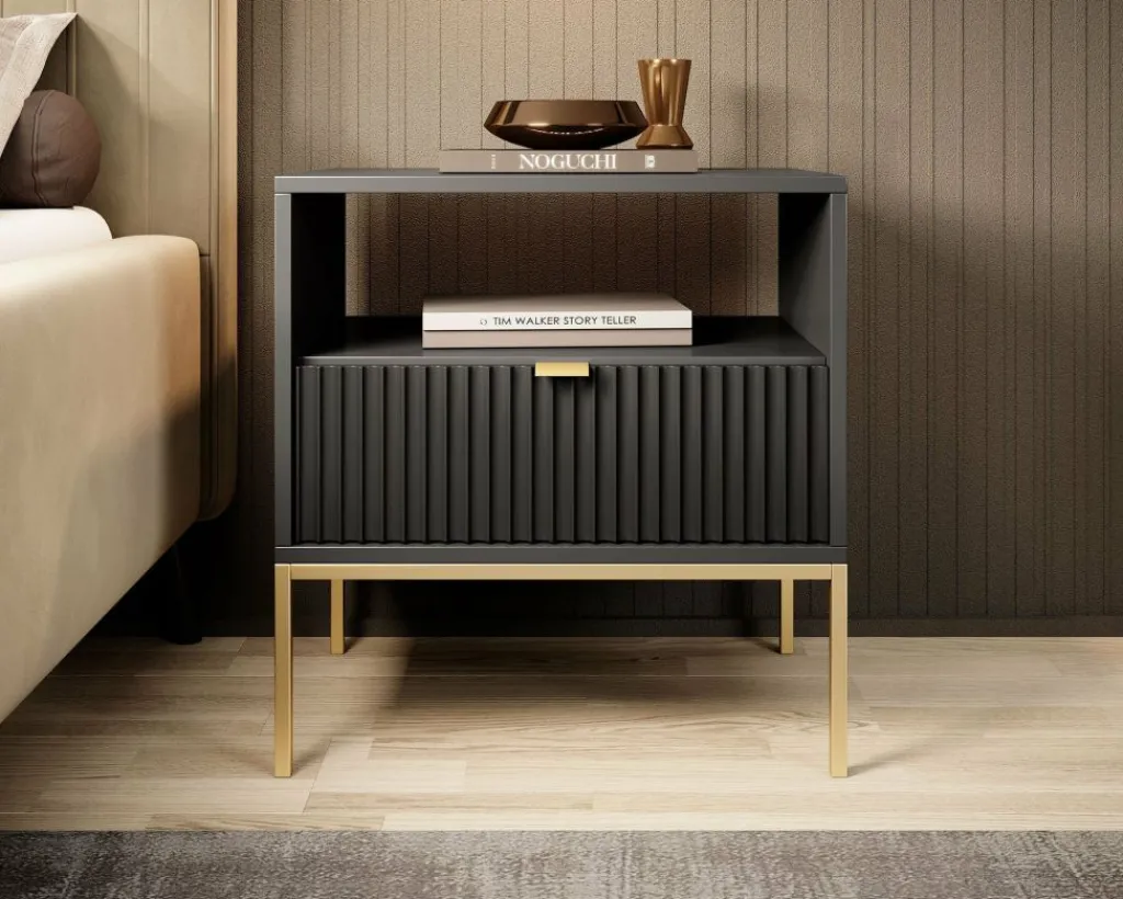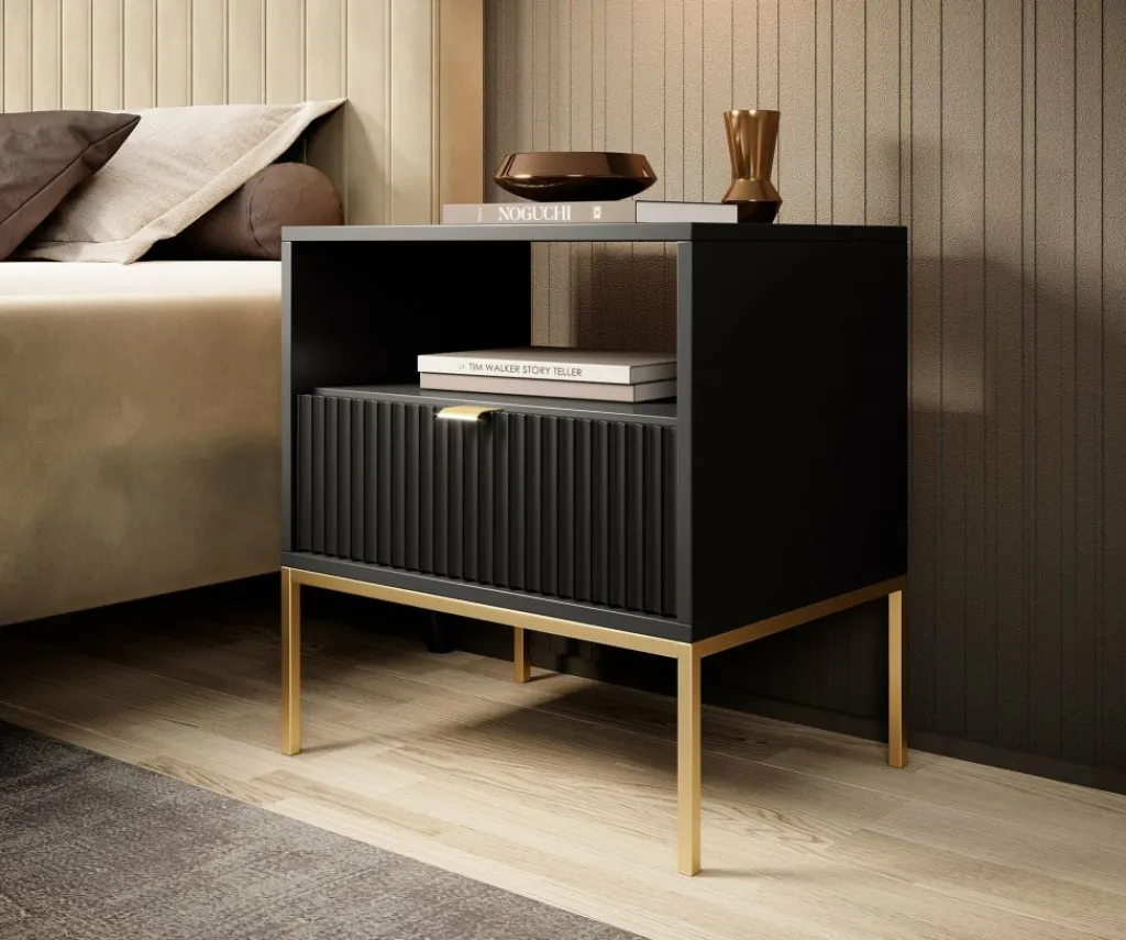 Nachtkastje Navil is een praktische opbergkast met voldoende opbergruimte. Onderin bevindt zich een handige opberglade, deze is te openen met een goudkleurige handgreep. Voor extra opbergruimte is er een open schap aanwezig bovenin het nachtkastje. Vanwege zijn design is het nachtkastje passend in elke soort slaapkamer.