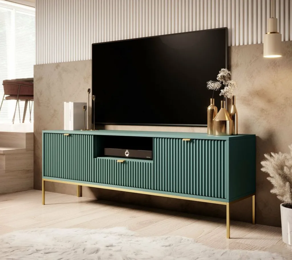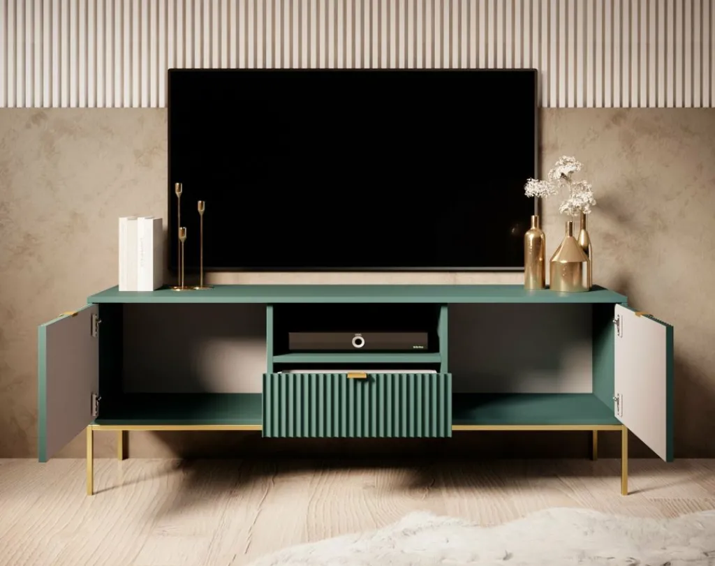 TV-meubel Navil is een design meubel met voldoende opbergmogelijkheden. Deze kast heeft een breedte van 154 centimeter en is gemaakt van spaanplaat met een melamine coating in groene kleur. Dankzij het kleurgebruik en design is dit meubel geschikt voor zowel industriële als hotelchique interieurs. De kast beschikt over twee klepdeuren welke te openen zijn via goudkleurige handgrepen. In het middel bevindt zich een open schap met daaronder een lade. Ook deze is te openen door een goudkleurige handgreep. Aan de achterzijde bevindt zich een gat om eventuele bedrading weg te werken.