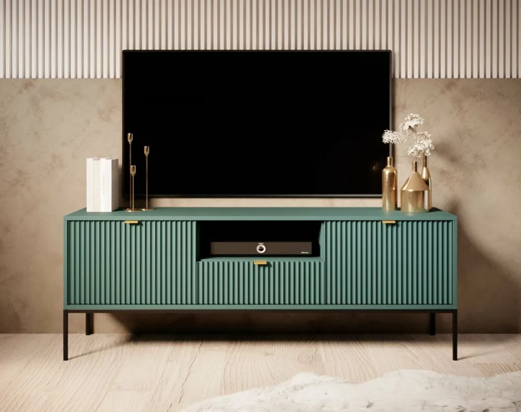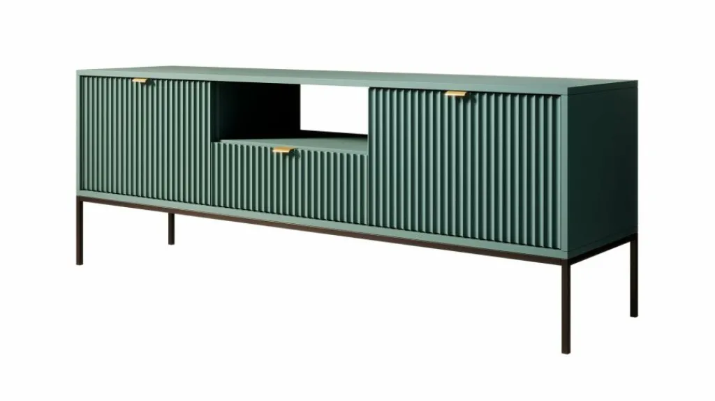 TV-meubel Navil is een design meubel met voldoende opbergmogelijkheden. Deze kast heeft een breedte van 154 centimeter en is gemaakt van spaanplaat met een melamine coating in groene kleur. Dankzij het kleurgebruik en design is dit meubel geschikt voor zowel industriële als hotelchique interieurs. De kast beschikt over twee kleppen welke te openen zijn via goudkleurige handgrepen. In het middel bevindt zich een open vak met daaronder een lade. Ook deze is te openen door een goudkleurige handgreep. Aan de achterzijde bevindt zich een gat om eventuele bedrading weg te werken.