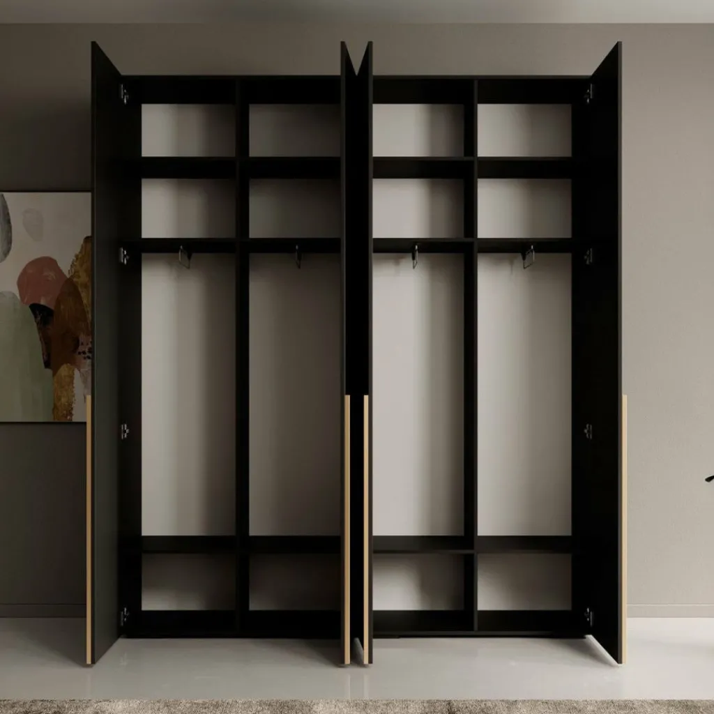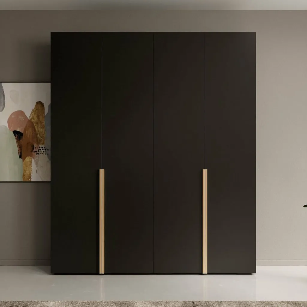De Nexus kledingkast combineert strak design met praktische opbergruimte. Dankzij de matte zwarte afwerking krijgt de kast een moderne en stijlvolle uitstraling die perfect past in een eigentijdse slaapkamer. De hoge, slanke deuren met subtiele handgrepen zorgen voor een minimalistische look, terwijl de royale binnenruimte volop plek biedt voor kleding, schoenen en accessoires.