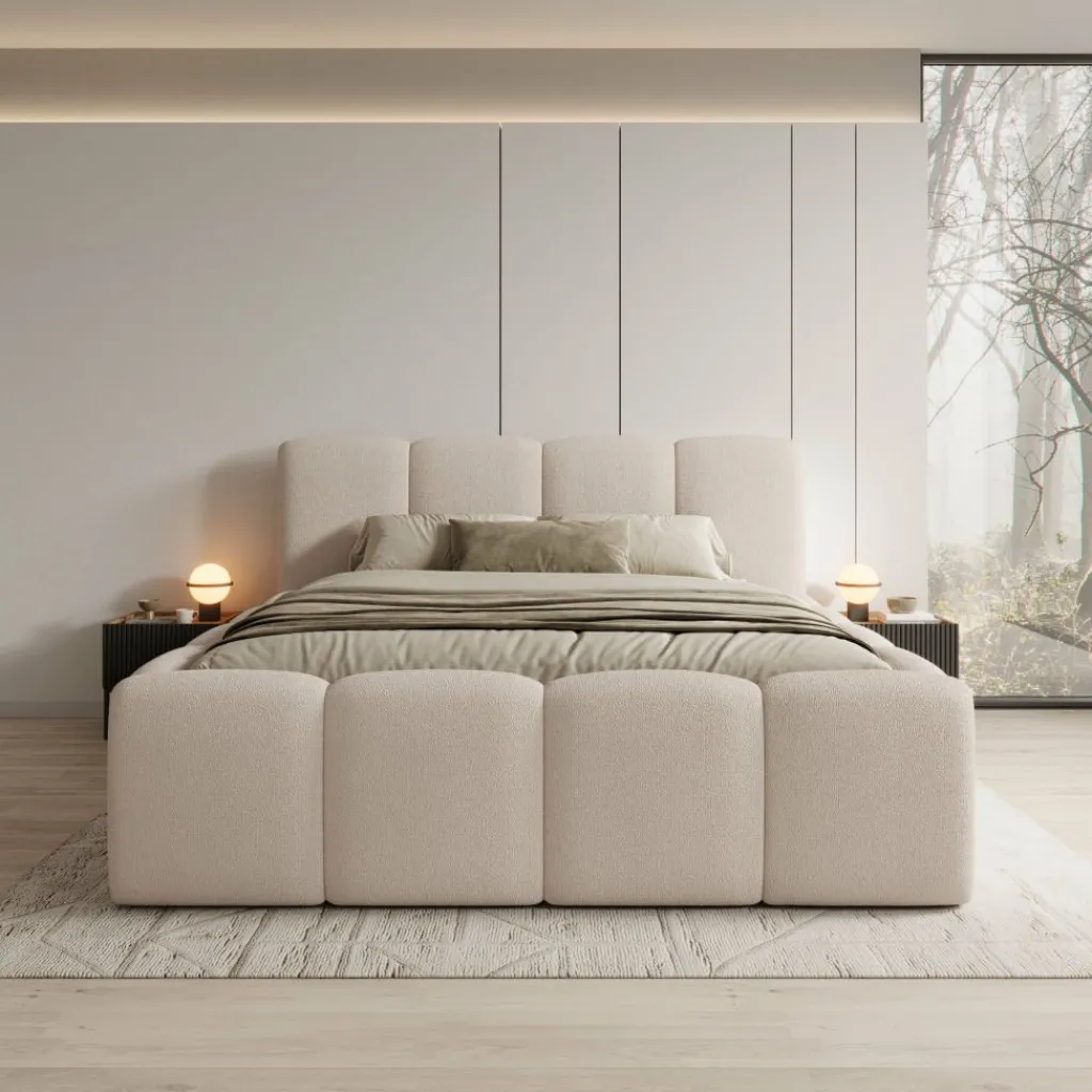 Het grotere formaat geeft het bed een stevige, royale basis. De omlijsting rondom het matras volgt dezelfde zachte blokvormen als het hoofdbord, waardoor het geheel naadloos in elkaar overloopt. De constructie is stabiel en geschikt voor dagelijks gebruik. Het lage onderstel is subtiel weggewerkt zodat de vorm centraal blijft staan.