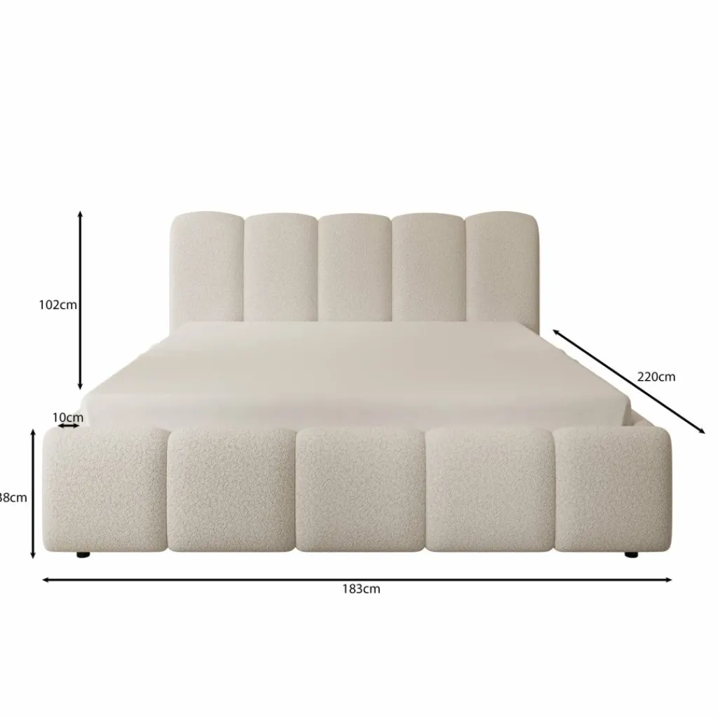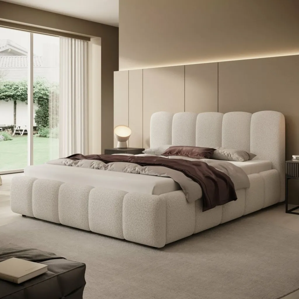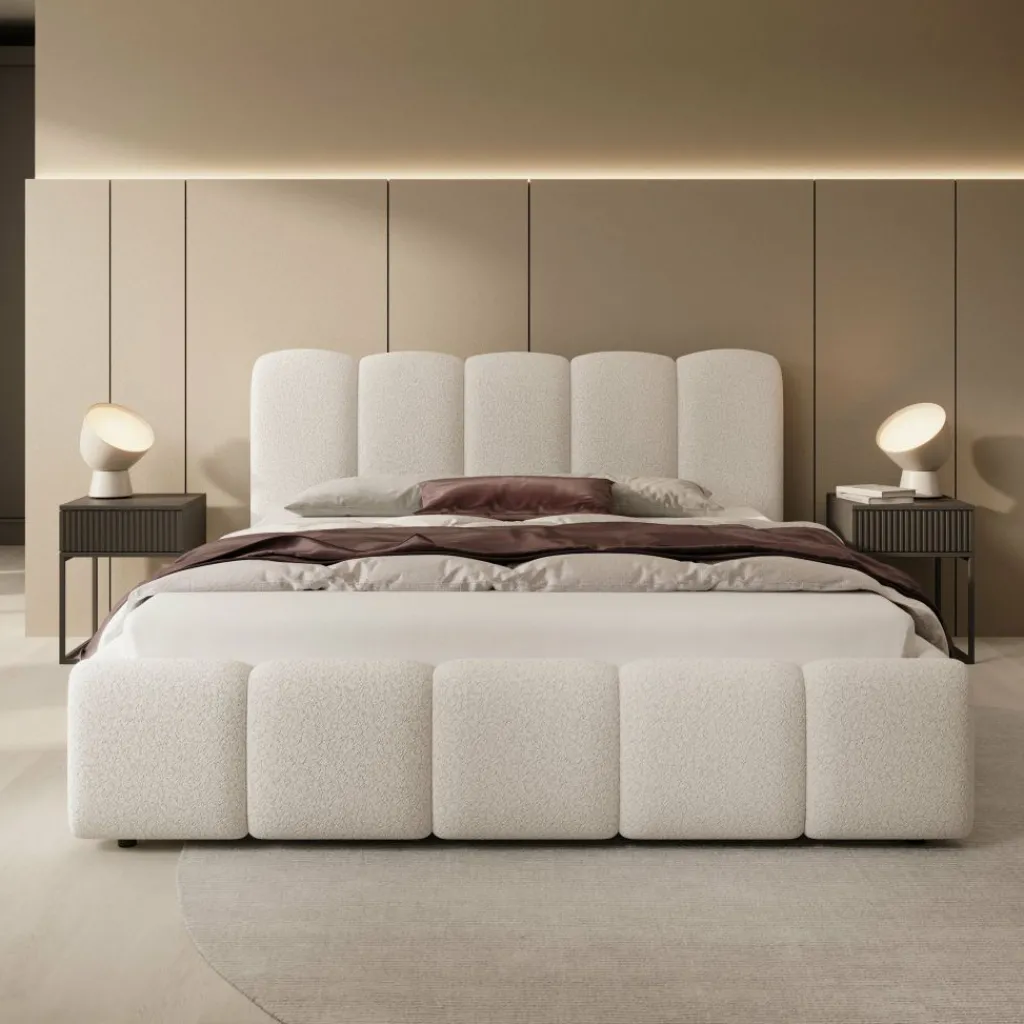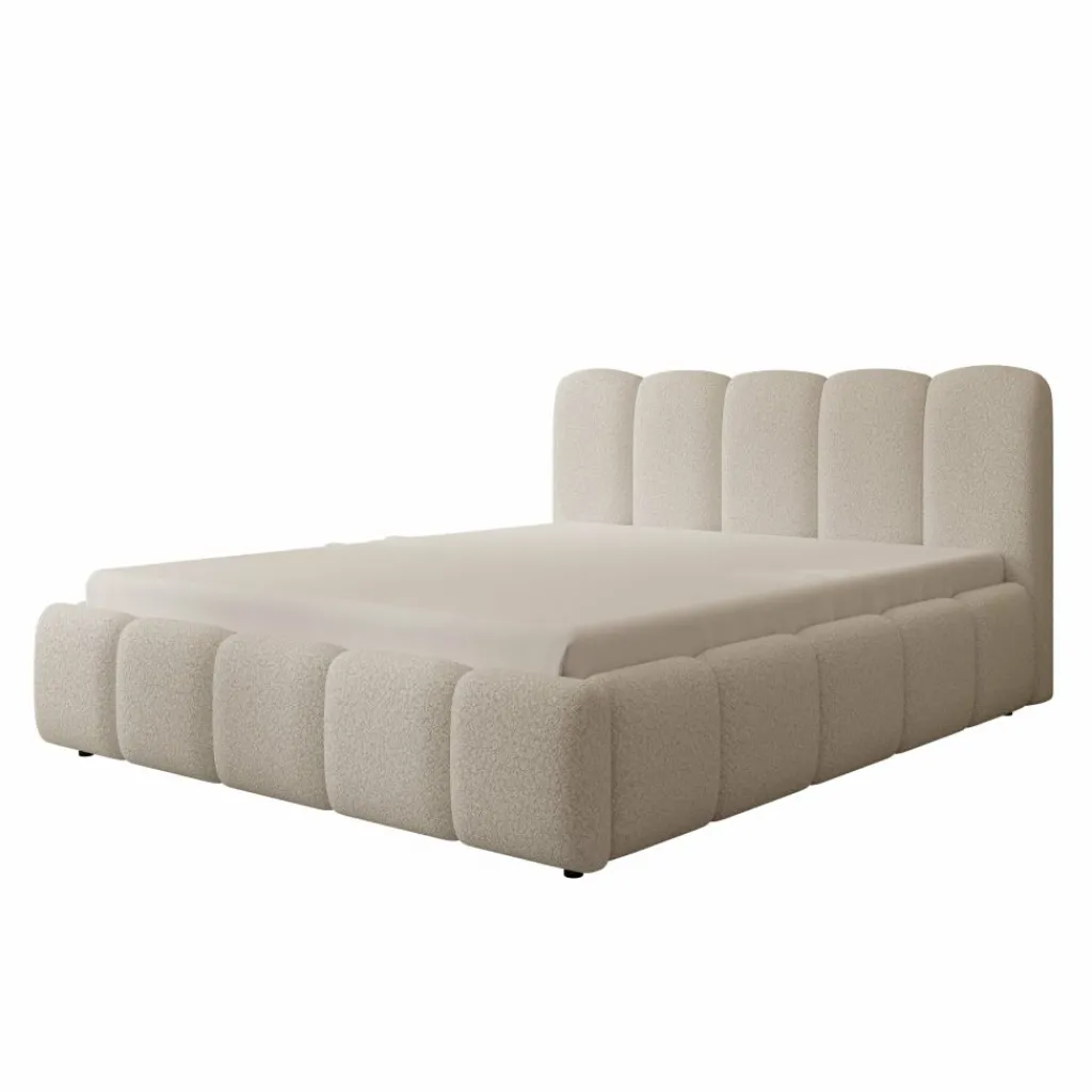 Tweepersoonsbed Nolena is bekleed met zachte beige teddystof en heeft een opvallend design met afgeronde vormen. Het hoofdbord en het bedframe zijn rondom voorzien van brede, gewatteerde panelen die zorgen voor een volle uitstraling.