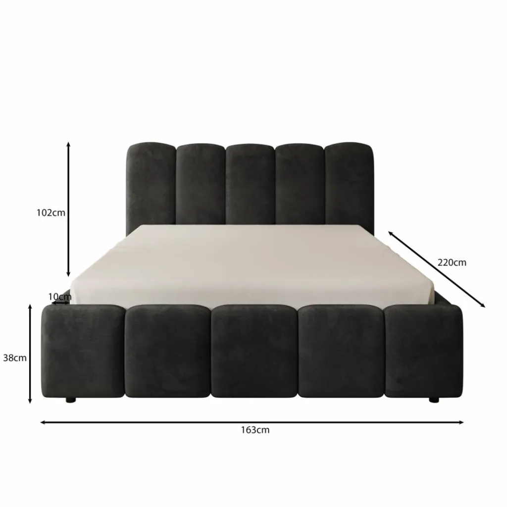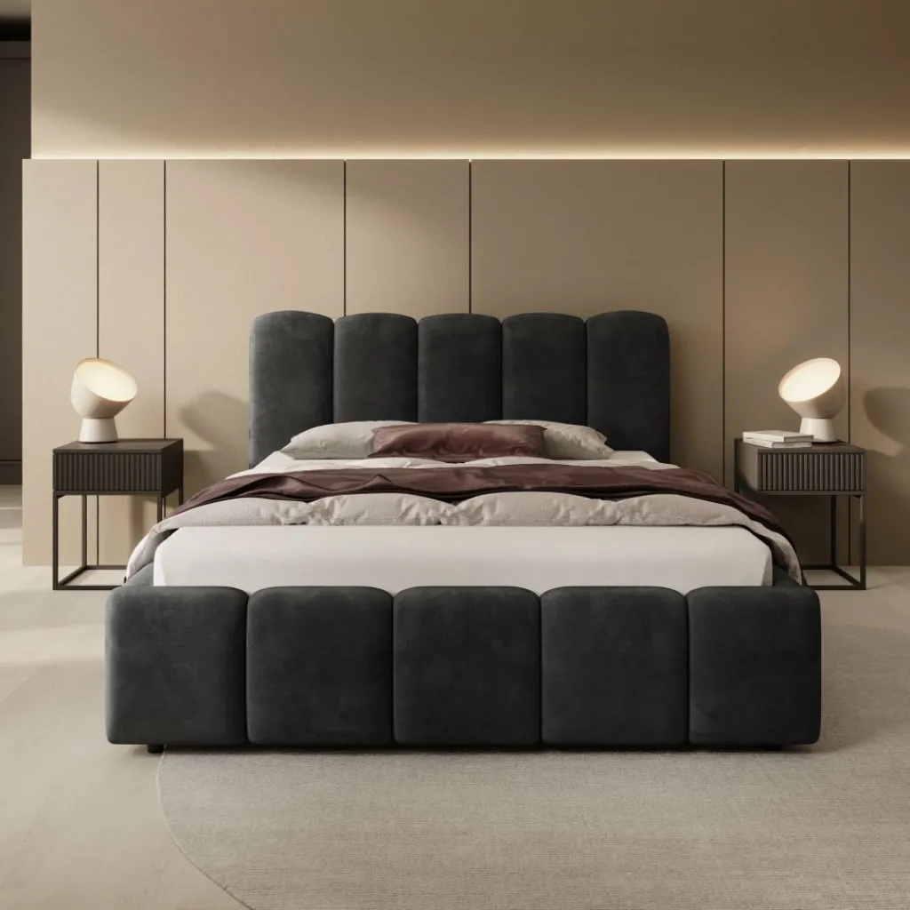 Tweepersoonsbed Nolena is bekleed met zwarte velvet stof en heeft een opvallend design met afgeronde vormen. Het hoofdbord en het bedframe zijn rondom voorzien van brede, gewatteerde panelen die zorgen voor een volle uitstraling.