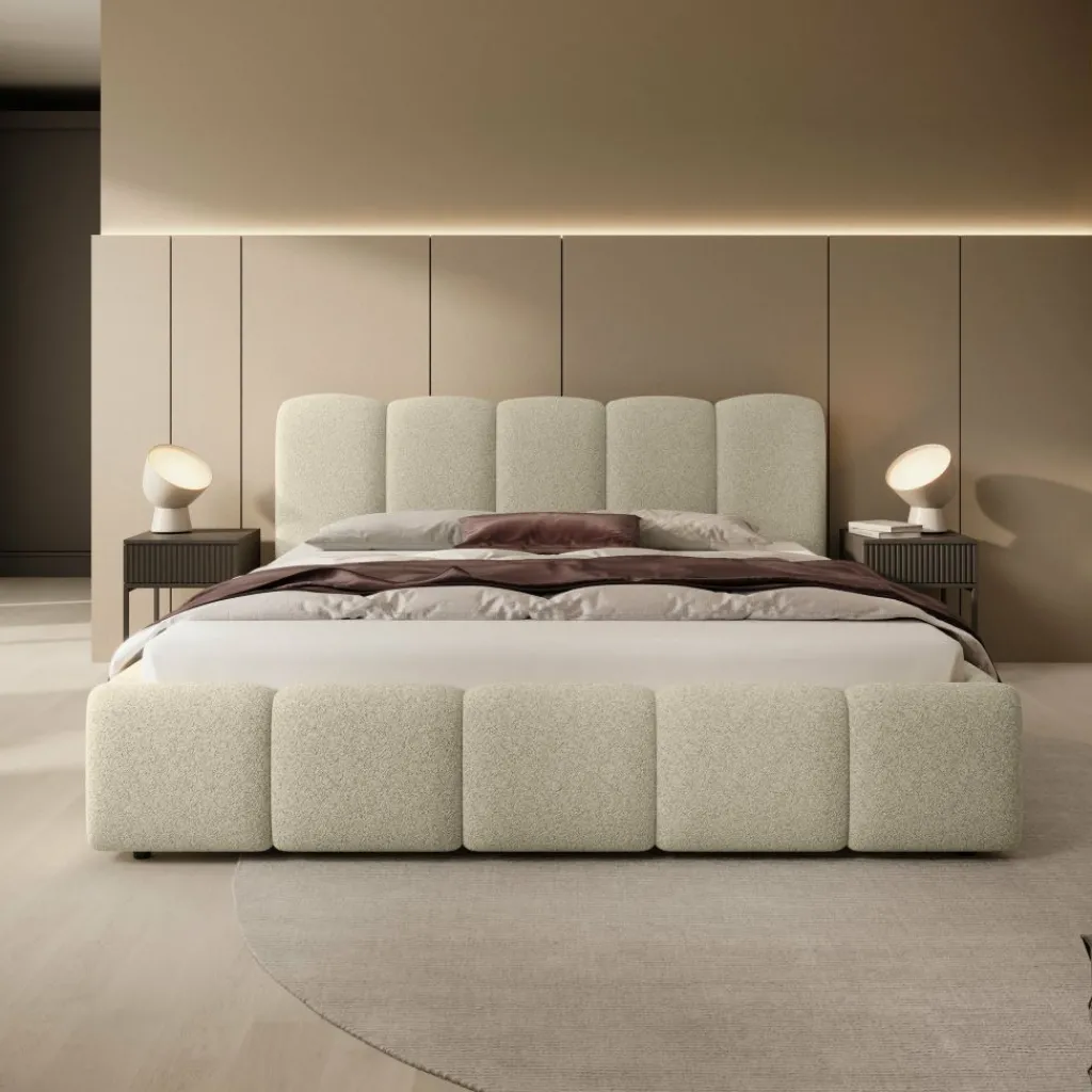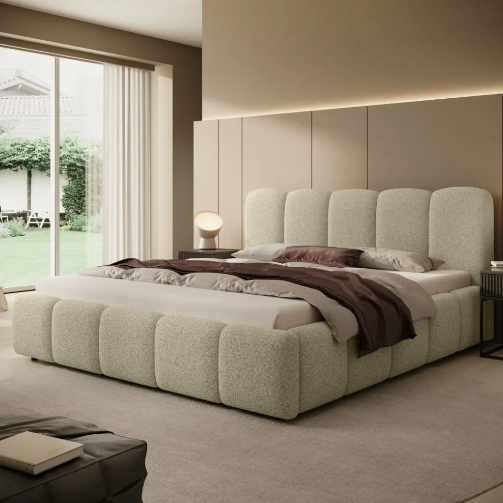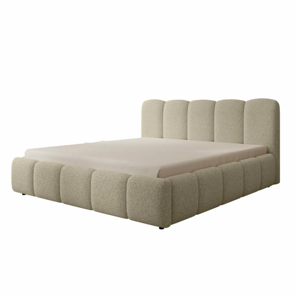 Tweepersoonsbed Nolena is bekleed met zachte beige stof en heeft een opvallend design met afgeronde vormen. Het hoofdbord en het bedframe zijn rondom voorzien van brede, gewatteerde panelen die zorgen voor een volle uitstraling.
