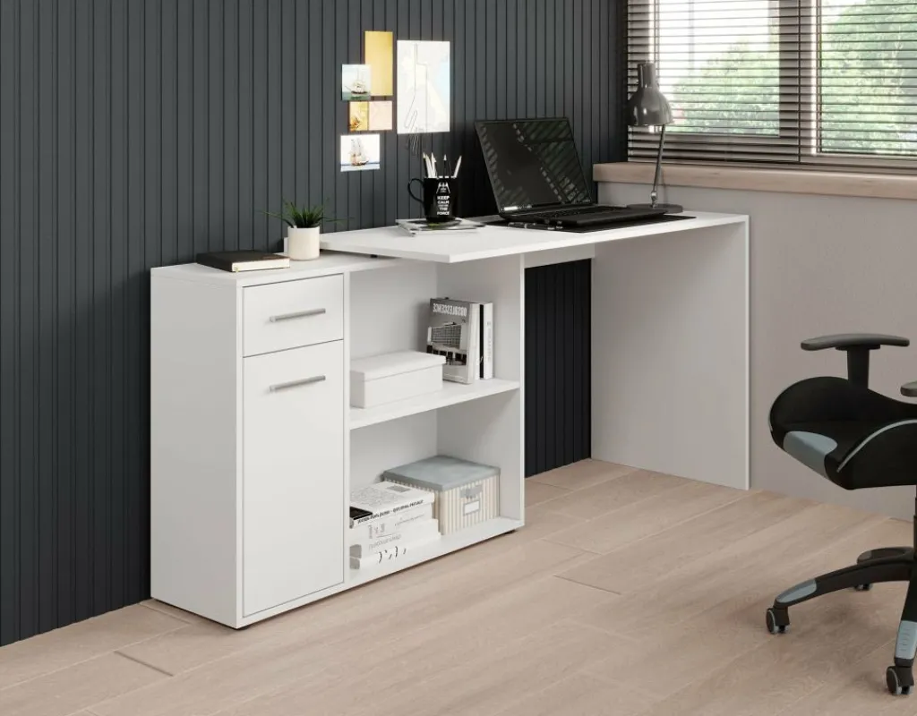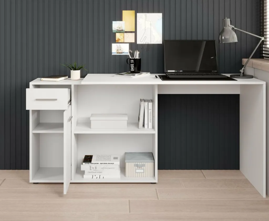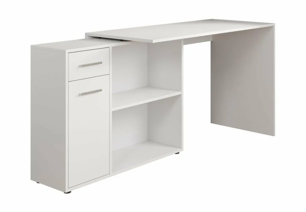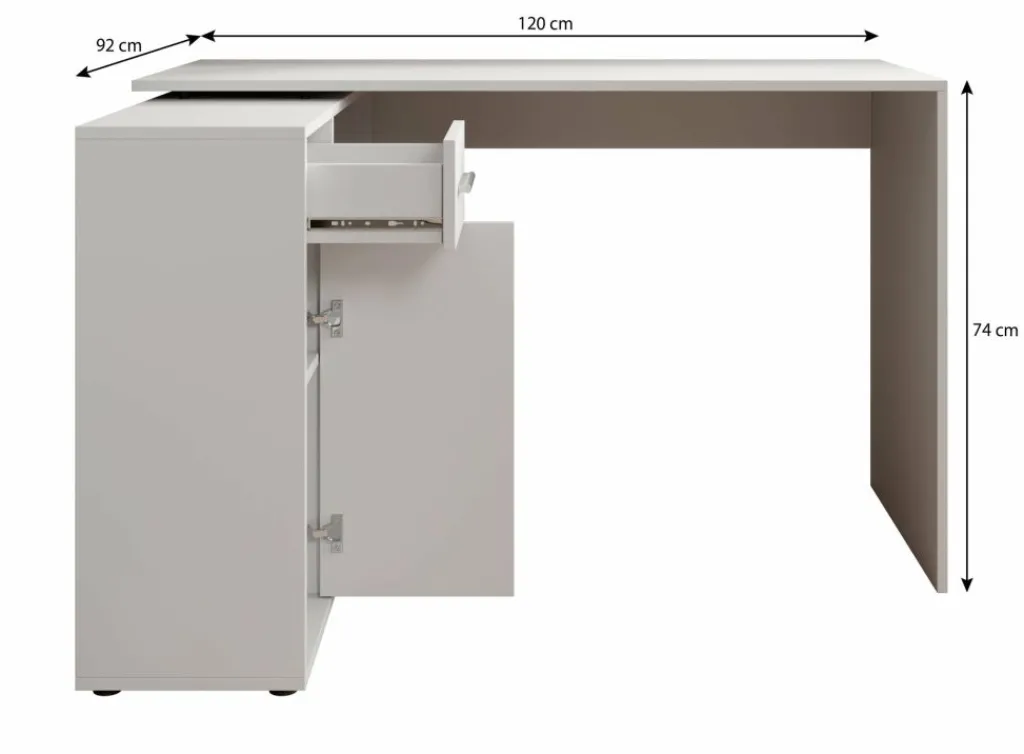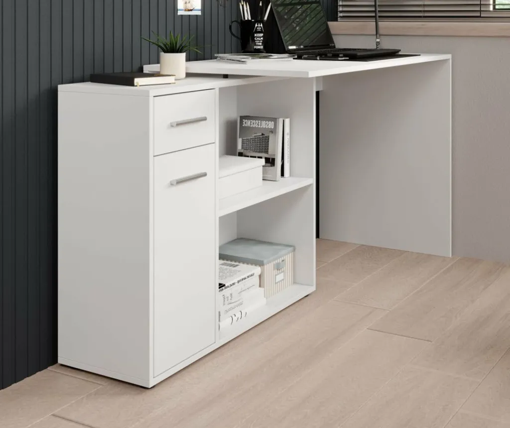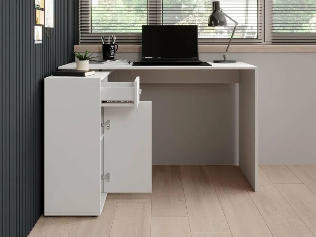 Het bureau beschikt over 1 lade en 1 deur, die je opent met grijze handgrepen. Daarnaast bevinden zich 2 open vakken. De module met opbergkasten is van positie te veranderen: plaats deze recht naast het blad, of schuin voor een hoekbureau.