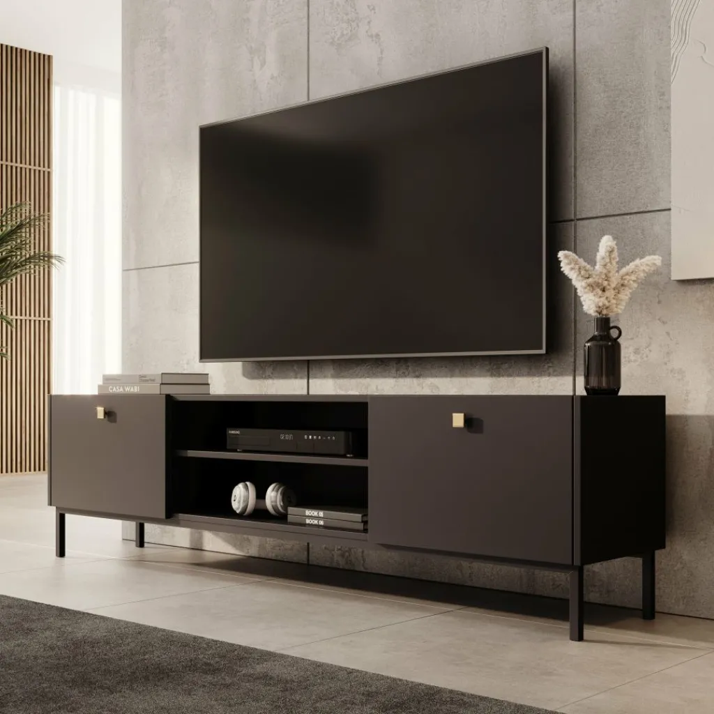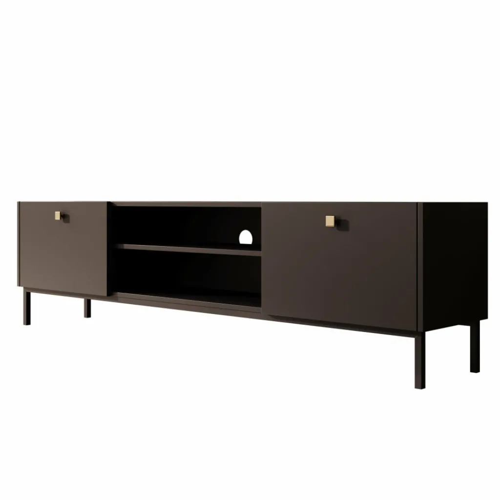 TV-Meubel Norment is een opbergkast voor onder de tv en staat op metalen poten. De TV-kast is gemaakt in een zwarte kleur. TV-Meubel Norment beschikt over 2 kleppen die openen met een goudkleurige handgreep. Tussen de kleppen zitten nog 2 open vakken. In de achterwand zit 1 uitsparing om bedrading te kunnen wegwerken.