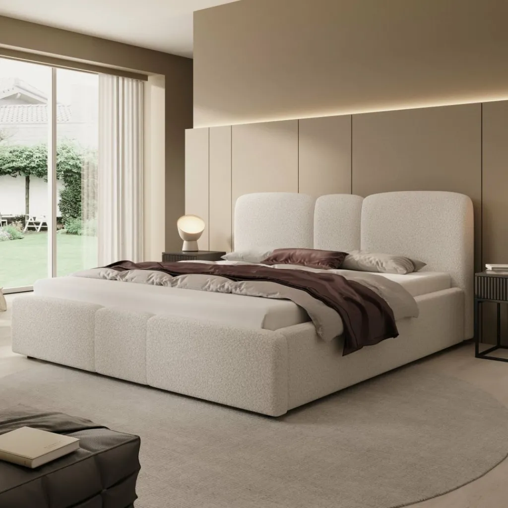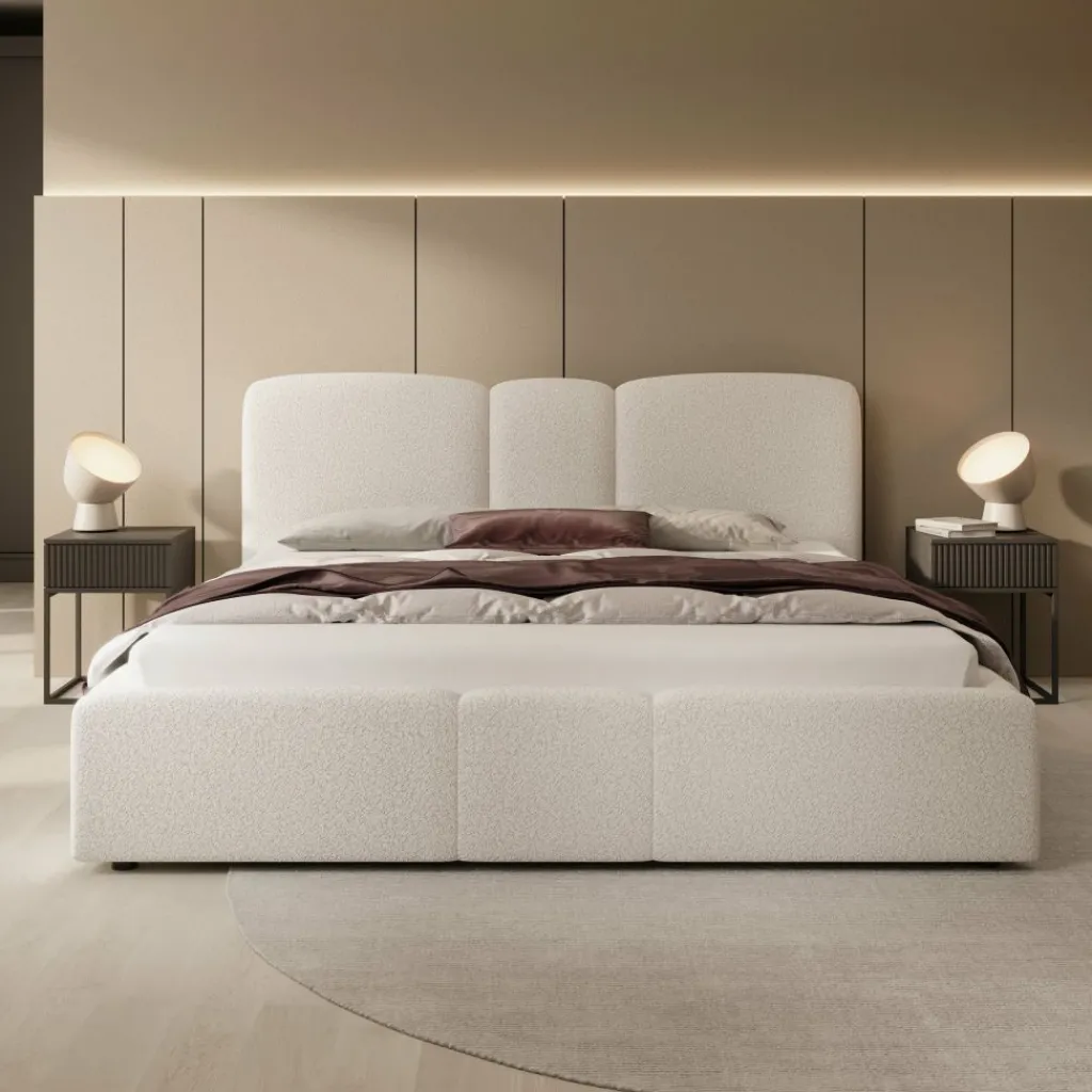 Het bed is bekleed met beige teddystof en heeft een hoofdbord met drie afgeronde, gestoffeerde panelen. Ook het voetbord heeft een afgeronde vormgeving, wat zorgt voor een samenhangend geheel. De combinatie van de bekleding en de afgeronde vormen geeft het bed een moderne uitstraling.